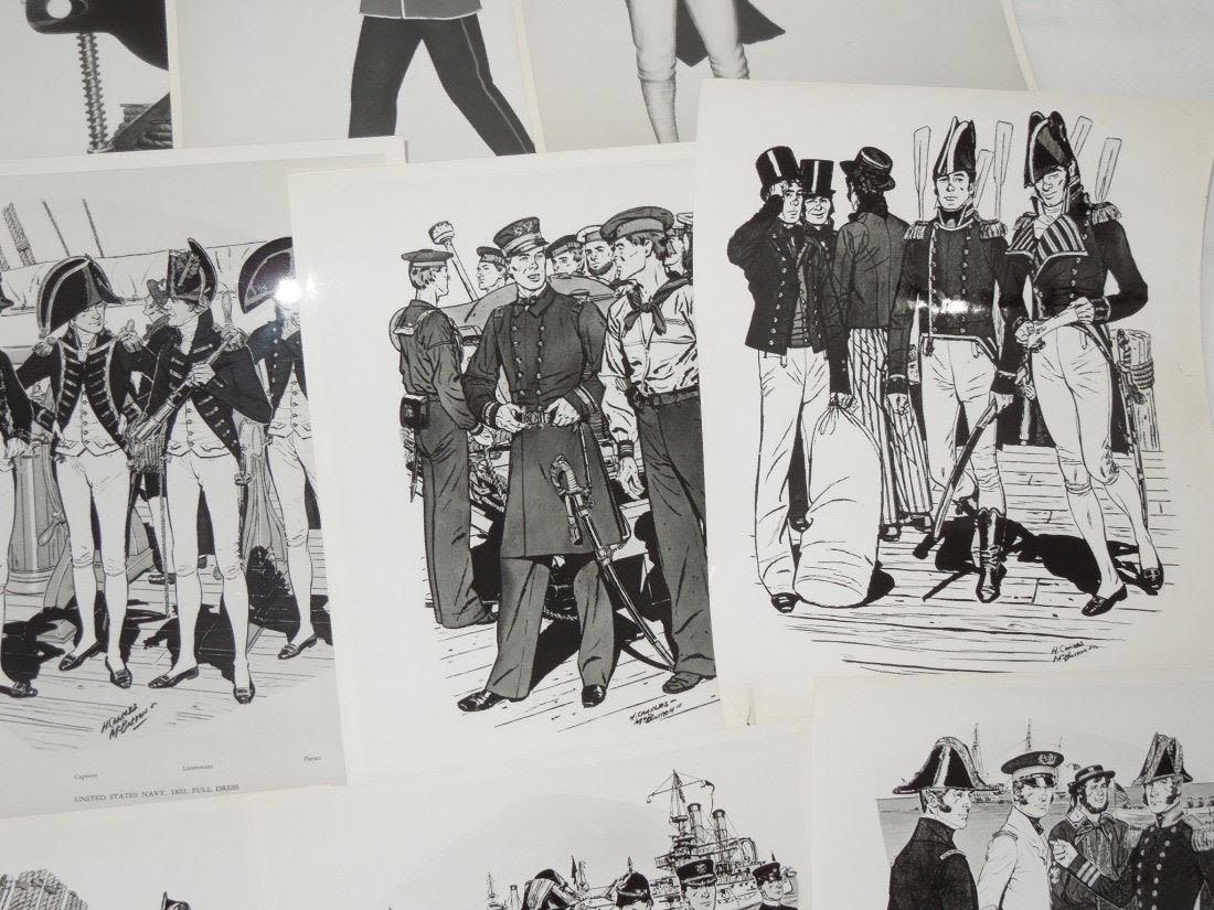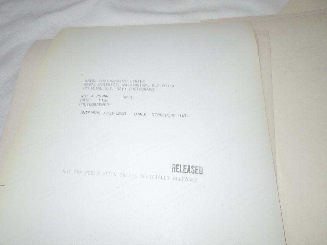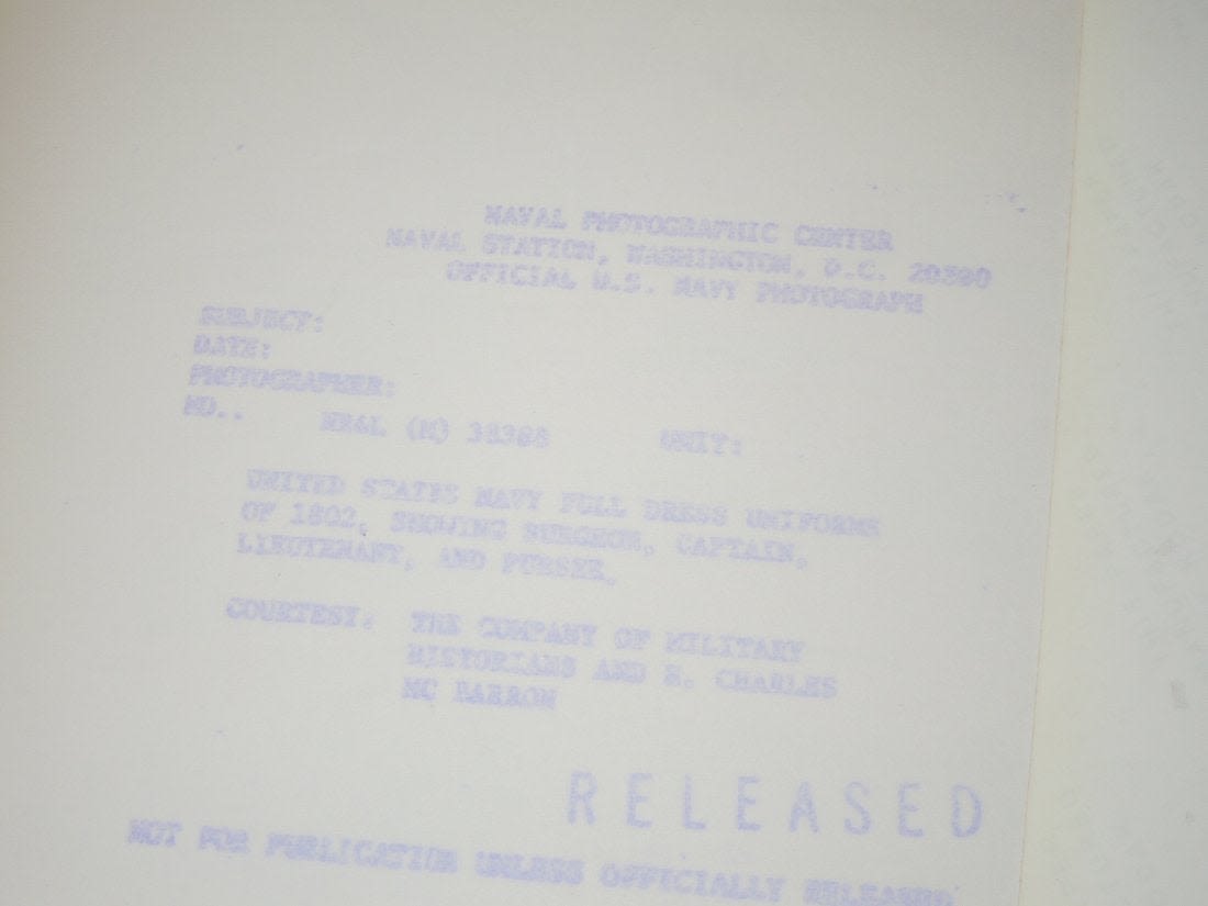 Official USN Navy Naval Uniform Photos Lot of 24. Some of the descriptions include the following: 1776-1777 Continental Navy Uniforms, 1790 – 1810 Captain Beveridge Officer Sailor Military, Seaman McKewan, Chalk Stonepipe Hat, Sailing Master- Scafro, 1797 Navy Uniforms, 1810-1830 Master Mel Howard, Captain Frank Whittaker, 1802 Full Dress Uniforms, 1812-1815 Dress Uniforms of Naval Offices and Seaman, 1815 Boarding Party Naval War with Algiers, 1830-1841 Uniforms, 1852 Navy Uniforms, 1852-1855 Uniforms of a Midshipman, 1862-1863 Service Dress Uniforms, 1880-1900 Captain Don Brenon, Bandsman Paul Butler, 1898 Navy Uniforms, 1900-1920 Sailor Dick Bemusey, 1920-1945 Seamans. Size: 8 x 10 inches. Most photos have the actual government issued description. Some photos have the ‘Official U.S. Navy Photograph’.