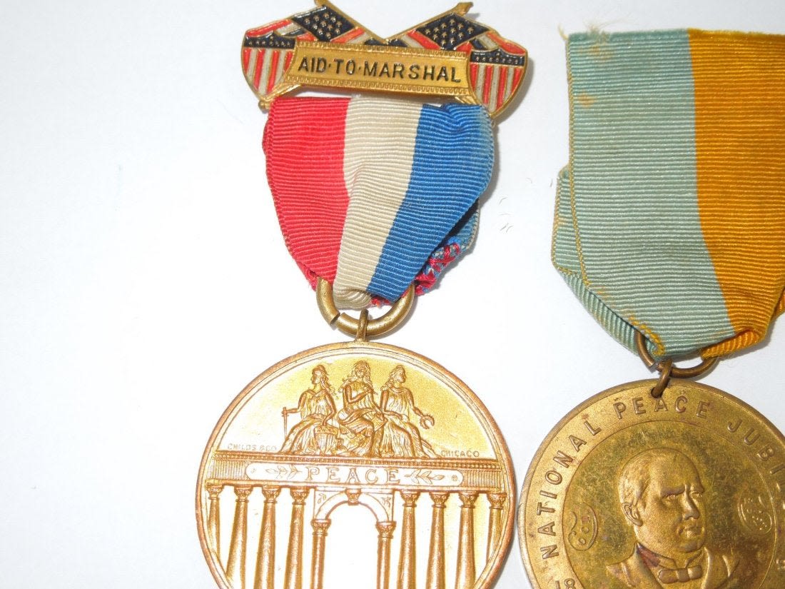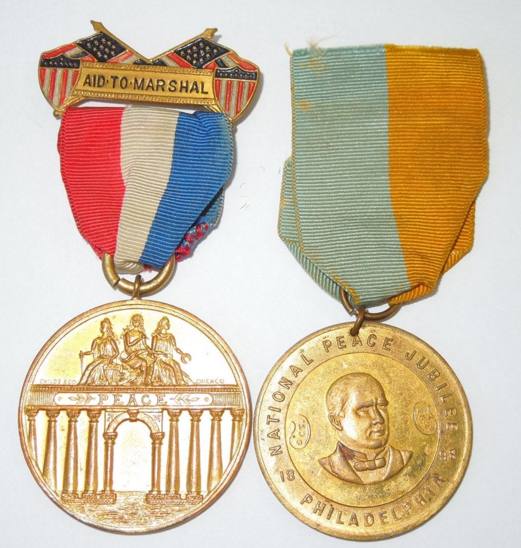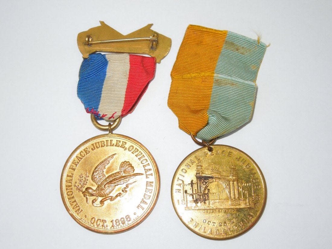 Spanish American War SAW 1898 Peace Jubilee Medals Ribbons. You will receive 2 medals. One medal is the National Peace Jubilee Official Medal Oct. 1898, Aid To Marshal. Nice condition for its age. The other medal is the 1898 National Peace Jubilee Philadelphia Oct. 25-27. This medal appears to be missing the pin at the top. Ribbon is worn.