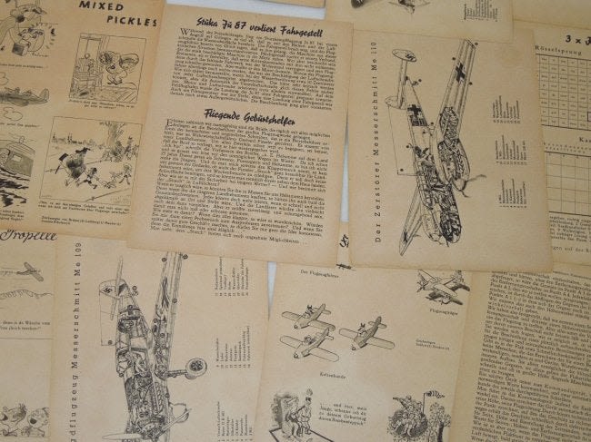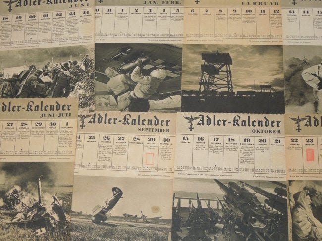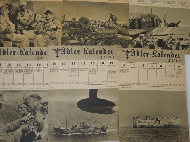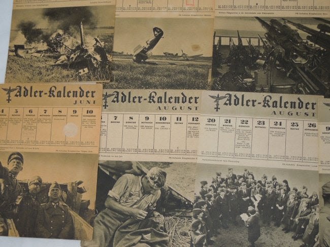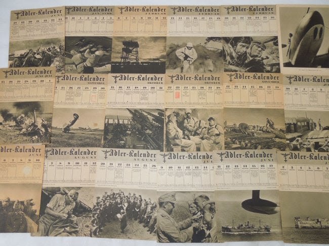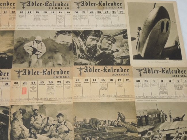 WWII German Wehrmacht (Armed Forces) Adler Kalendar 1944 Lot #1. Adler Kalendar translates to ‘Eagle Calendar’. There are 18 pages / pictures from different months. Excellent pictures and information Size: 6 x 8 inches