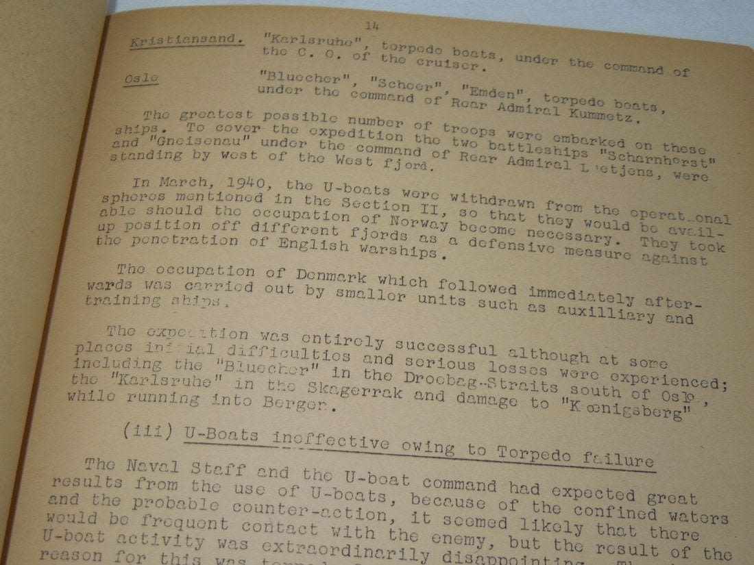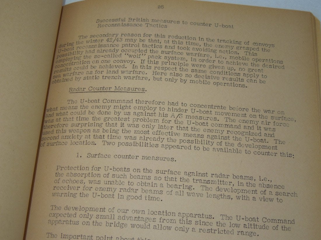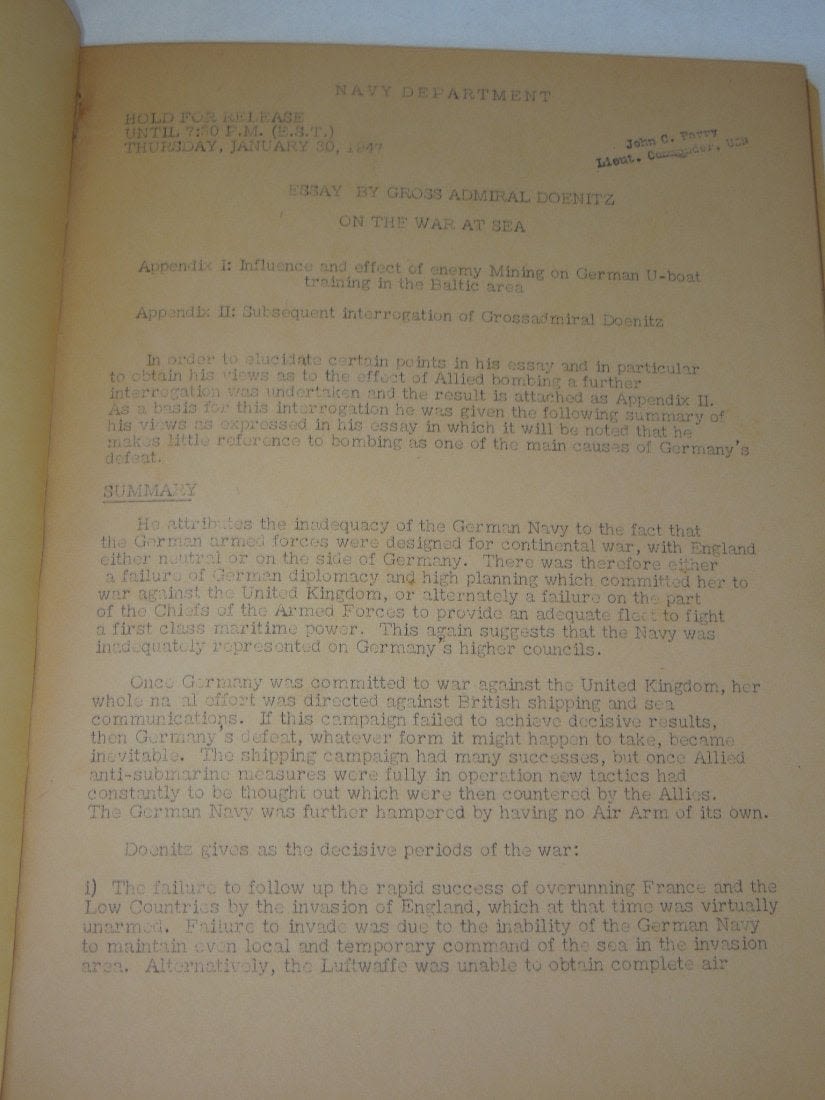 1947 Report The War At Sea by Gross Admiral Karl Doenitz. Essay By Gross Admiral Doenitz On The War At Sea. This copy comes with an Interrogation (Translation) Covering All Phases Of Operations, 1939-45. Declassified and distributed by the Navy Department on January 30, 1947. Appendix I: Influence and effect of enemy mining on German U-Boat training in the Baltic Sea. Appendix II: Subsequent Interrogation of Grossadmiral Doenitz. Pages: 51. Stamped on the first page is the owner: John C. Parry, Lieutenant Commander, USN. Very good condition for its age.