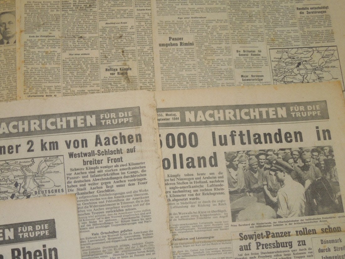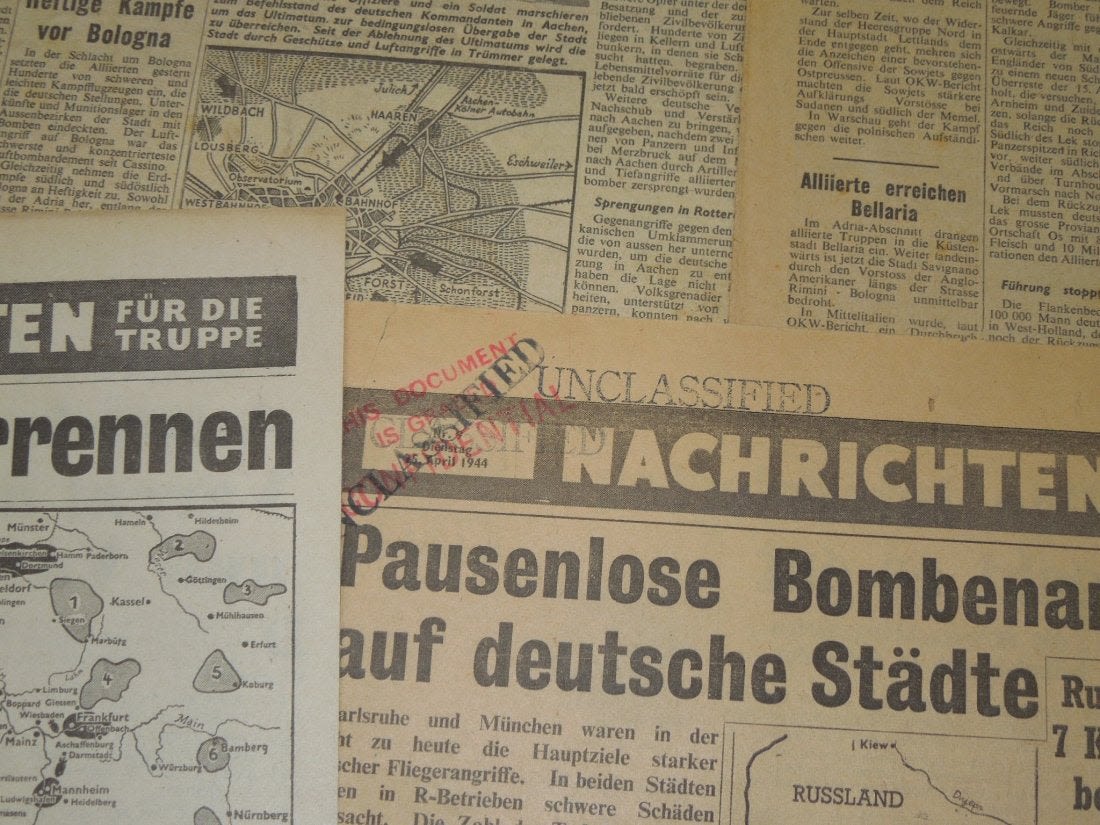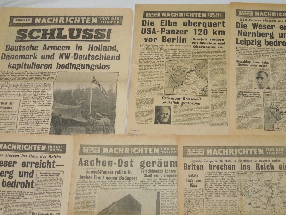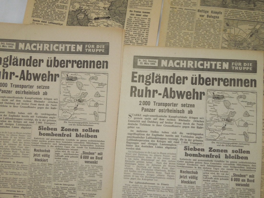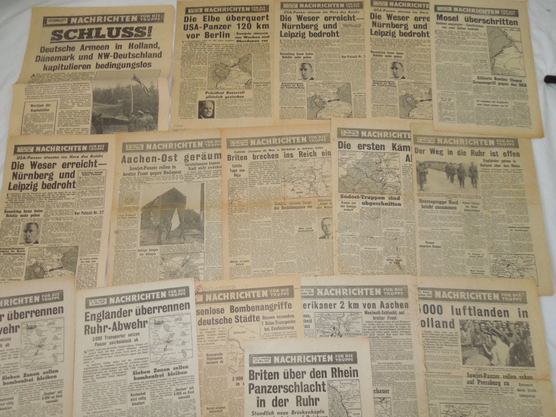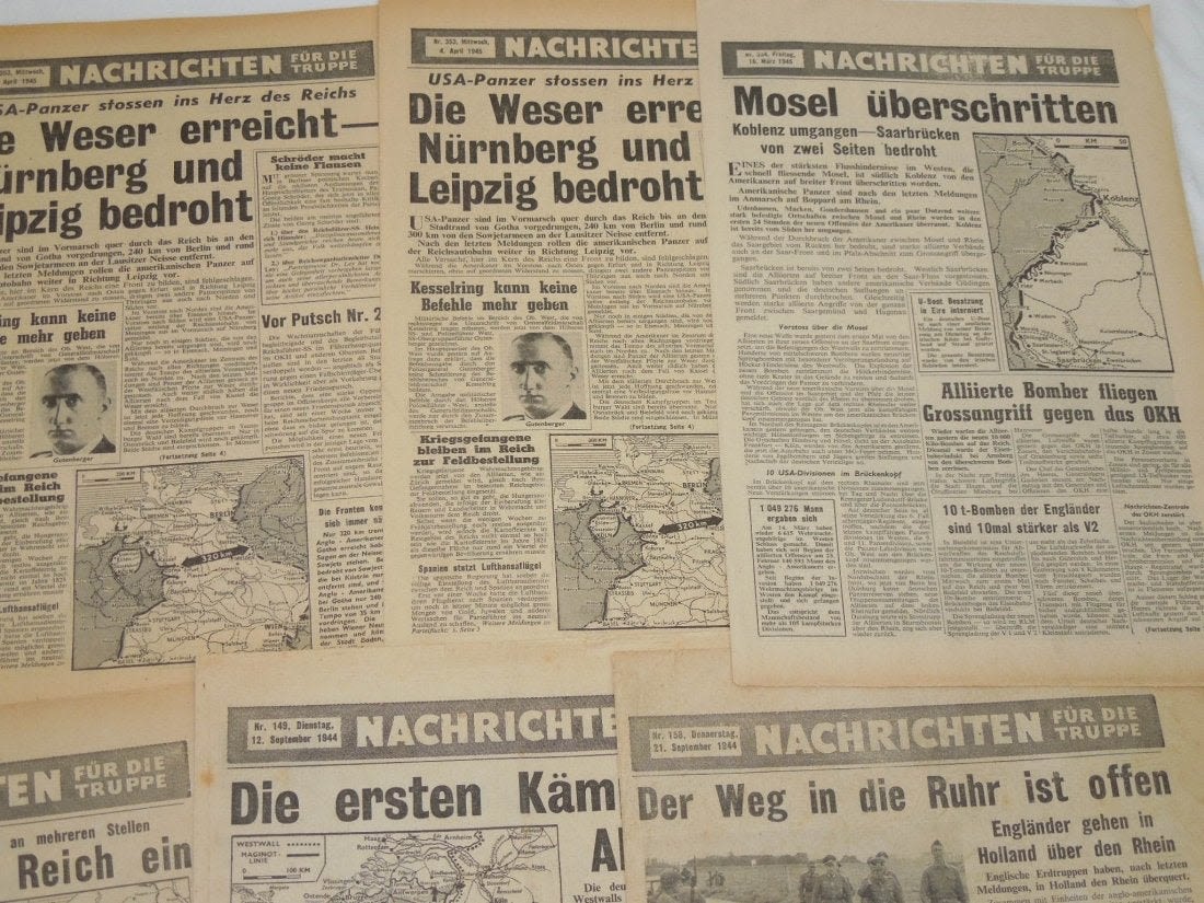 Lot of 16 captured Nachrichten German newspapers from 1944 – 1945 about various military topics. One is stamped as unclassified.