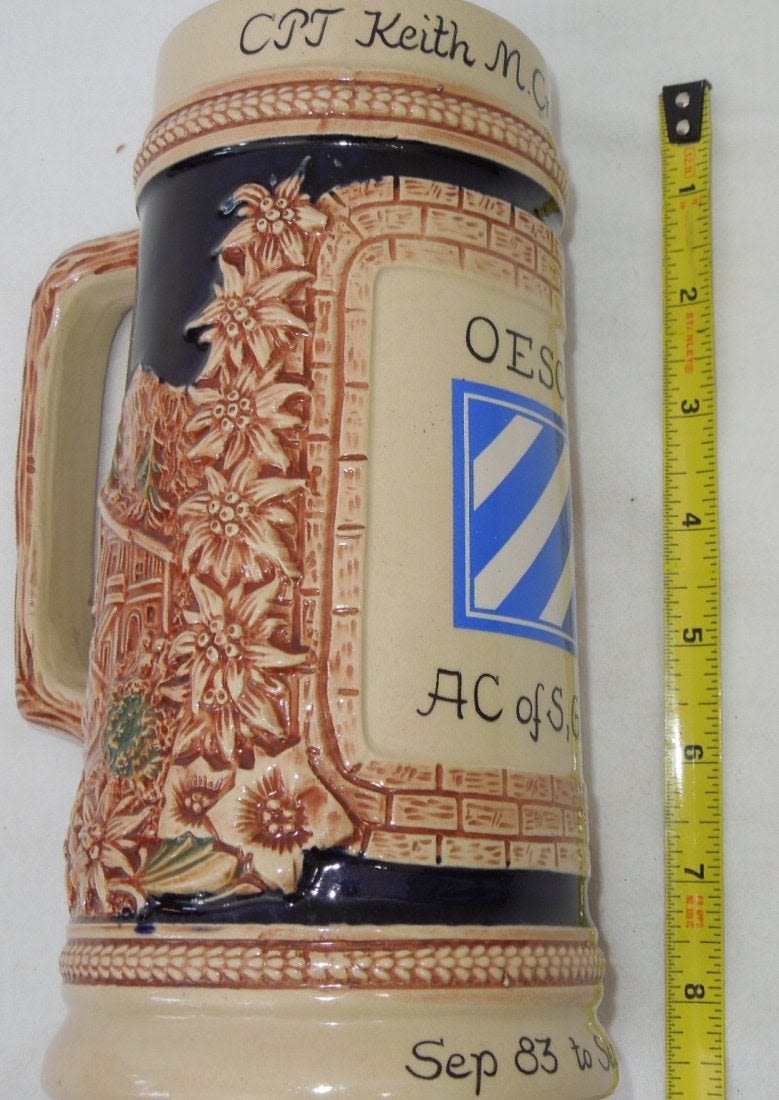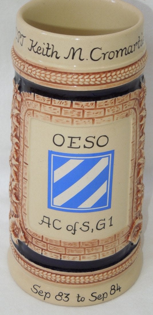 Circa 1984 German made beer stein belonging to Keith M. Cromartie, who was a Lt. Colonel some years later. The stein has the 3rd Infantry Division patch, Assistant Chief of Staff G-1 and OESO on it. It is West Germany / Gerzit maker marked on the bottom.