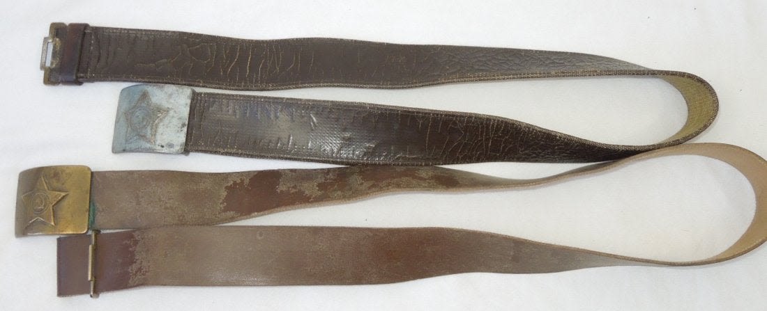 Original Soviet Army belts that were found by the consignor in Afghanistan while he was stationed there. These likely date from the Soviet Occupation there in the 70s and 80s.