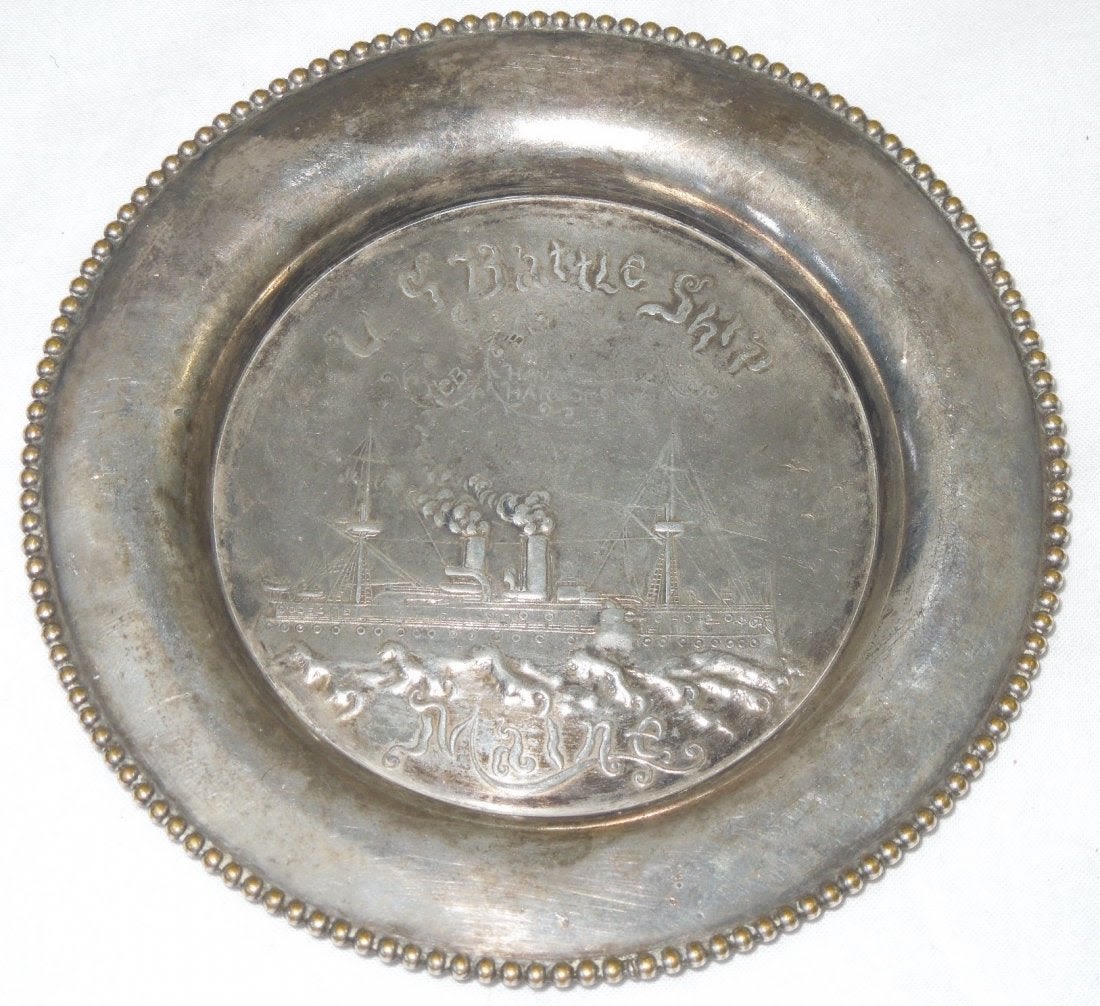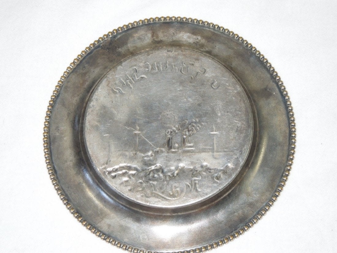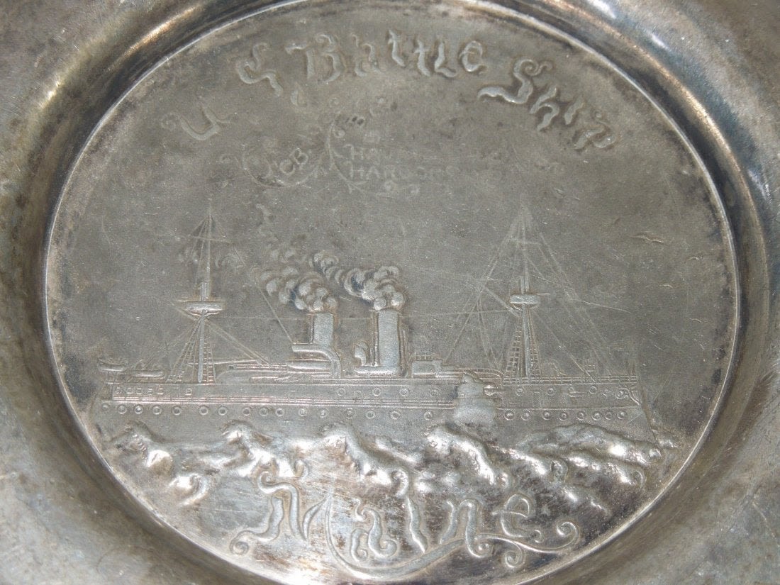 Spanish American War SAW U.S. Battleship Maine Metal Ash Tray. Silver in color. Marked Quadruple Plate / Poole Silver. Size is 5.5 inches in diameter. Nice used condition.