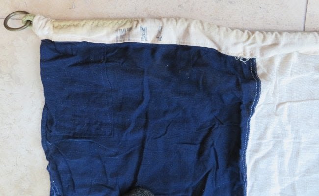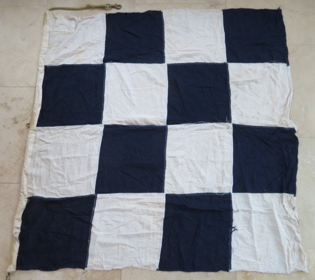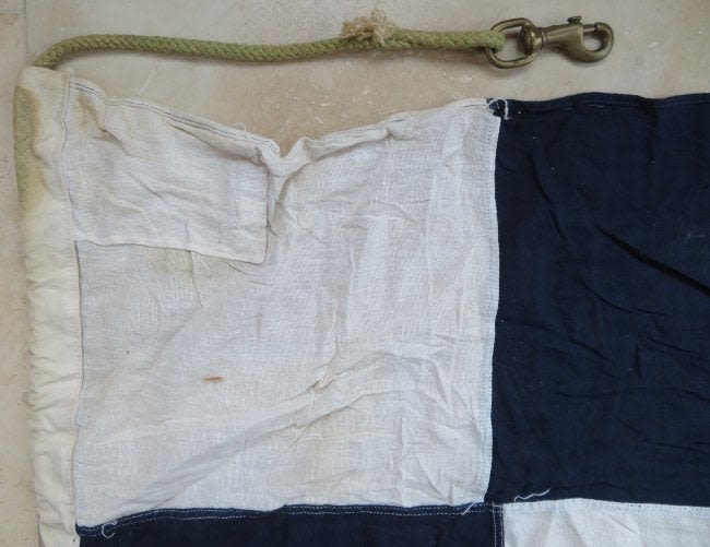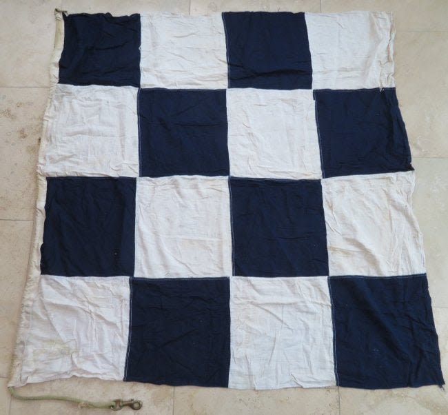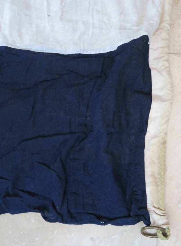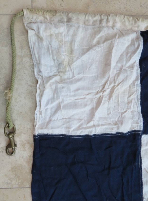 Maritime Nautical Flag November "N" No. Vintage Cotton Navy Maritime Ship’s Signal Flag. Design is sewn with rope and brass hardware. This flag is used and has the look of having been out in the water. Approximate Size: 51 x 51 inches. Condition: Wear from age and use. See pictures for condition details and imperfections.