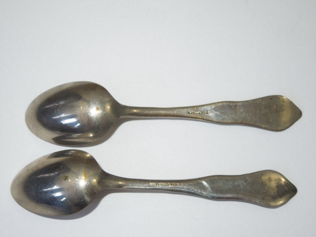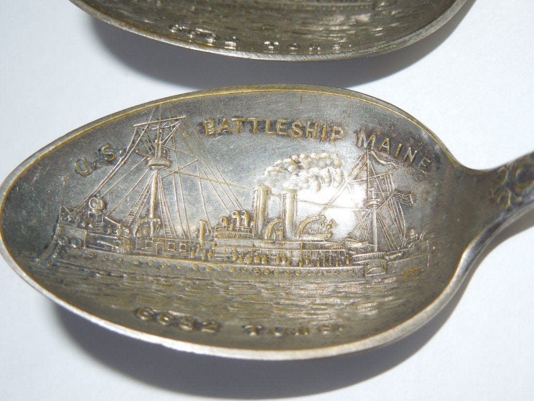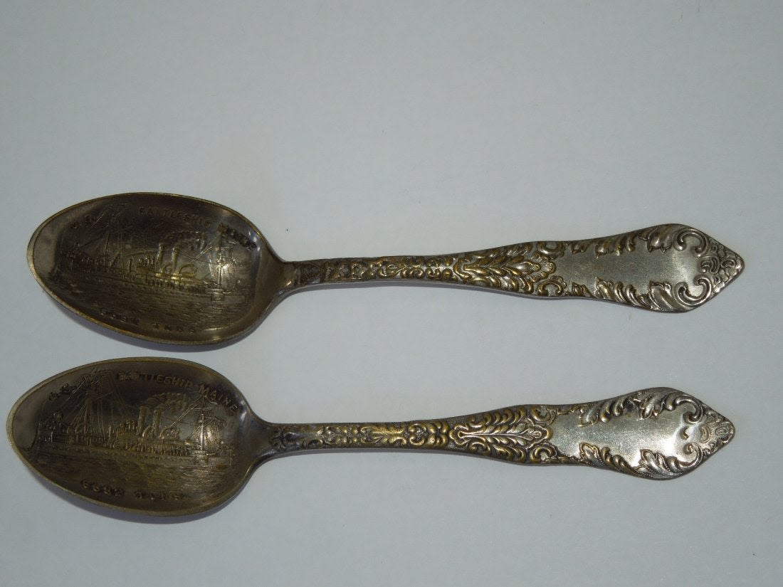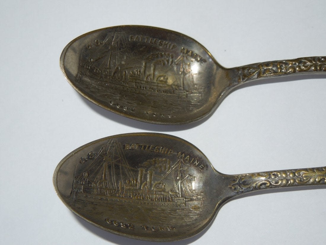 Spanish American War SAW US Battleship Maine Spoons. You will receive 2 spoons. One spoon is marked Standard on the back and the other is marked Sheffield Plate Co. Both are in good condition.