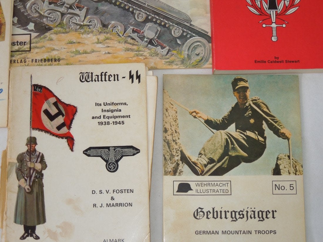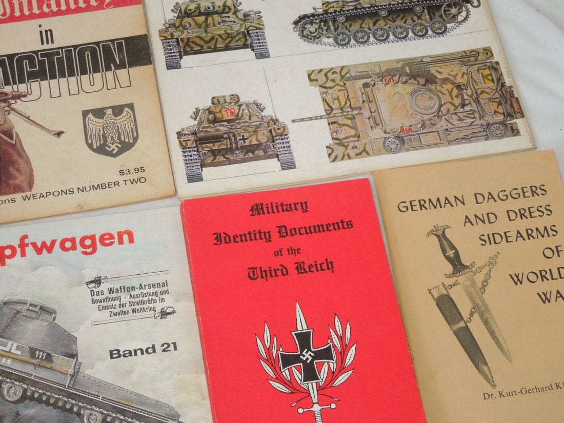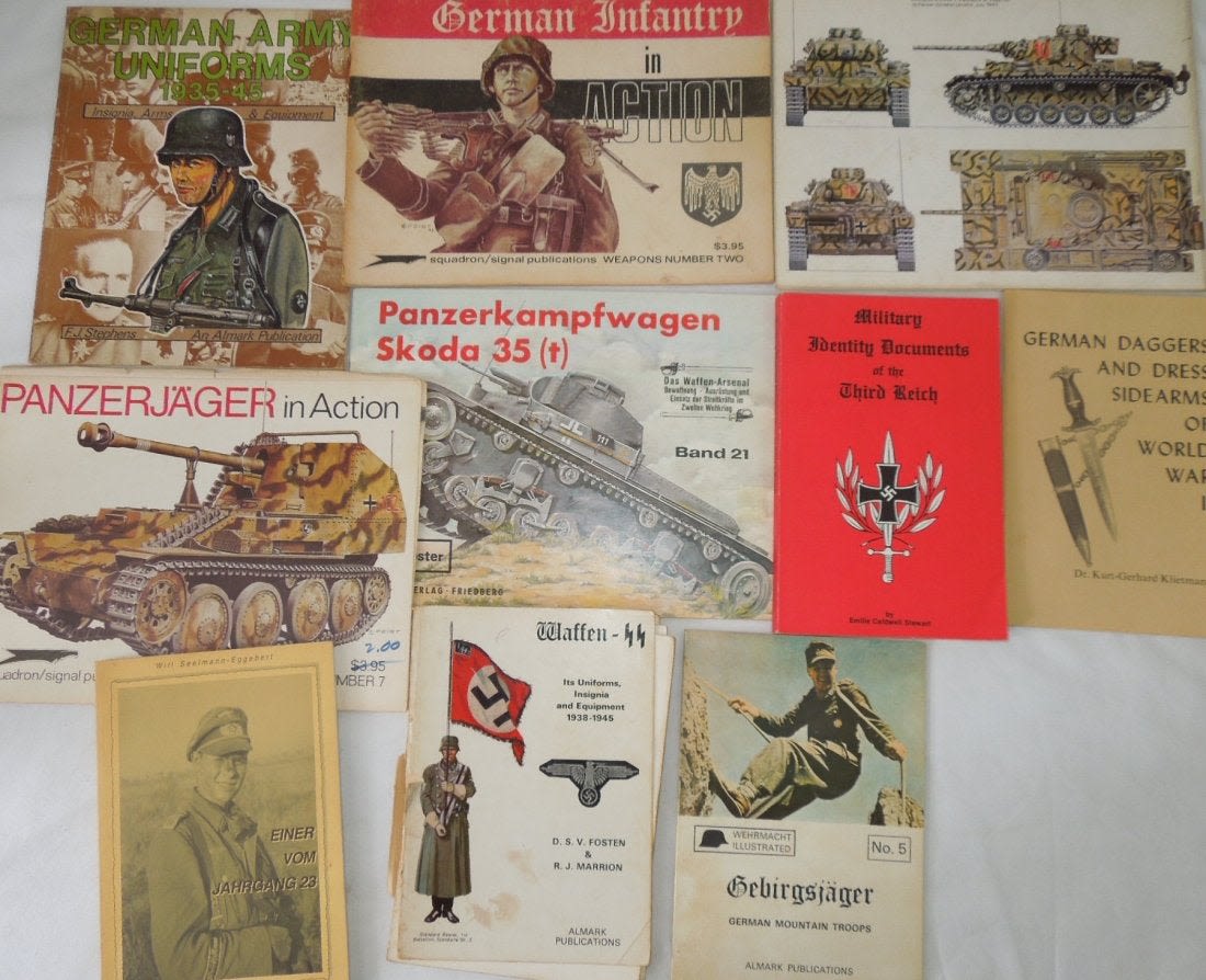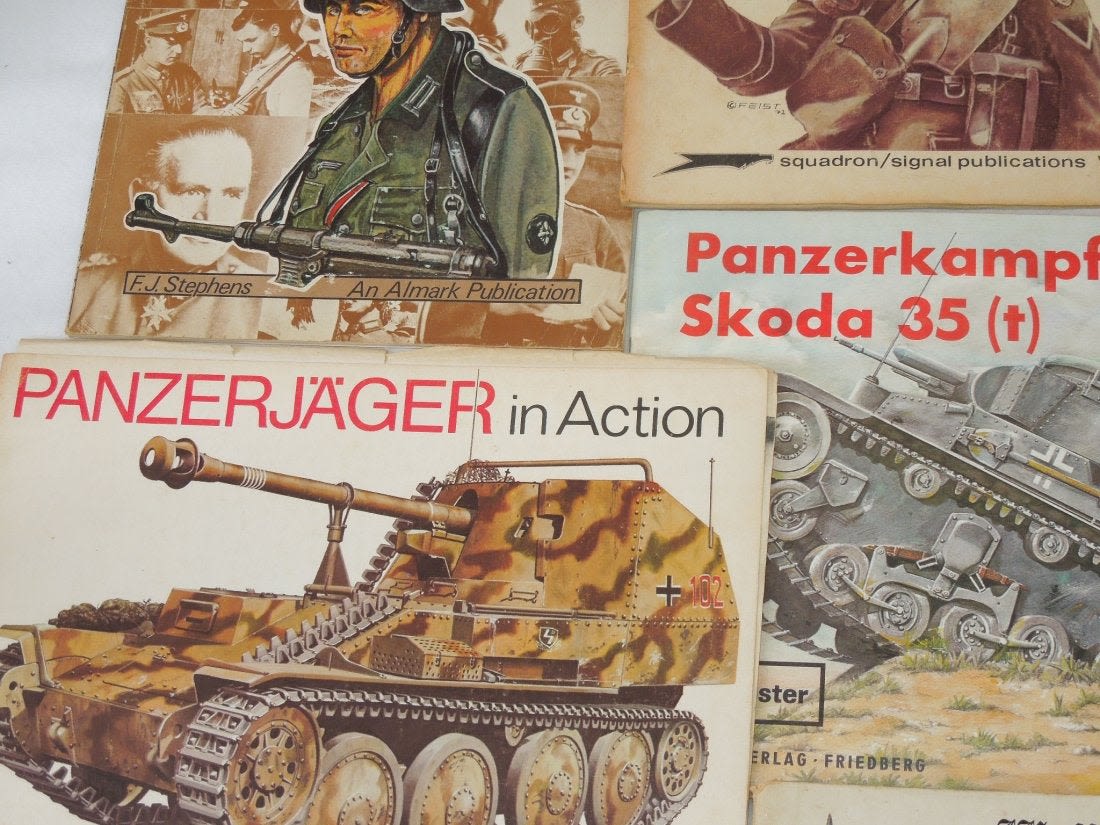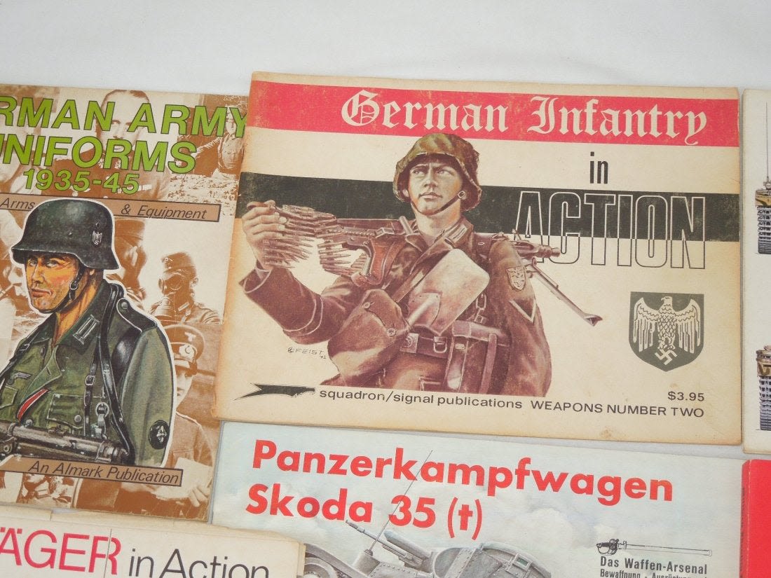 Lot of 10 different reference books from the late 20th century dealing with various aspects of the WWII German military. Soft cover, and mostly in good useable condition.