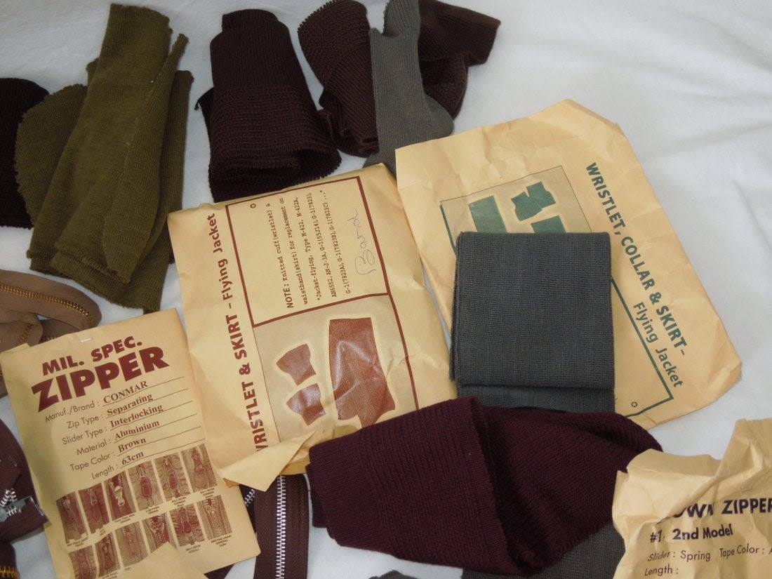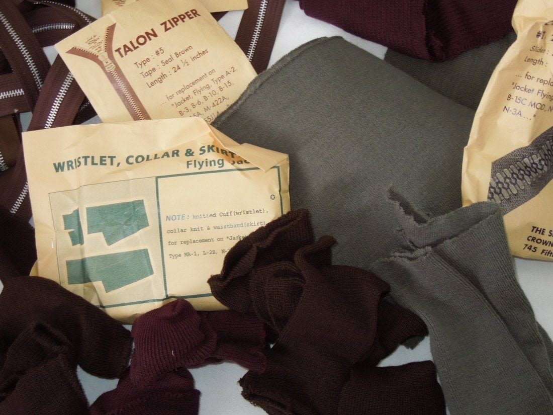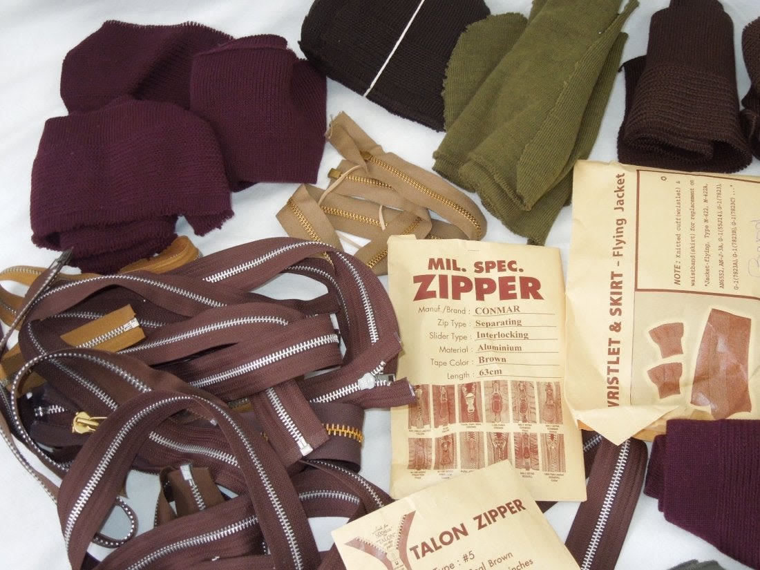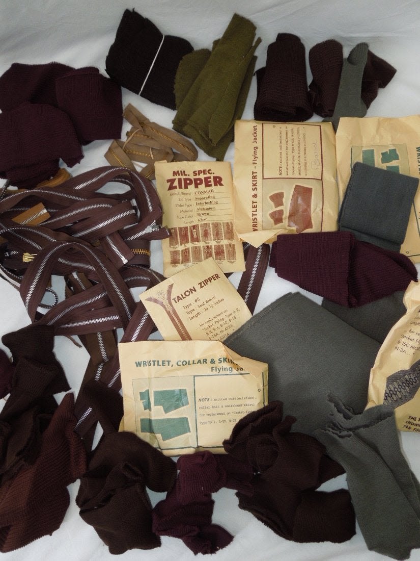 Large collection of new or new old stock zippers, cuffs, and fabric for use in repairing US flight jackets of WWII through the 70s.