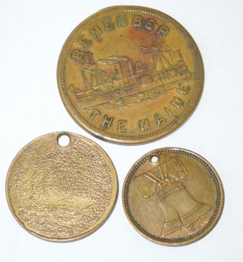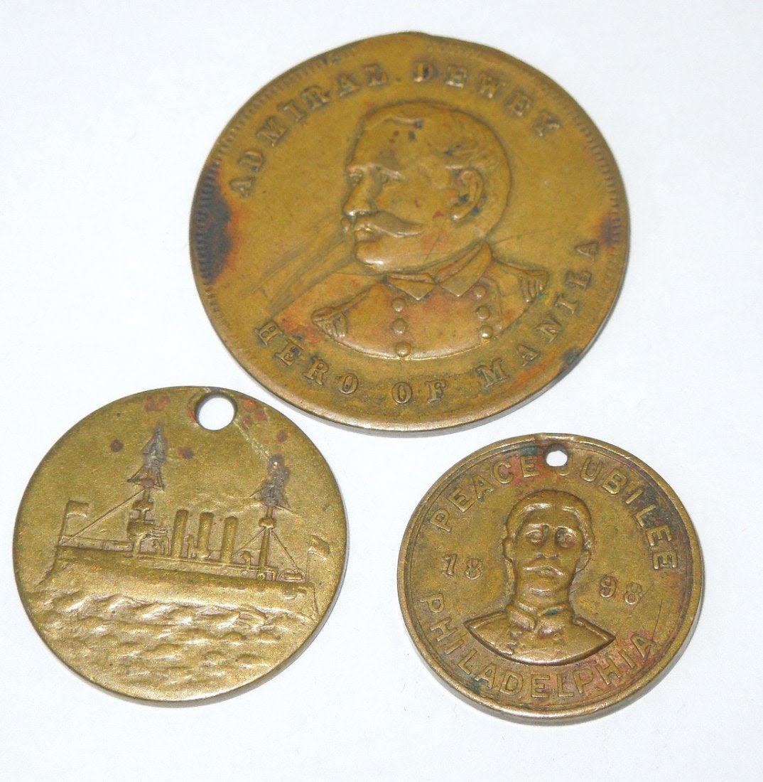 Spanish American War SAW Admiral Dewey Remember The Maine Coins. You will receive 3 coins. One coin depicts Admiral Dewey on the front with the words of Hero of Manila. The reverse of the coin is a picture of the USS Maine and the words, Remember The Maine. The second coin depicts a picture of the Maine. There is nothing on the reverse that can be deciphered. The third coin shows the likeness of Admiral Dewey. It reads on the front, Peace Jubilee Philadelphia 1898. The reverse of the coin pictures the Liberty Bell. Two of the 3 coins have a hole at the top.