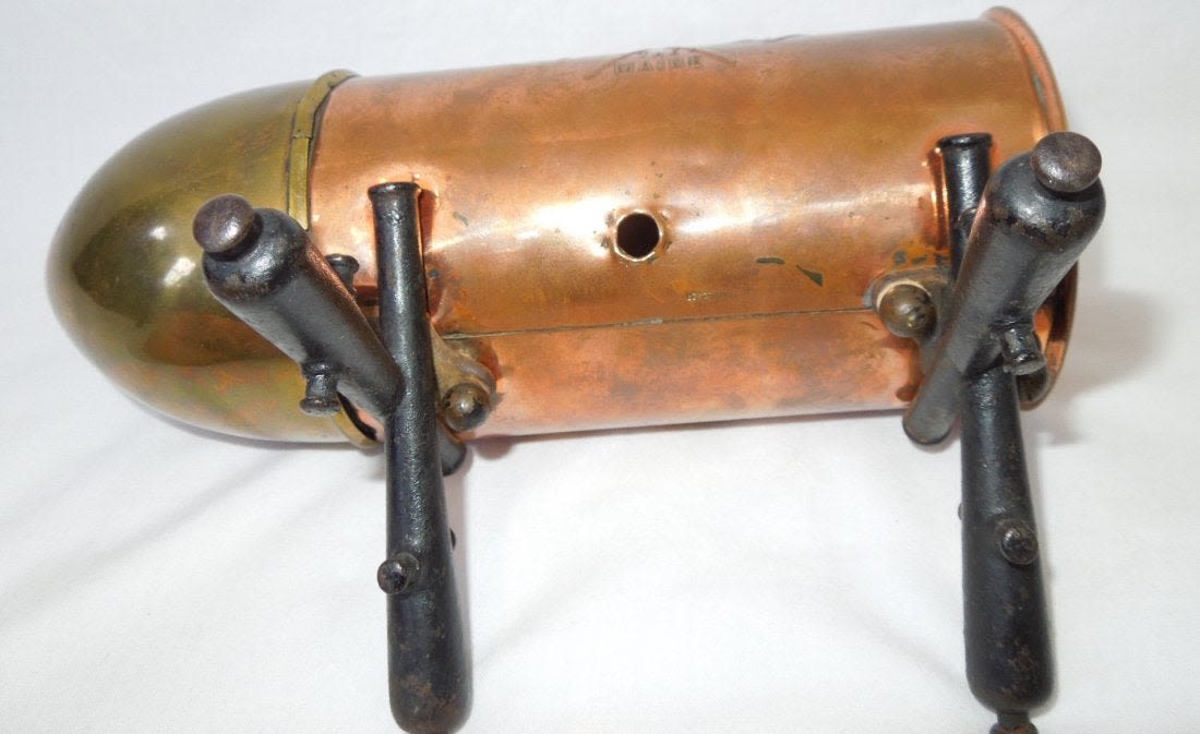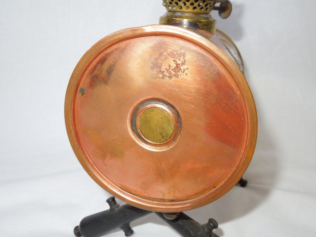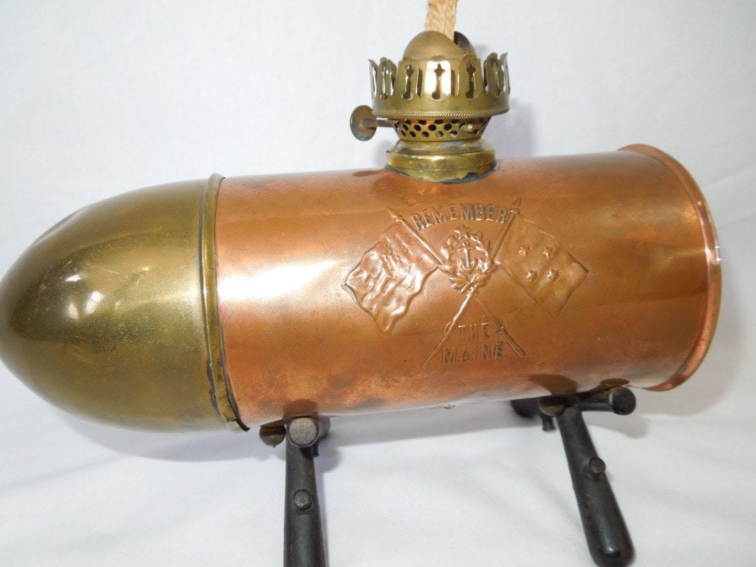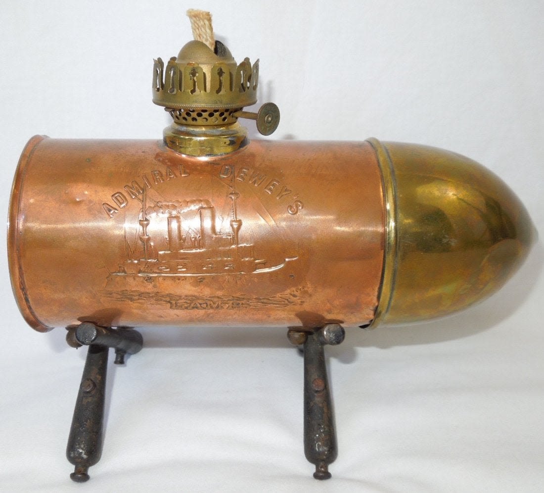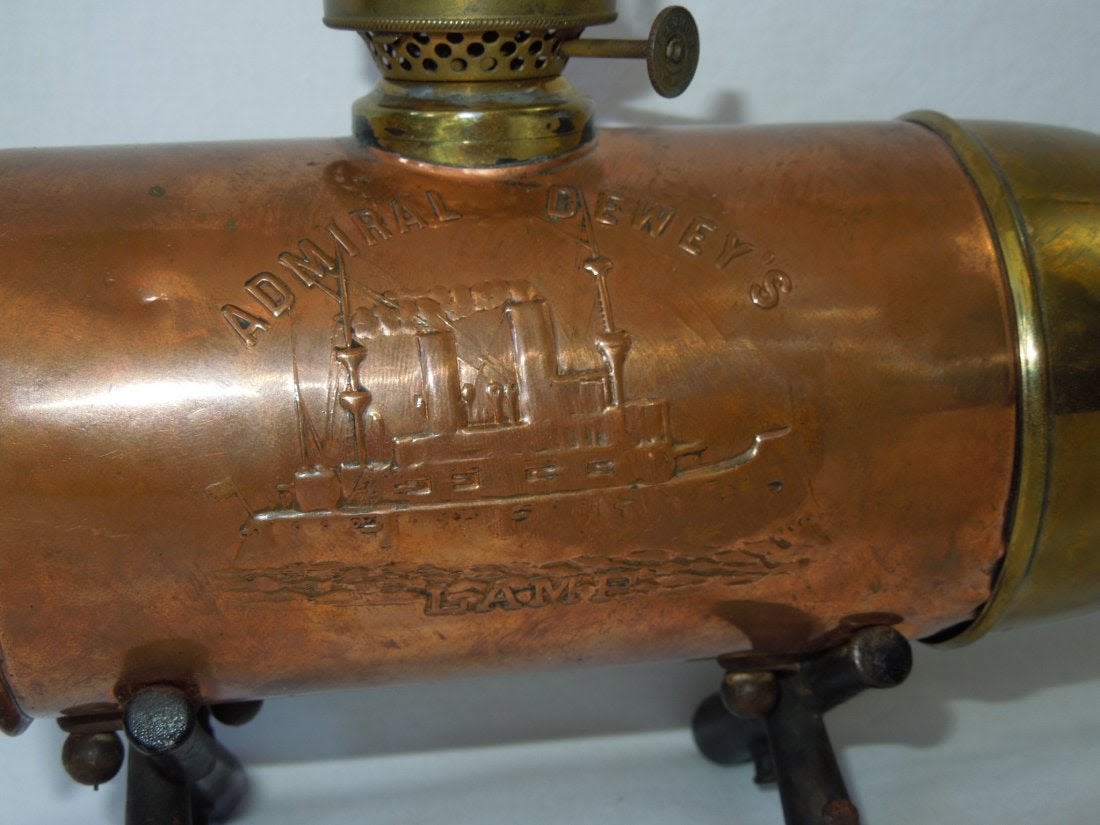 Spanish American War SAW Admiral Dewey Remember the Maine Oil Lamp. Admiral Deweys Lamp with the slogan Remember the Maine on one side, a depiction of a battleship USS Maine on the other. Measures approximately 9 inches long and 7 inches tall. Condition is used. Also, a hole was drilled in the bottom side most likely to run the lamp with electrical wiring. A shade did not come with this lamp and is not included with this item.