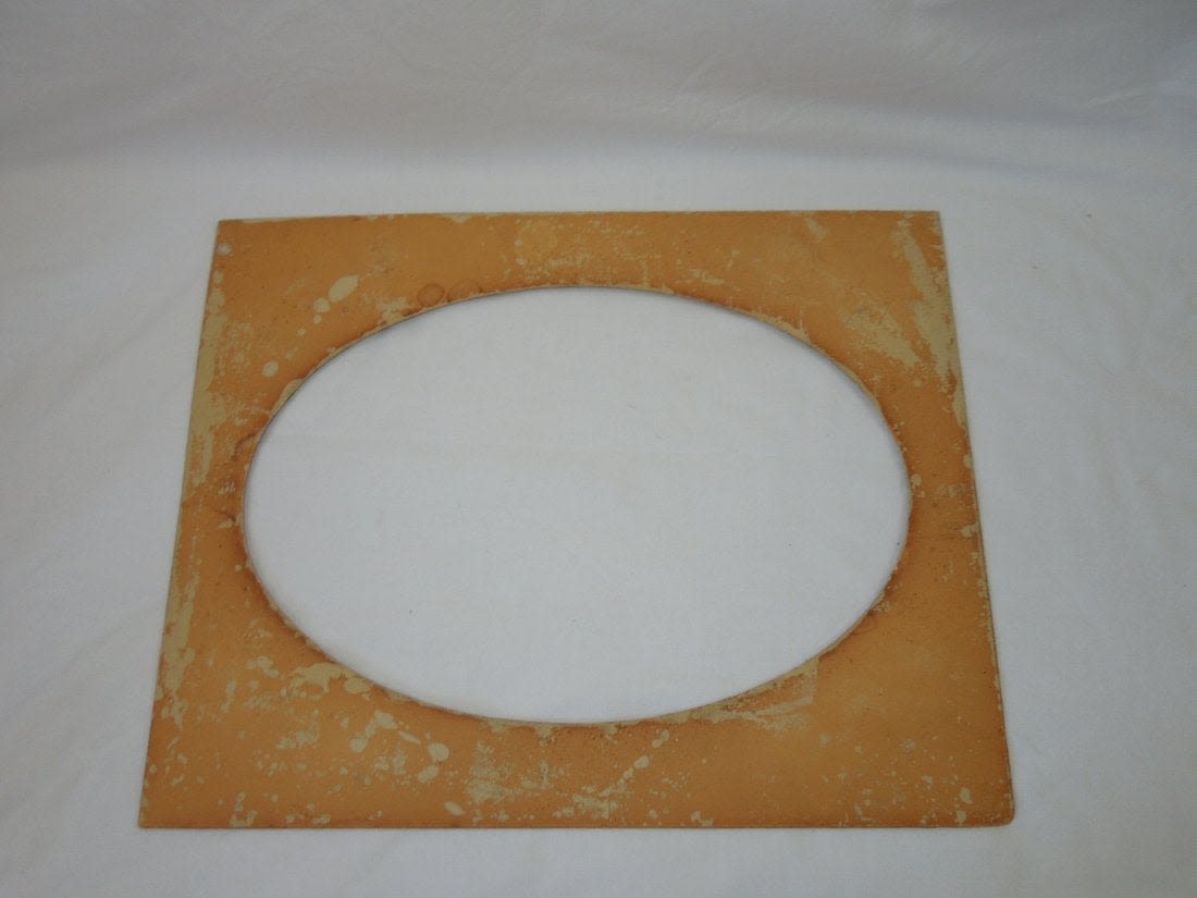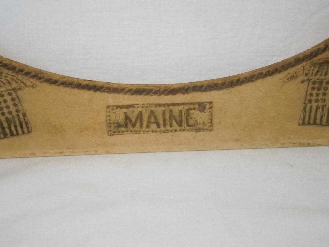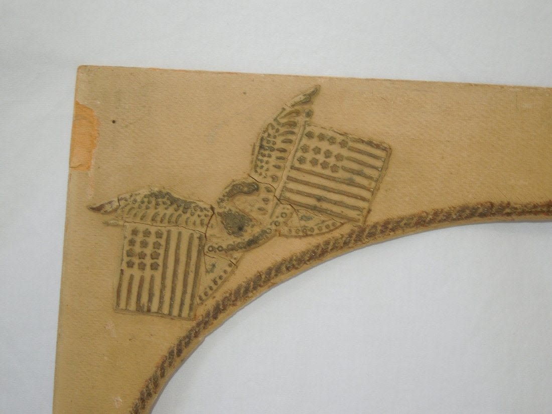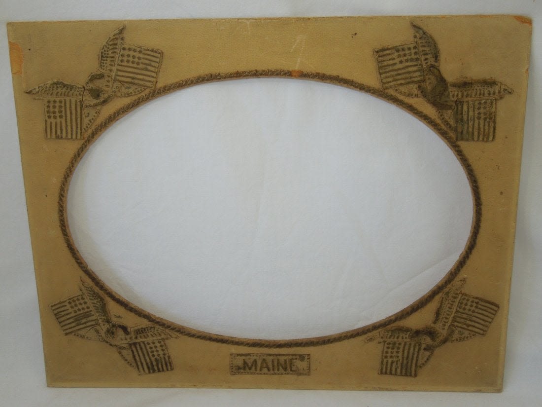 Spanish American War SAW USS Maine Picture Frame. Excellent raised patriotic flags around an oval shaped frame. The frame itself is made from a heavy cardboard material. The size is 15.75 x 19.75 inches. The corners are dinged. Also, on the left side is missing a piece of the frame. Wear and handling dirt from age. Otherwise a nice piece.