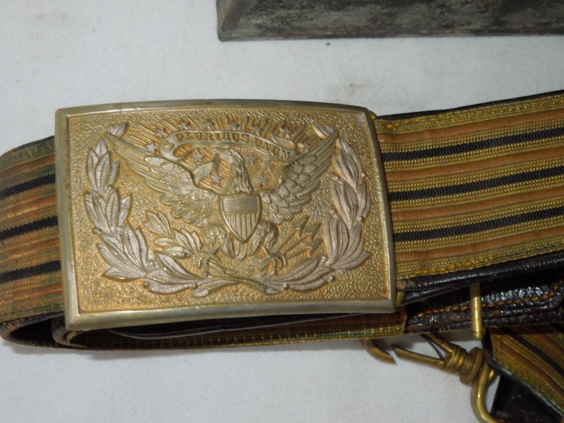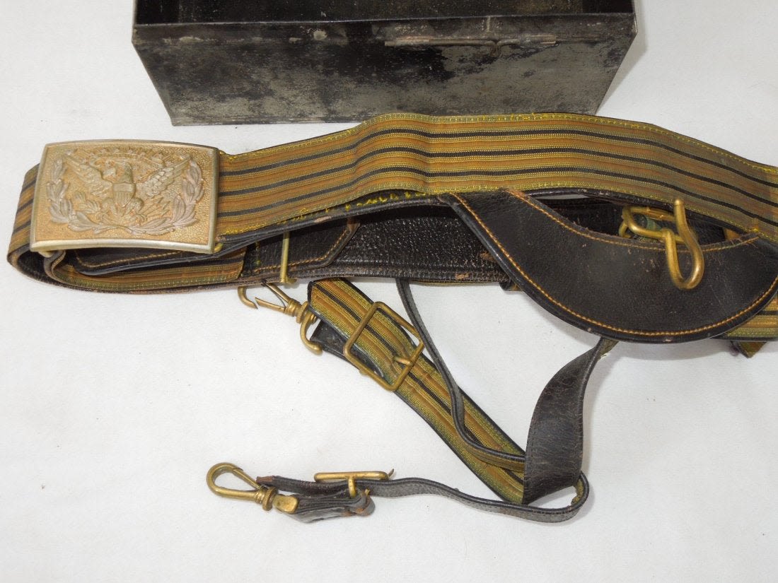 Original US Army General Officers dress uniform belt with black colors between gold bullion stripes in the original tin box.