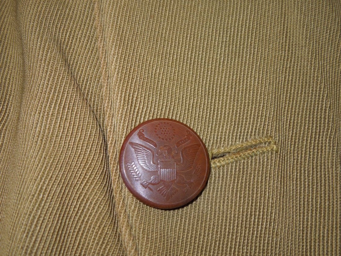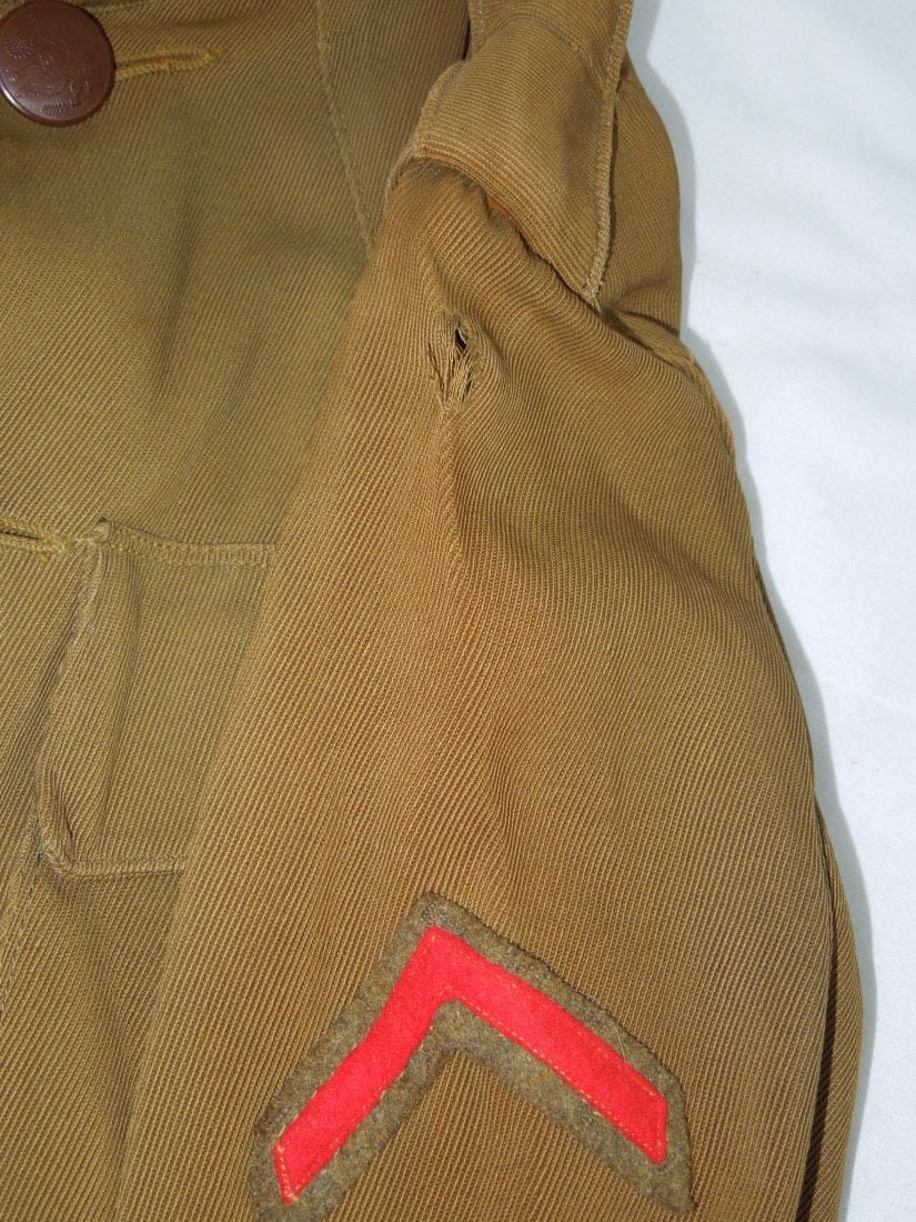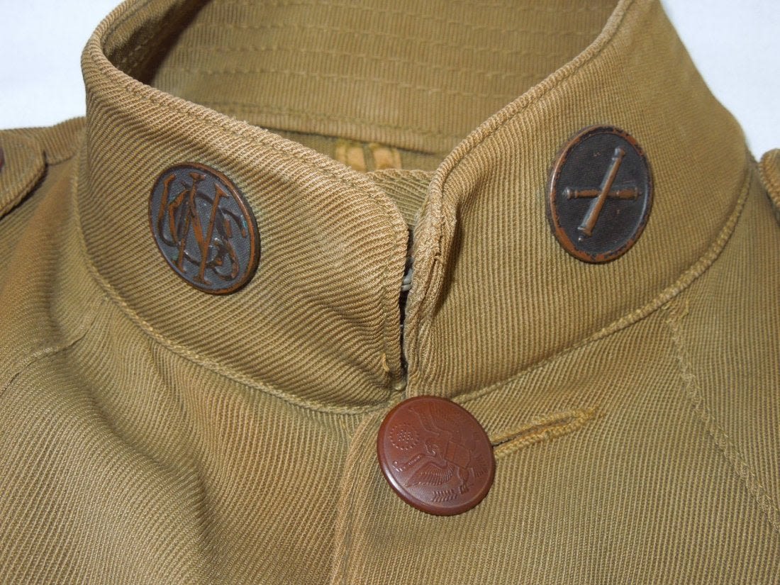WWI Artillery private summer uniform with plastic vegetable style buttons, discharge stripe, and screw back USNG and Artillery collar discs. (I B 102)