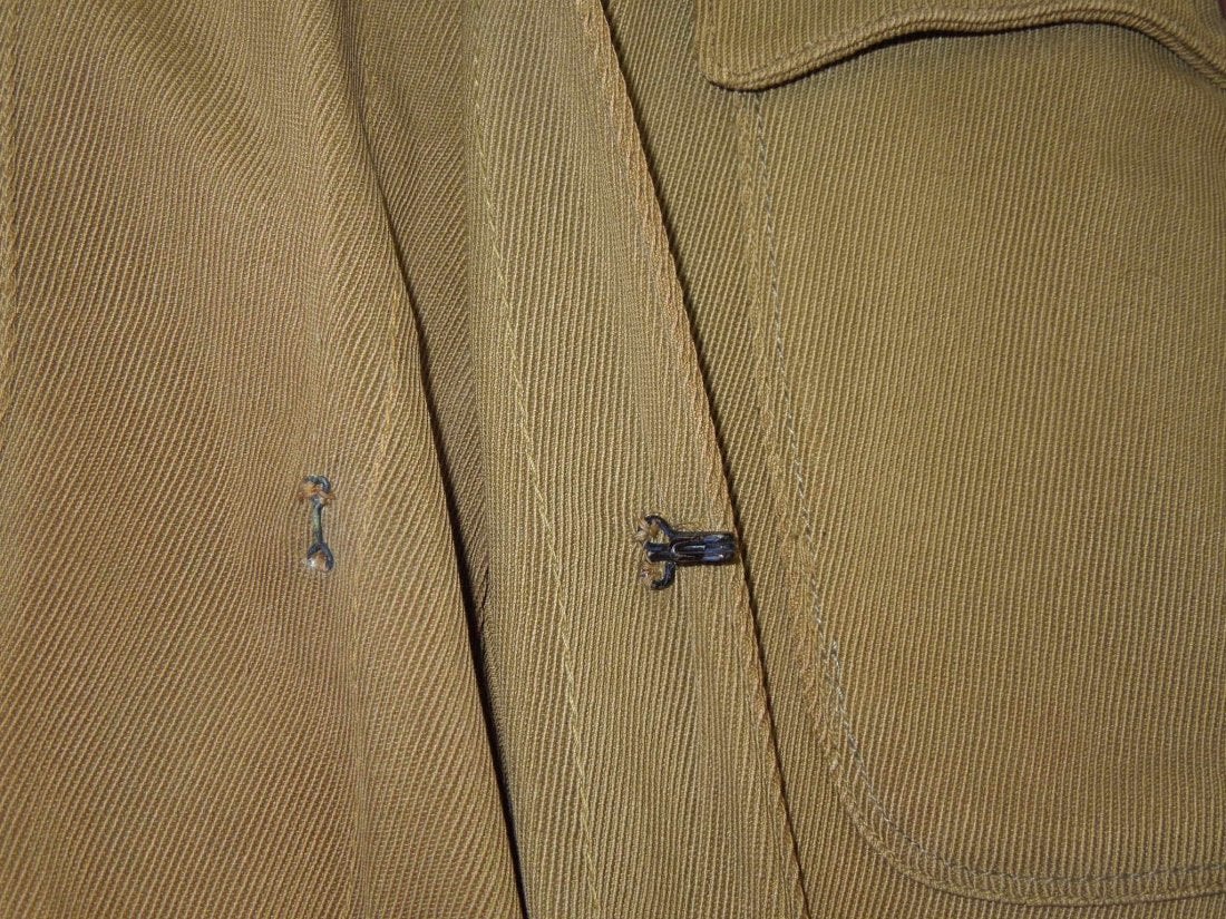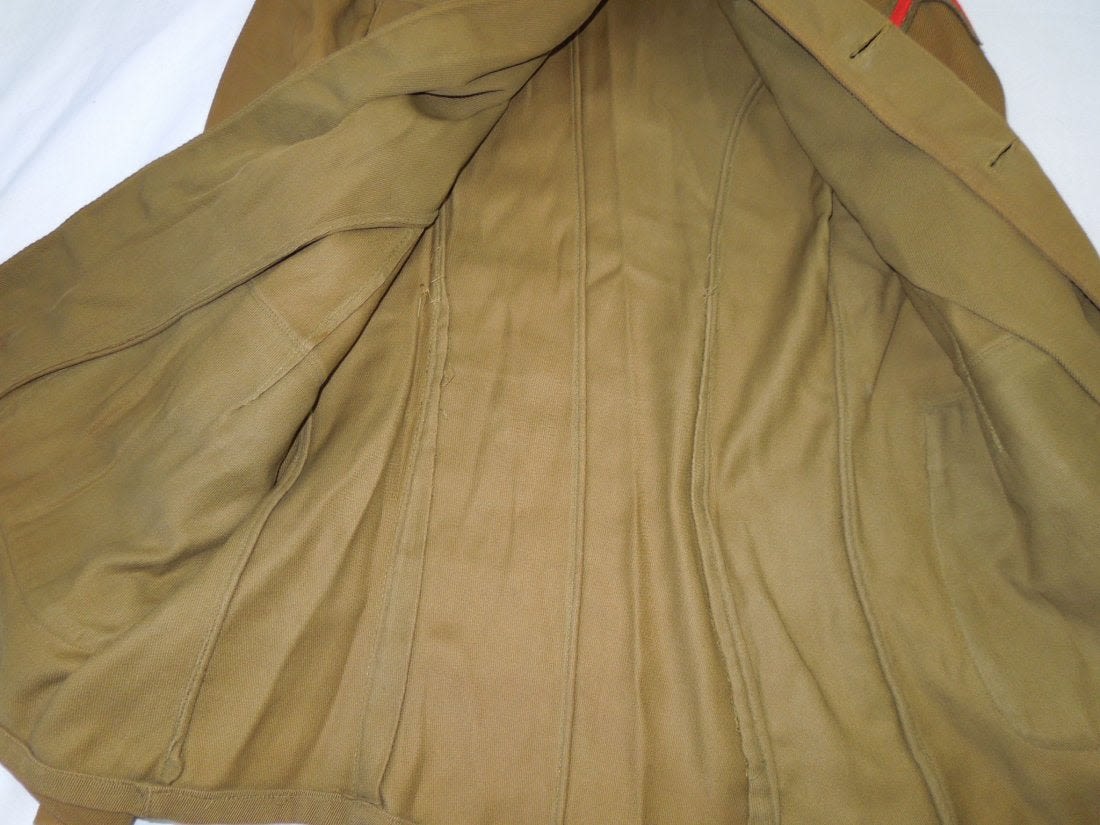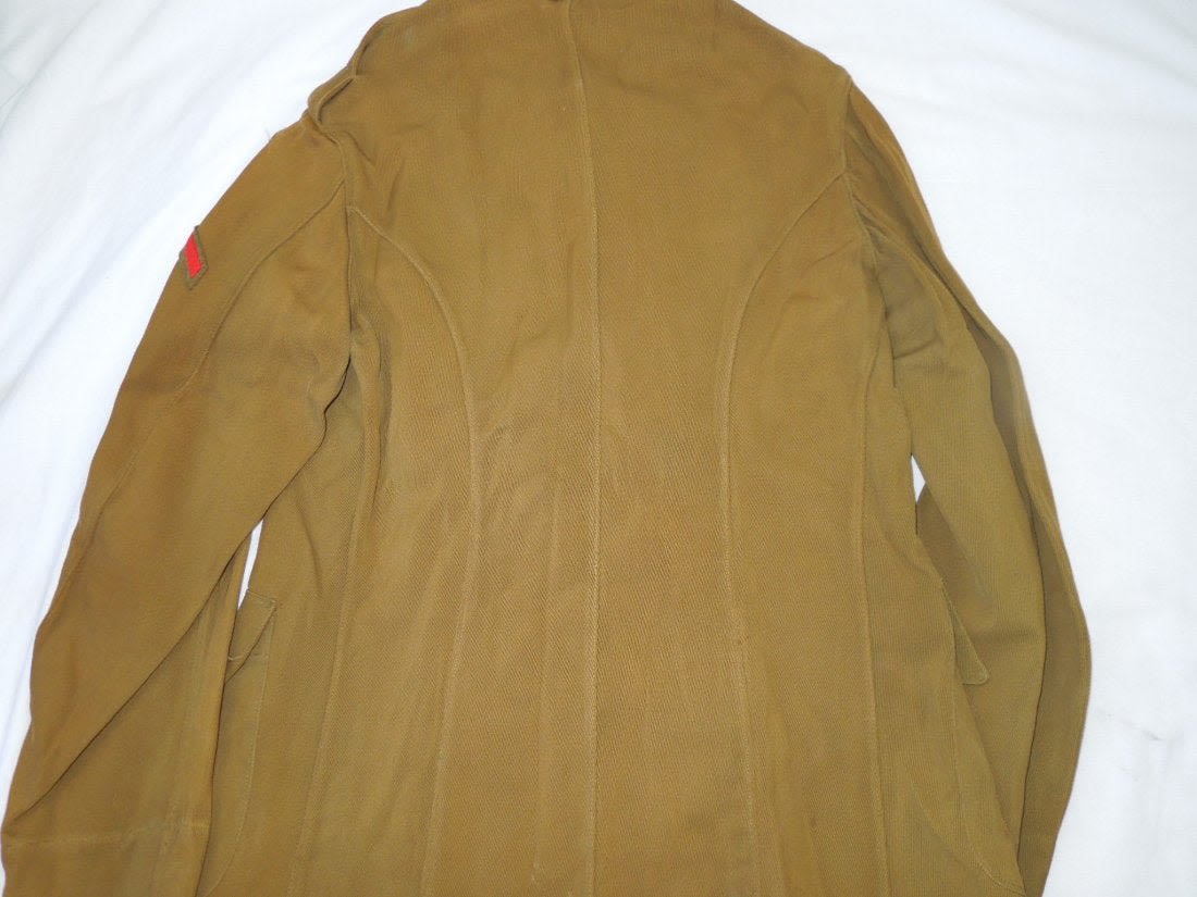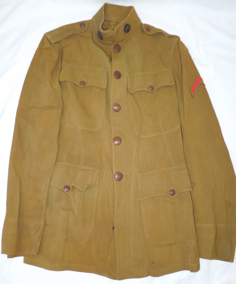 WWI Artillery private summer uniform with plastic vegetable style buttons, discharge stripe, and screw back USNG and Artillery collar discs. (I B 102)
