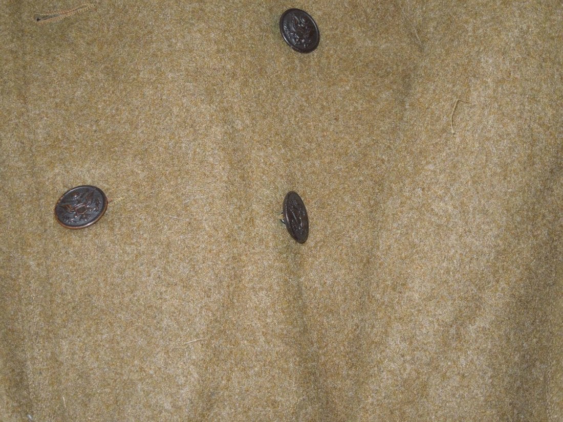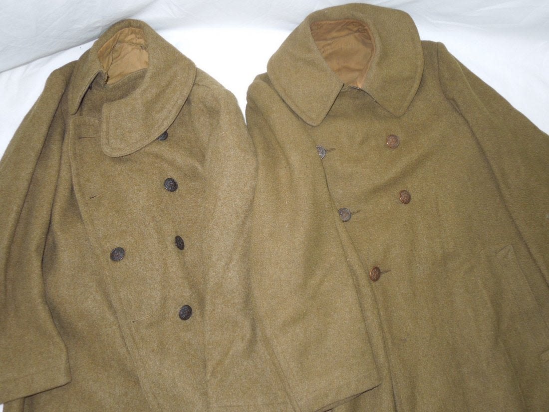 Lot of two heavy wool US Army enlisted overcoats, WWI era, some buttons missing, and some moth holes throughout.