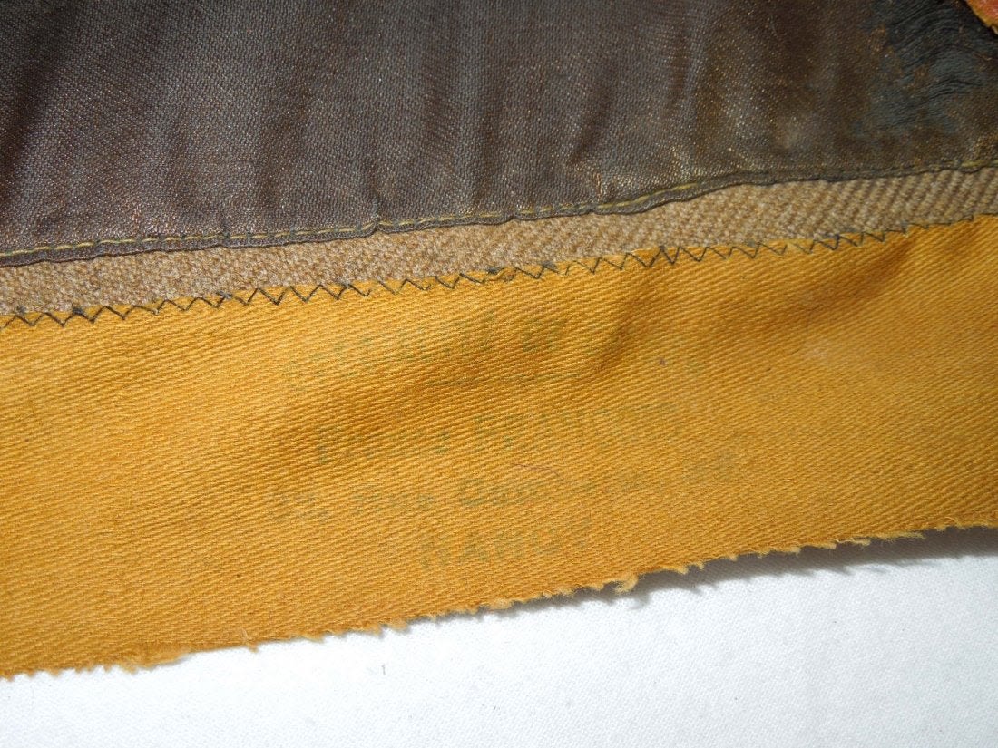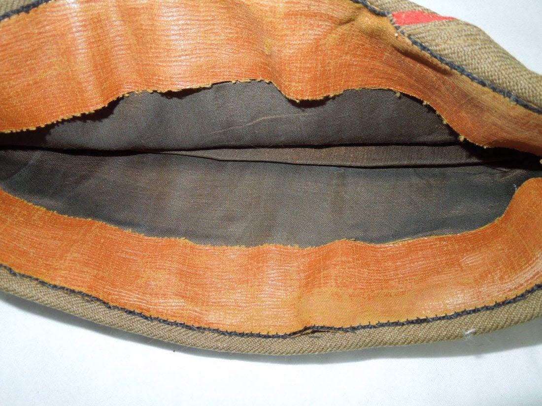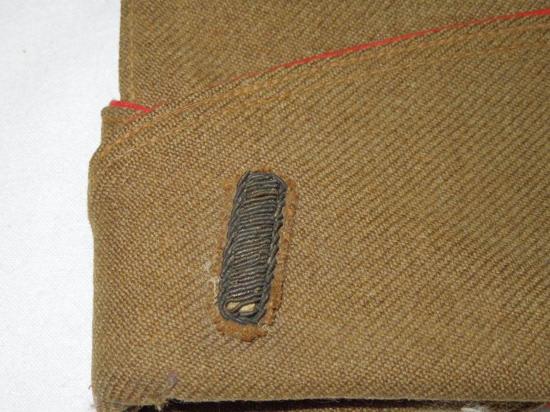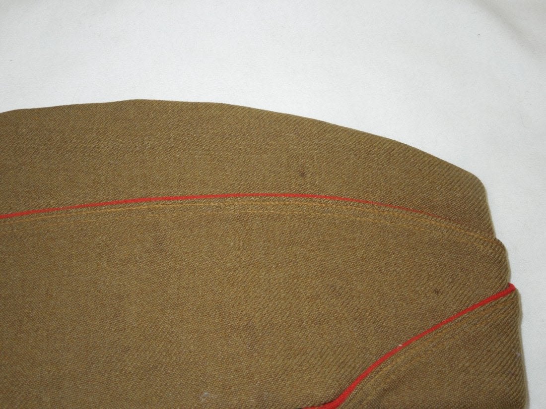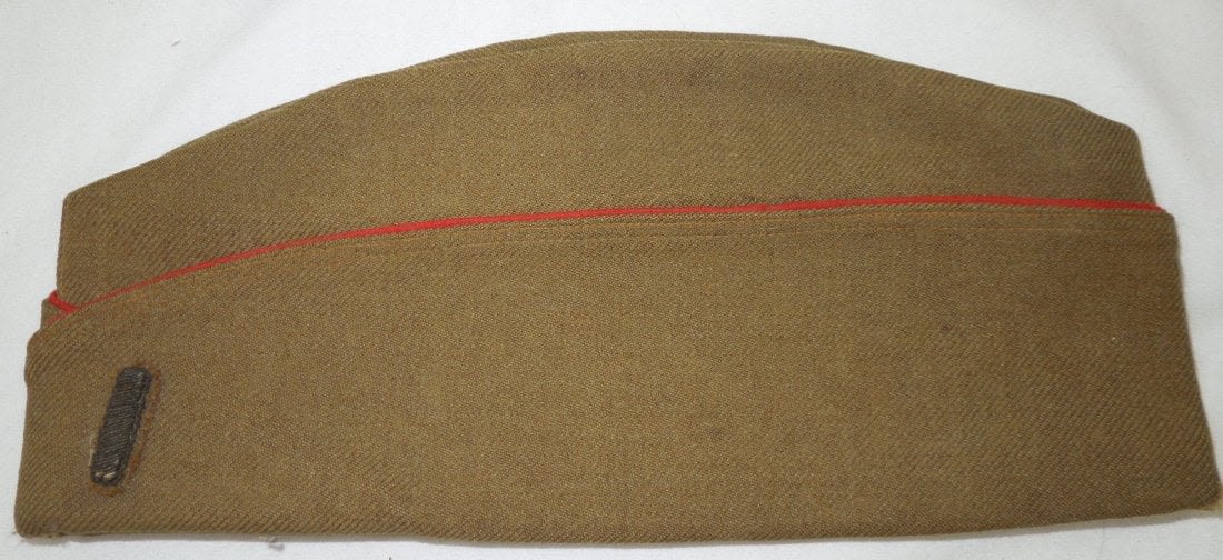 WWI Army Artillery Officer Garrison Overseas Hat. French made. Artillery with red solid piping. Lieutenant insignia bullion. Light olive drab wool. Leather sweat band. Manufacturer stamped but faded and hard to read. Nice overall condition. (II C 406)