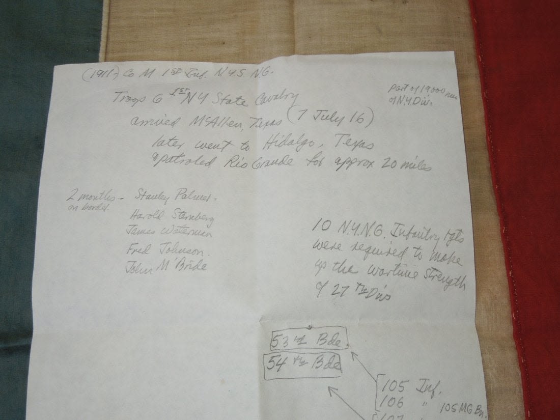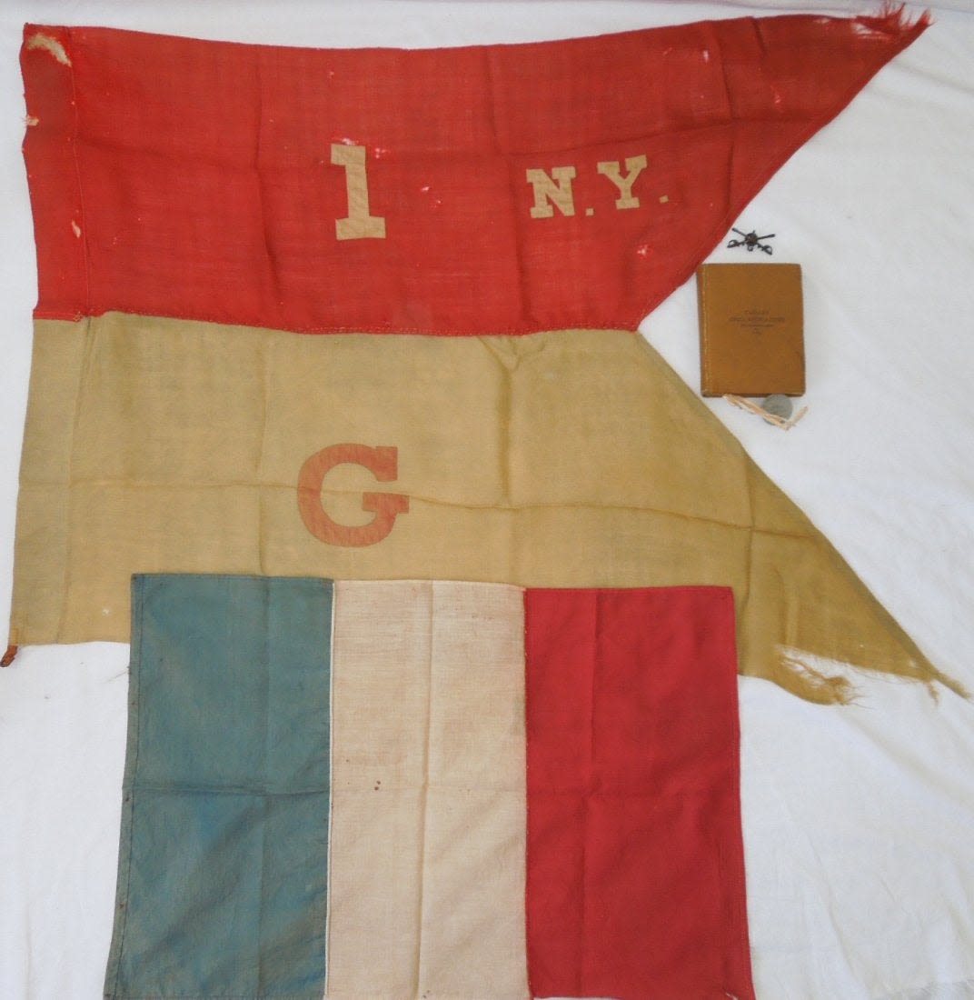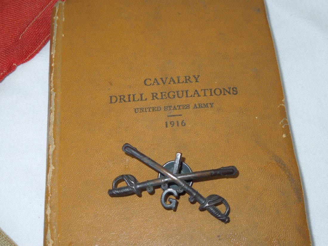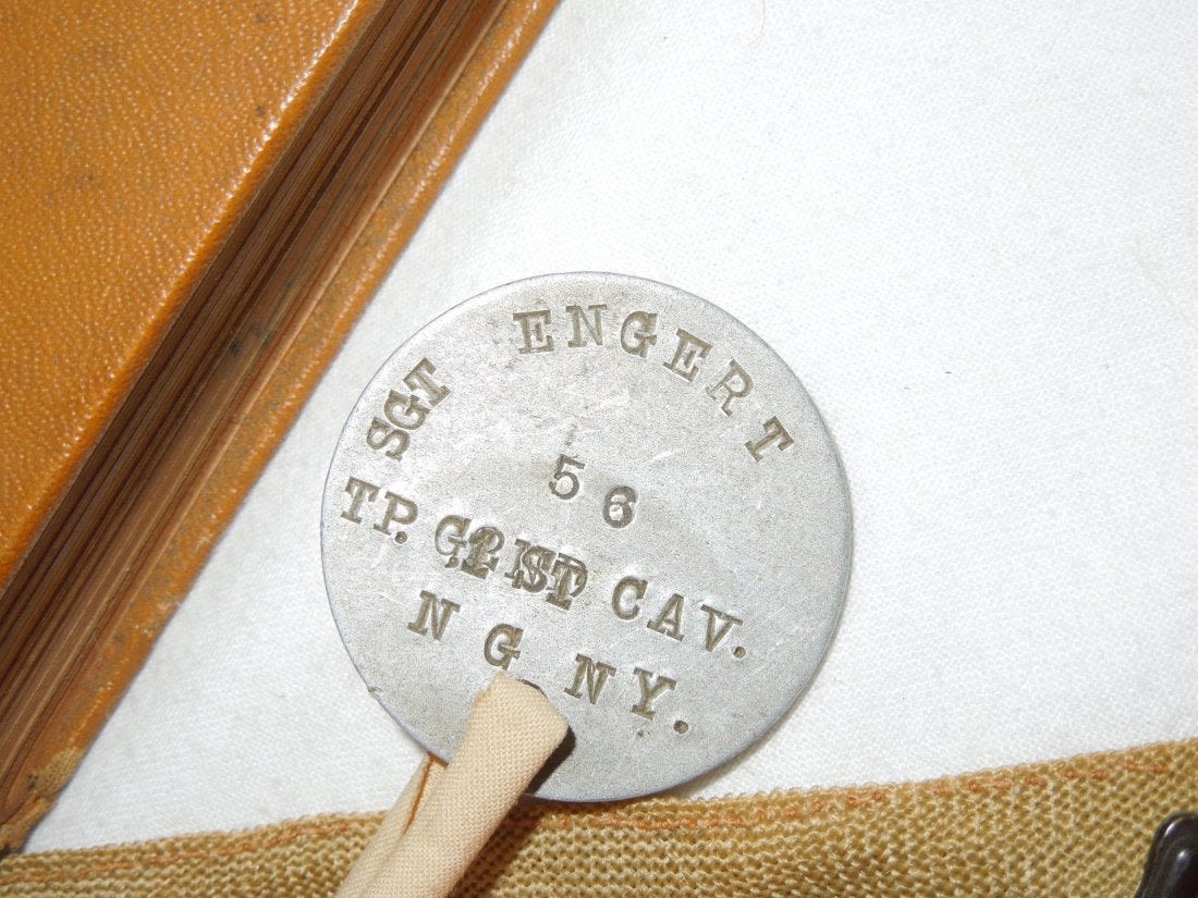 Original historic US Army QM issued 1st New York Cavalry, G Troop Guidon, WWI Dog Tag, Cavalry Field Regulations, Cavalry insignia pin, and souvenir French flag from Sgt. James F. Engert, a member of G Troop, which later became the 106th Machine Gun Battalion in the AEF, and where he served in France, being gassed at least once. The lot comes with a handwritten bio of him. The guidon is the prize here as it would have accompanied the troops on the Mexican Border Campaign that they served on prior to going into WWI. It is tattered and well worn from use, but historic nonetheless. The tag inside is mostly faded, but present.