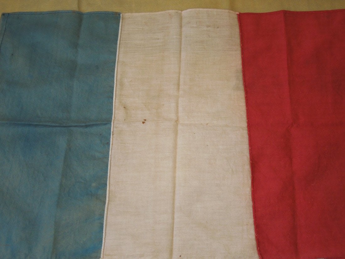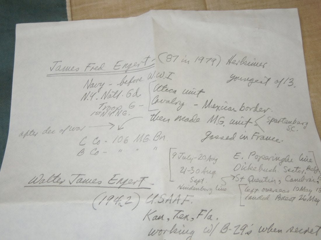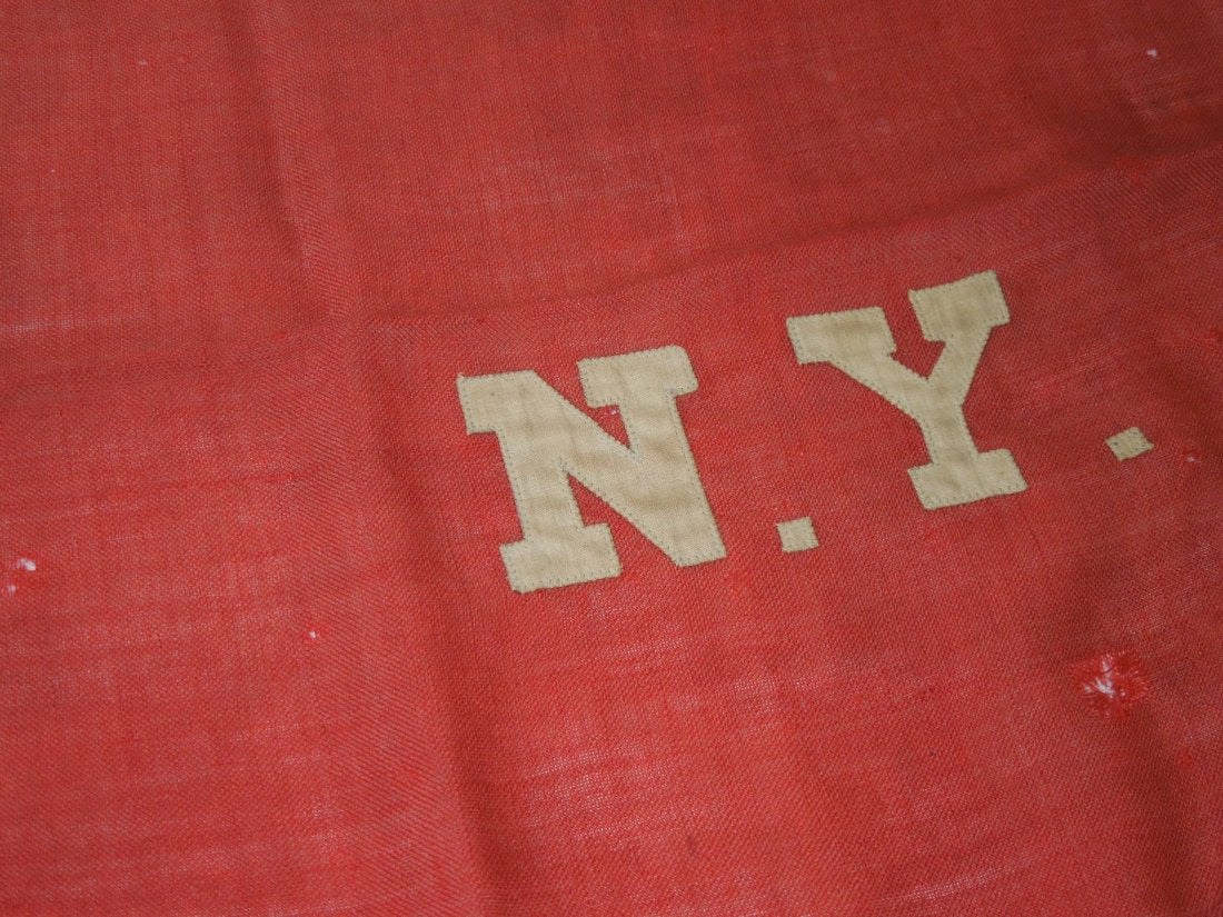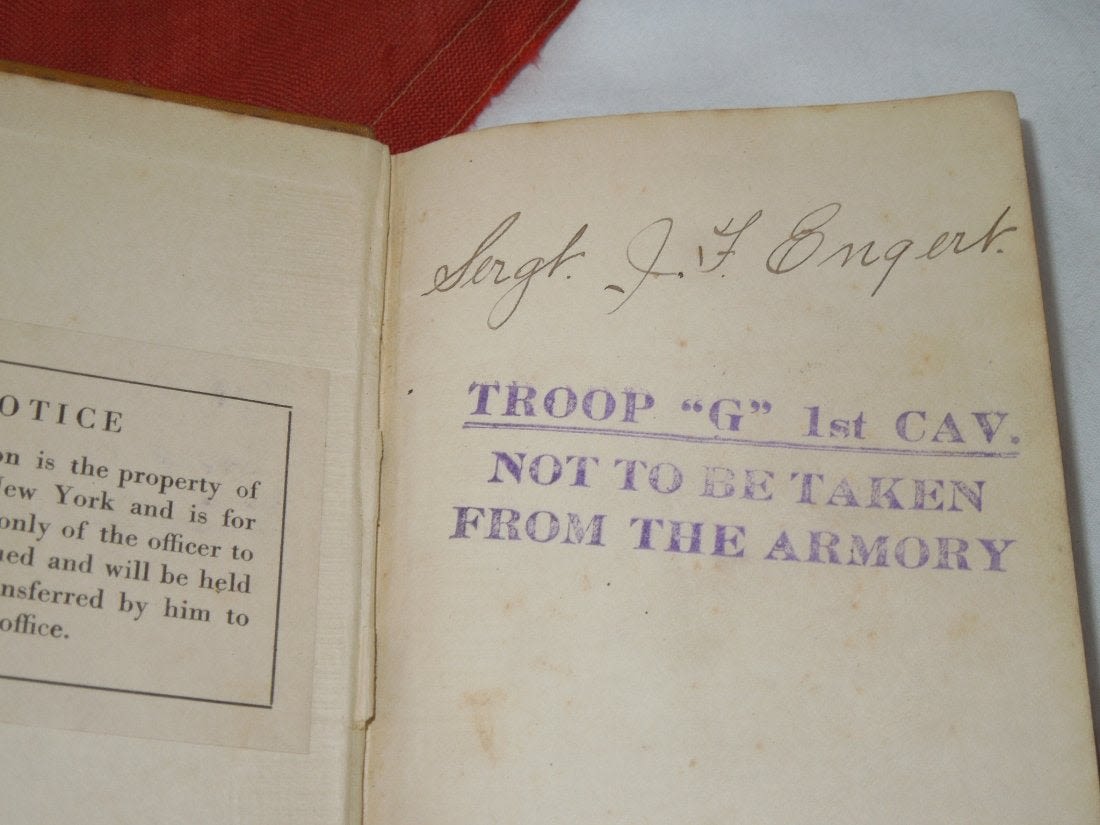 Original historic US Army QM issued 1st New York Cavalry, G Troop Guidon, WWI Dog Tag, Cavalry Field Regulations, Cavalry insignia pin, and souvenir French flag from Sgt. James F. Engert, a member of G Troop, which later became the 106th Machine Gun Battalion in the AEF, and where he served in France, being gassed at least once. The lot comes with a handwritten bio of him. The guidon is the prize here as it would have accompanied the troops on the Mexican Border Campaign that they served on prior to going into WWI. It is tattered and well worn from use, but historic nonetheless. The tag inside is mostly faded, but present.