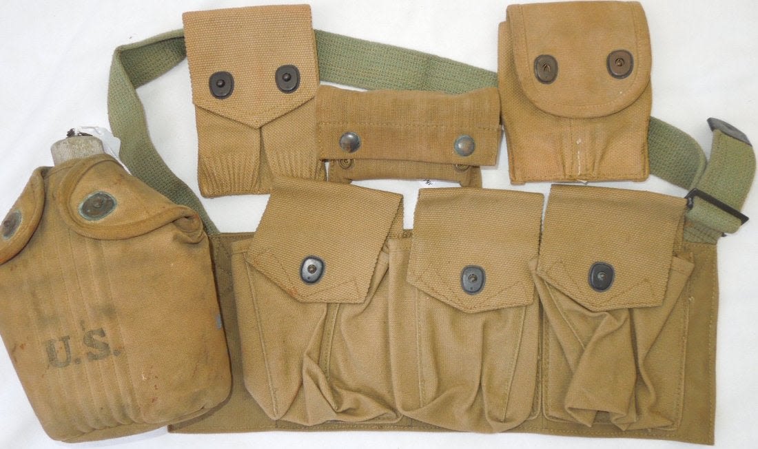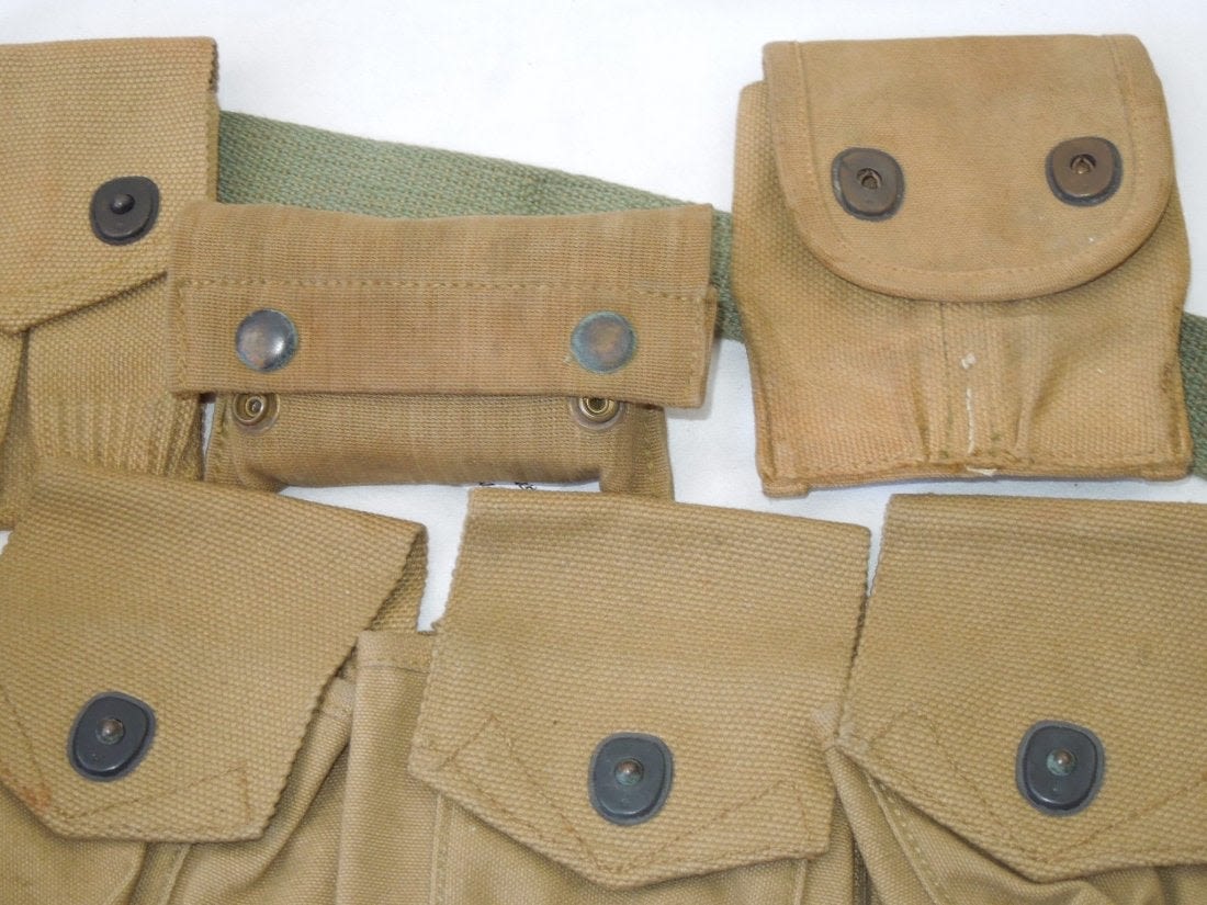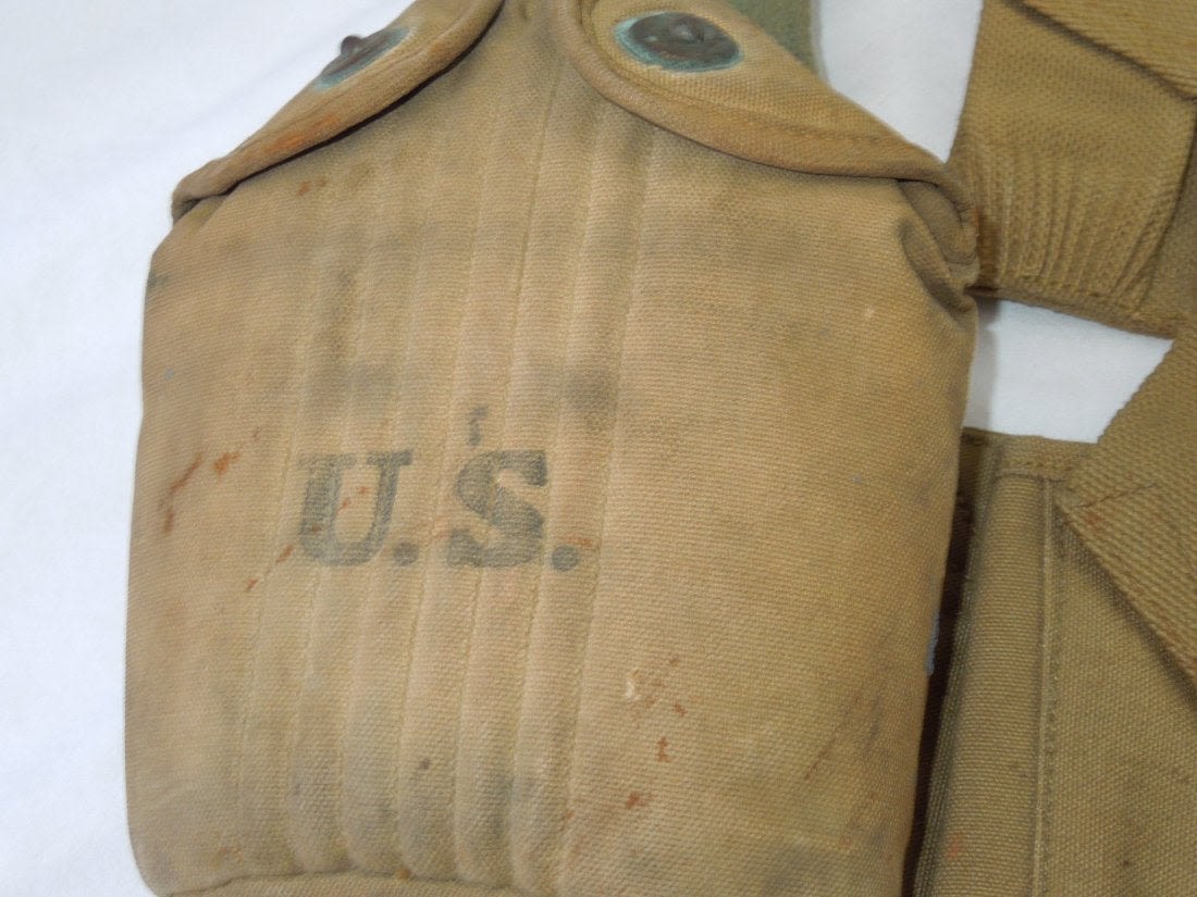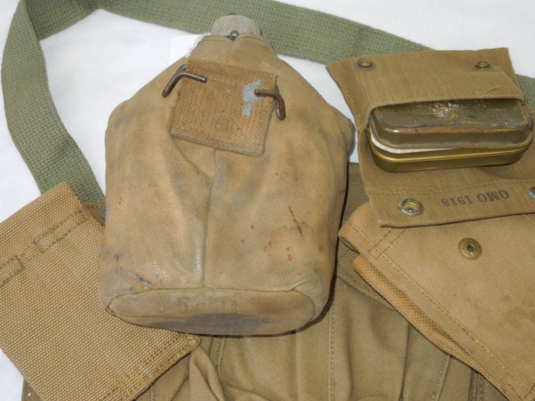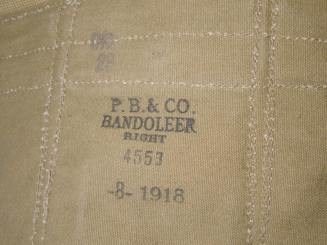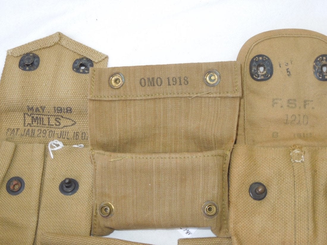 WWI US Military Field Gear Lot BAR Canteen Ammo Pouches. You will receive the following 5 items. 1. US L. F. & C. 1918 Canteen and cover. The cover is marked THE M.H. CO. 7-1918. Used condition consistent with its age. Oxidation on the metal pieces. 2. 1918 First Aid Pouch and Bandage. Maker OMO 1918. 52 B stamped on front bottom. Bandage (Bauer and Black) is unopened. Good condition. 3. .45 1918 Pouch. Marker is Mills. Excellent condition. 4. 1918 .45 Pouch. Maker is F.S.F. 1210. Good pouch consistent with its age. 5. 1918 BAR 3 Clip Bandoleer Pouch. P.B. & CO. Bandoleer RIGHT. Good condition. (III A 5)