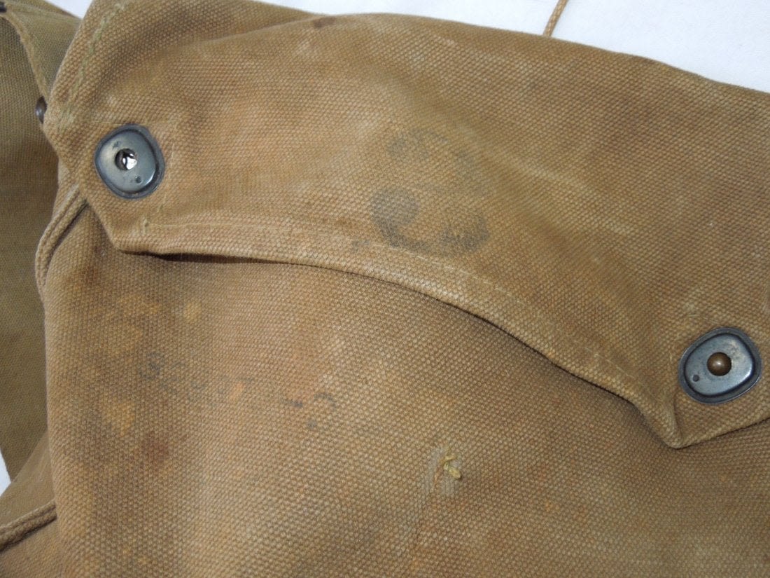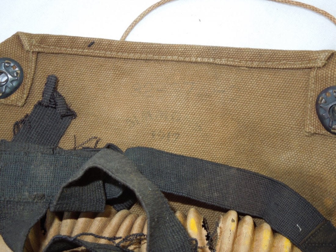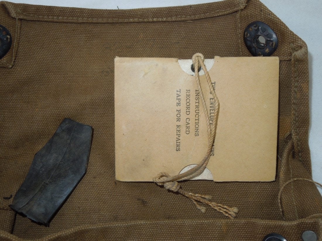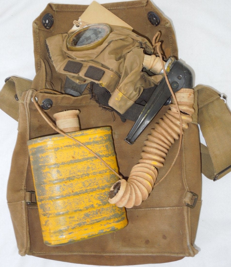WWI 1917 dated Gas Mask, carrying bag and instruction booklet. The bag shows sign of wear and age, but is in very good usable condition. The Gas Mask tubing itself is separated and in pieces due to age. (III A 9)
