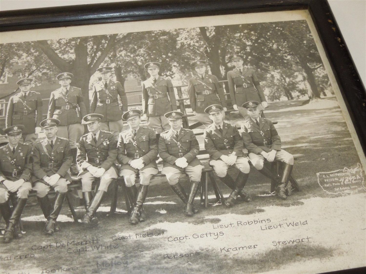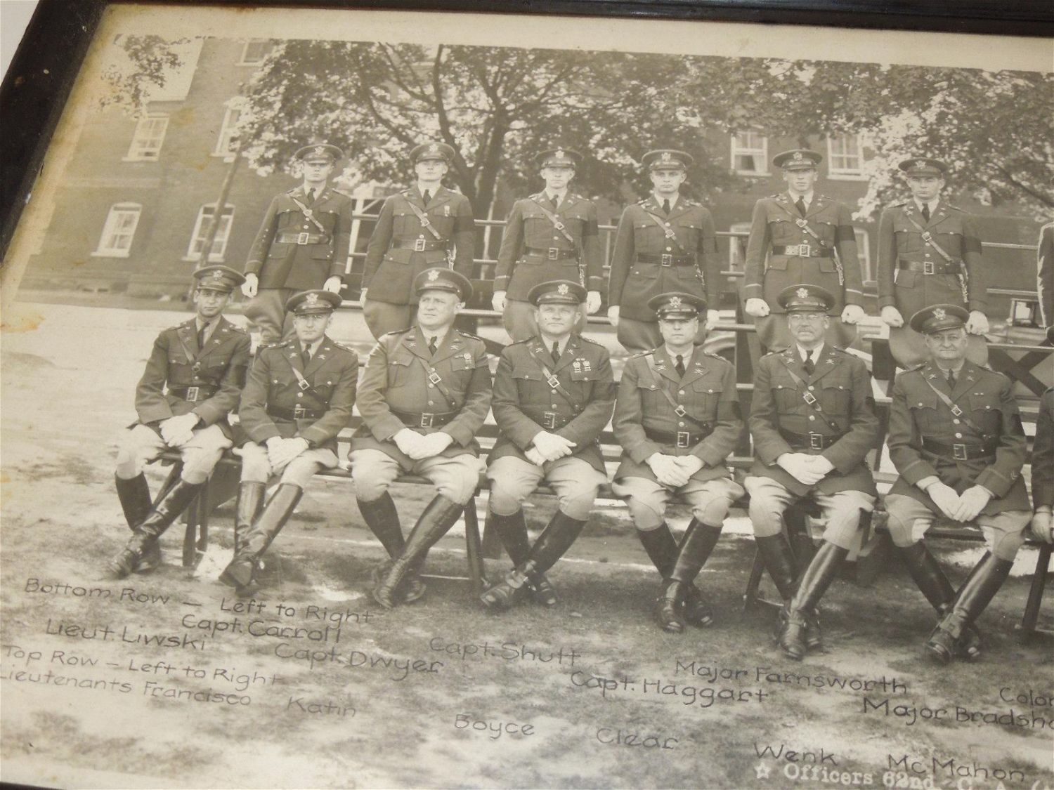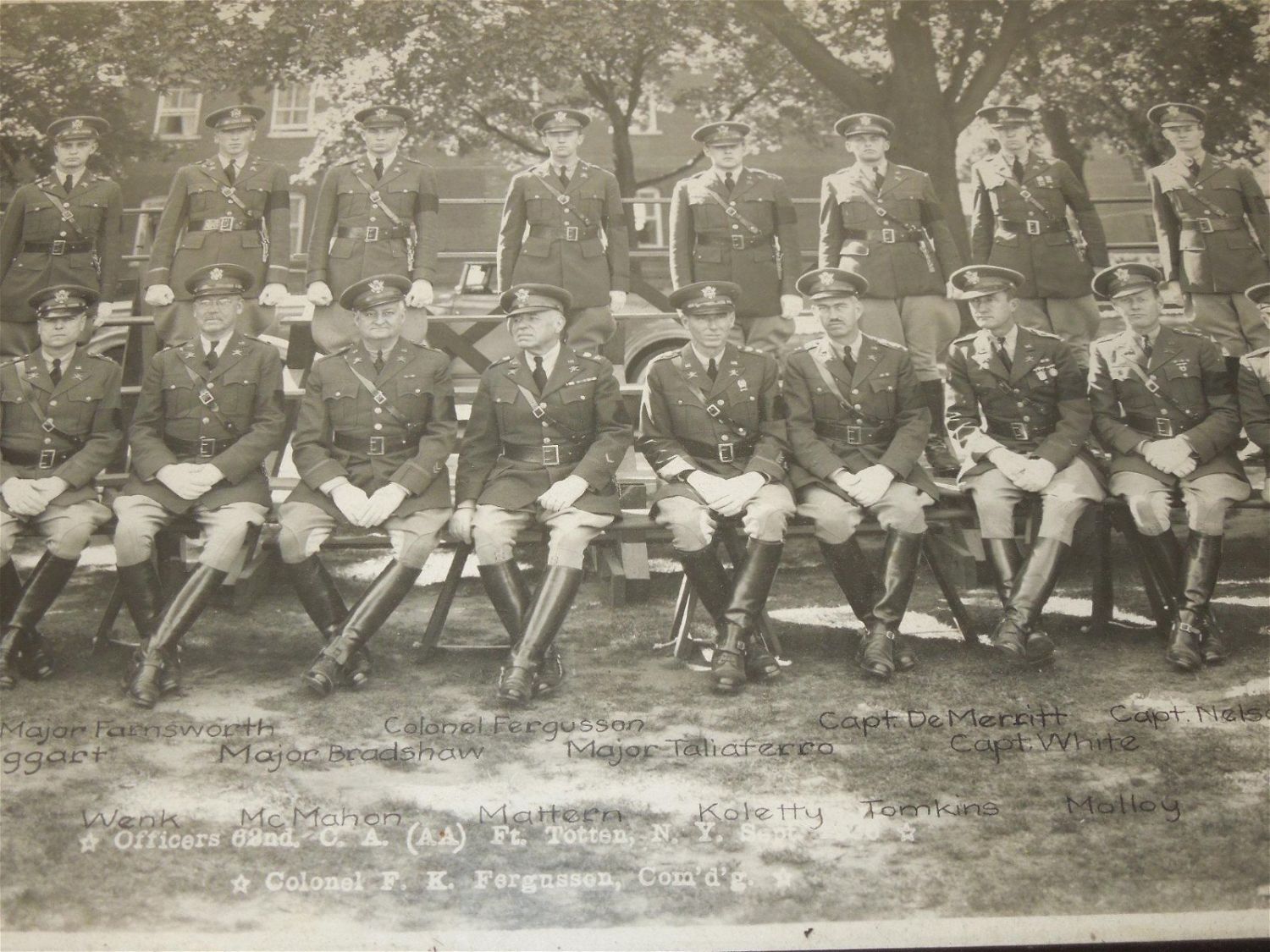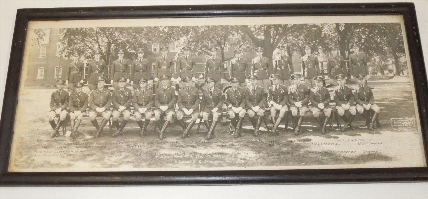 Original 1936 Fort Totten, NY 62nd Coast Artillery (AA) framed under glass unit photo measuring 11 x 25 inches in size. The nice part about this is the naming of each Officer on the bottom. Quick research using only the USMA Register revealed that at least four of these men became General Officers (Bradshaw (Fifth Army WWII), Fergusson, Persons (7th Armored Div. WWII), and Stewart). At least five became full bird Colonels, many commanding AAA Brigades in WWII. Mattern became a Lt. Col. and was killed on Saipan in 1945 commanding the 751st Gun BN. Lots more research potential here!