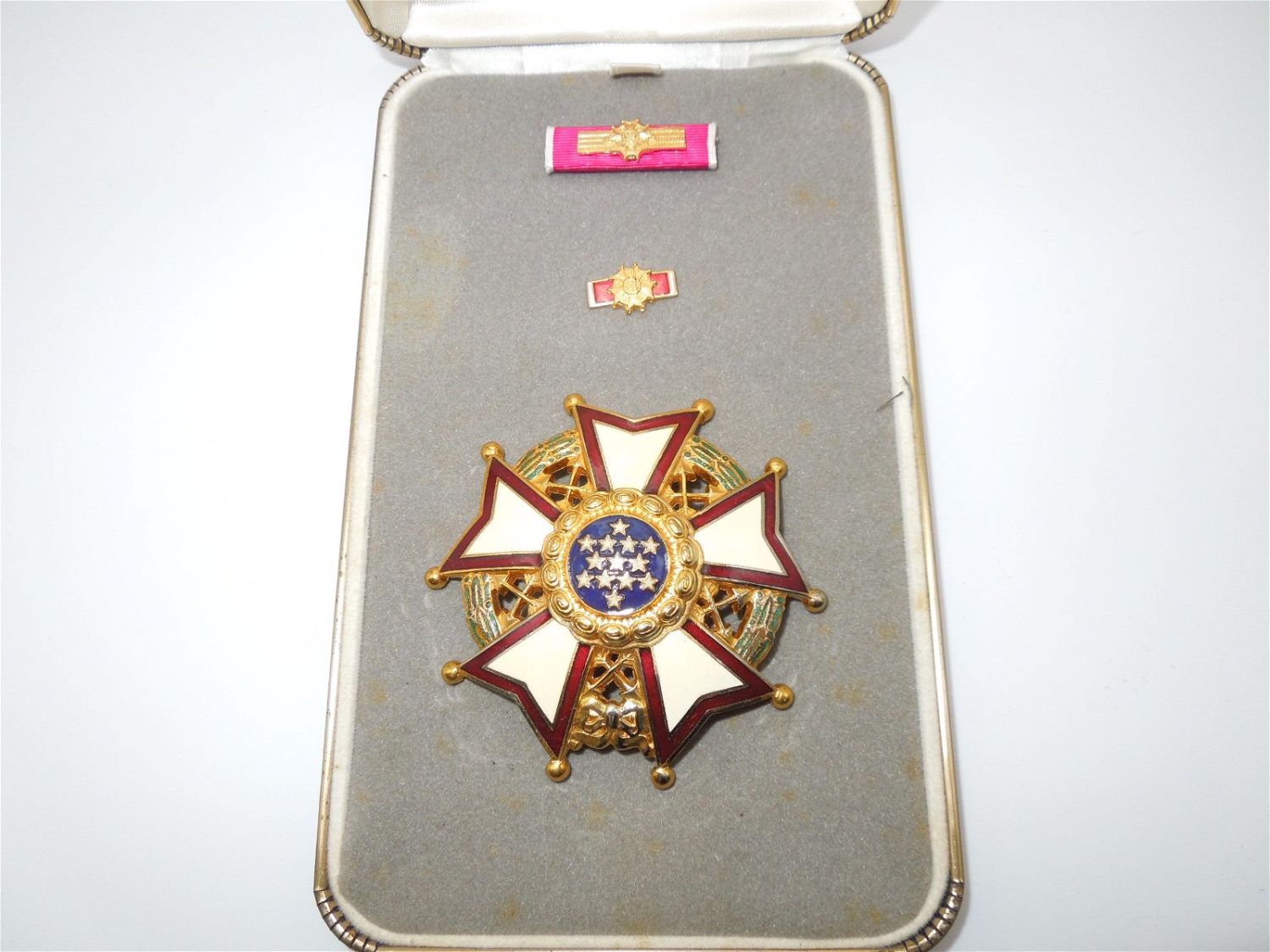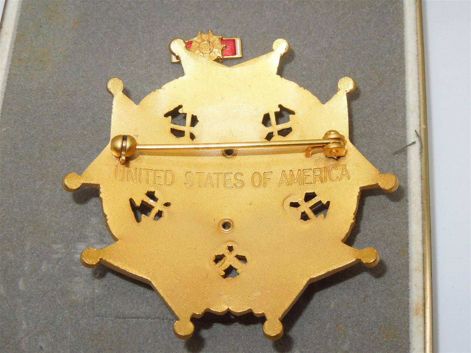 Original medal set as shown with all three pieces. The badge is marked on the reverse and pin back. Good condition, though the interior of the case has spotting from age.