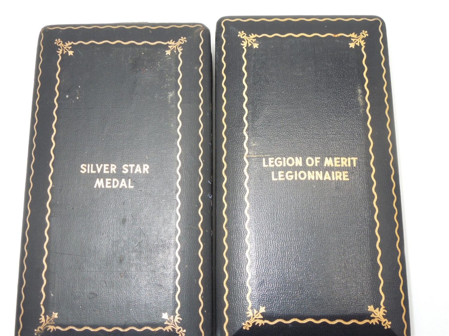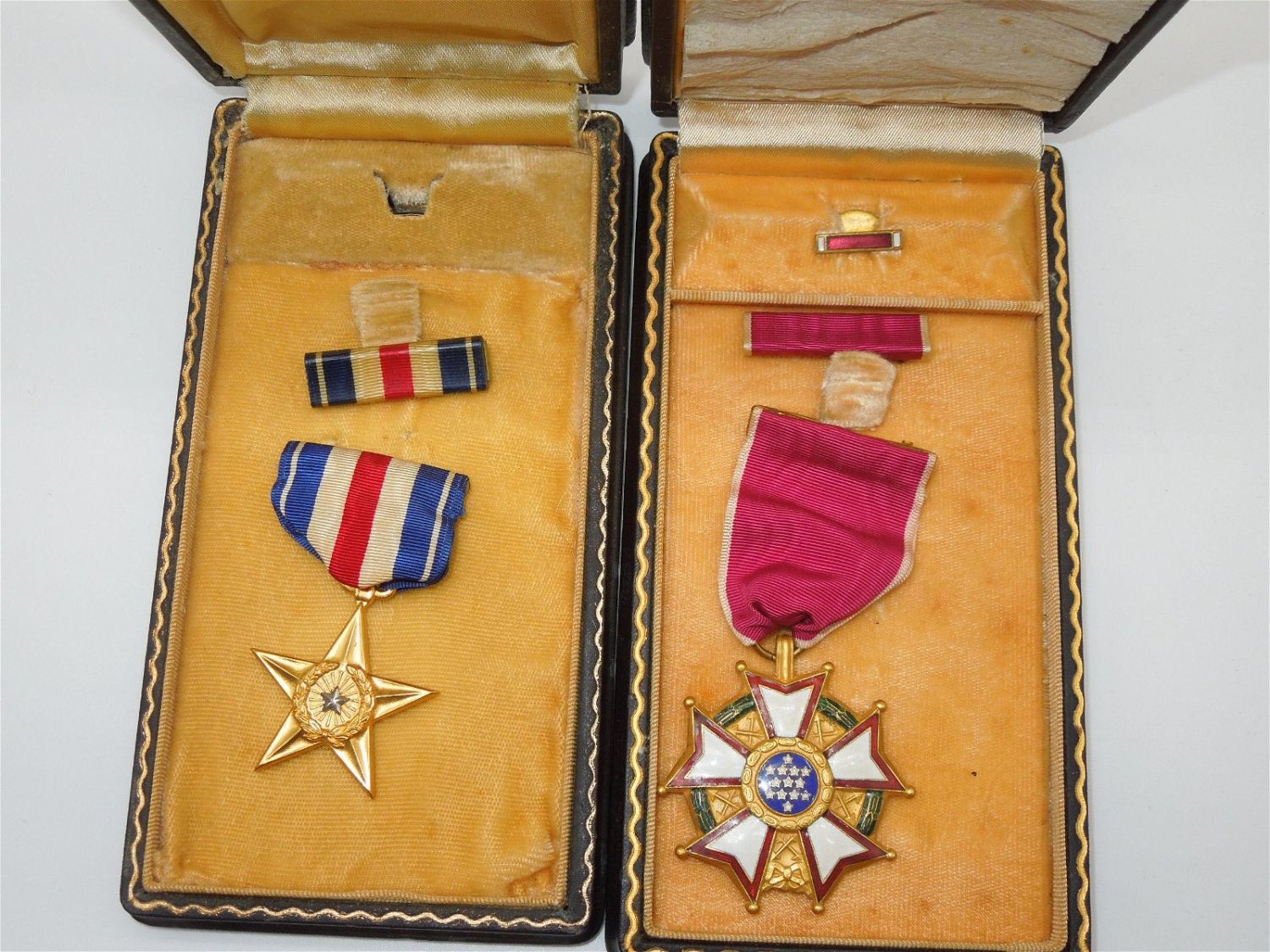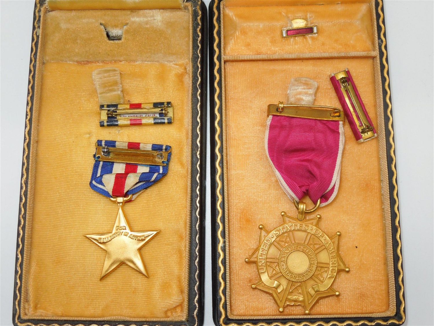 Lot of two original WWII medals as shown with the Legion of Merit having a wrap brooch and the Silver Star a slot brooch. They come in the leatherette cases and are in good condition.