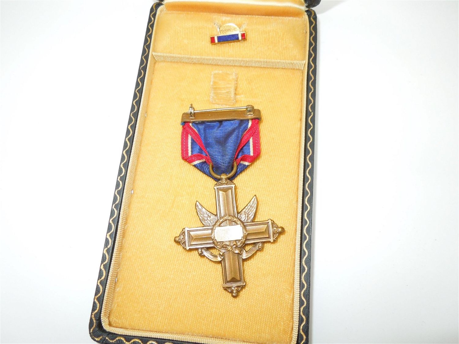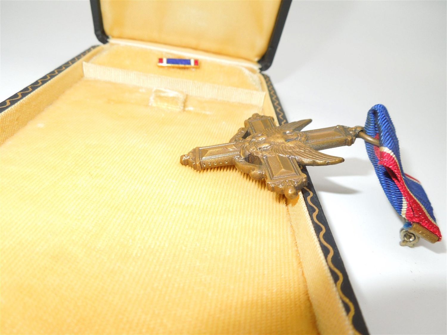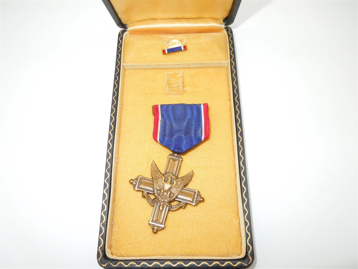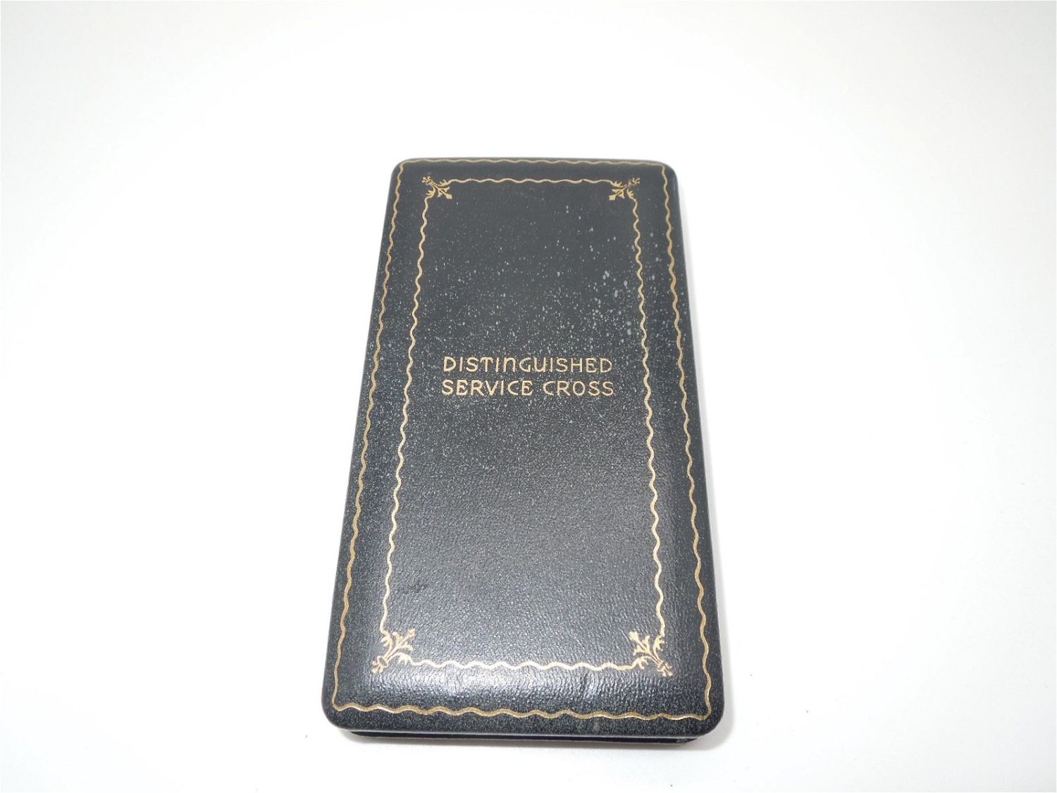 Original wrap brooch WWII DSC with numbered edge 17565 (hard to make out), in original titled leatherette case and lapel pin.