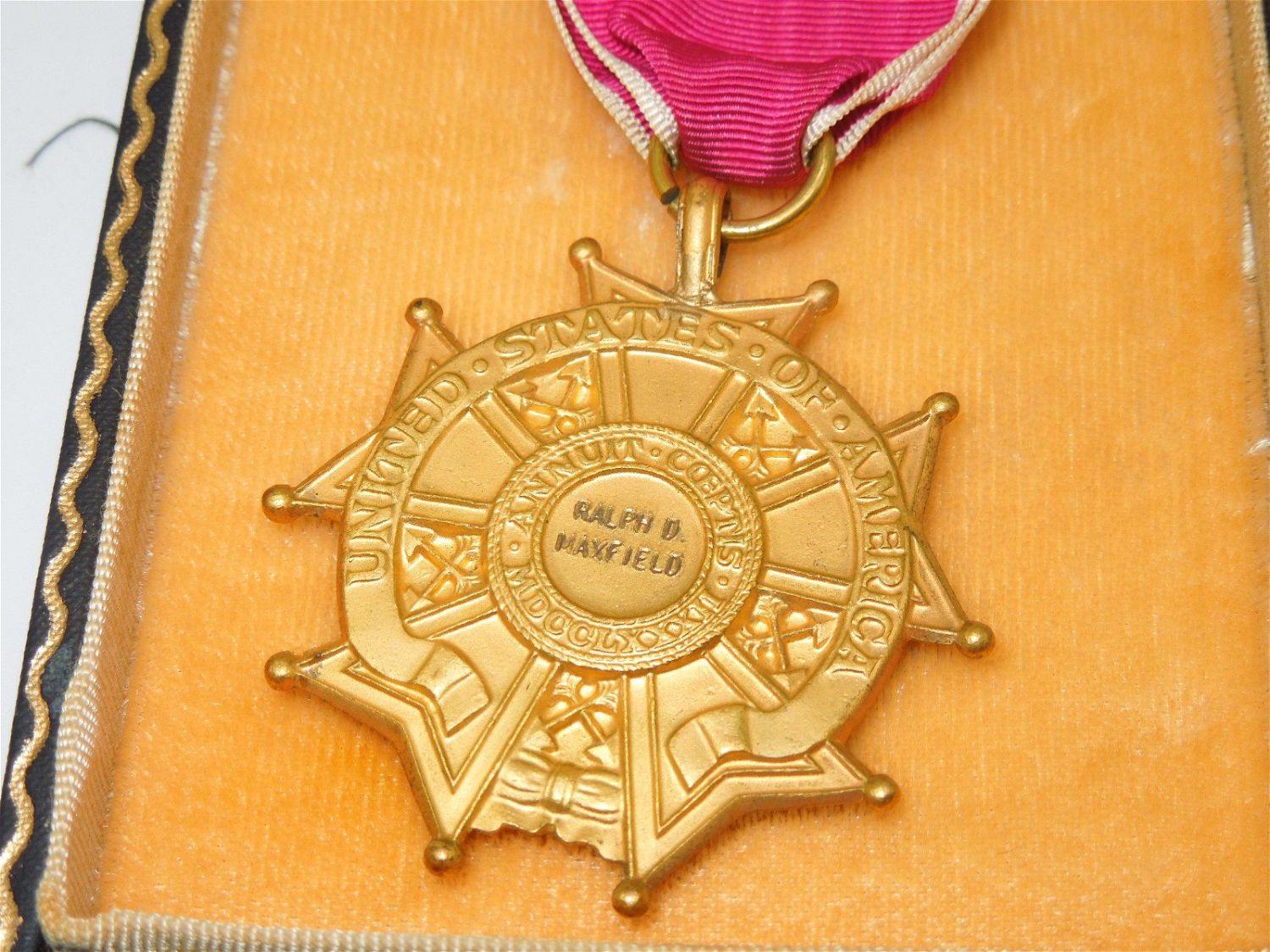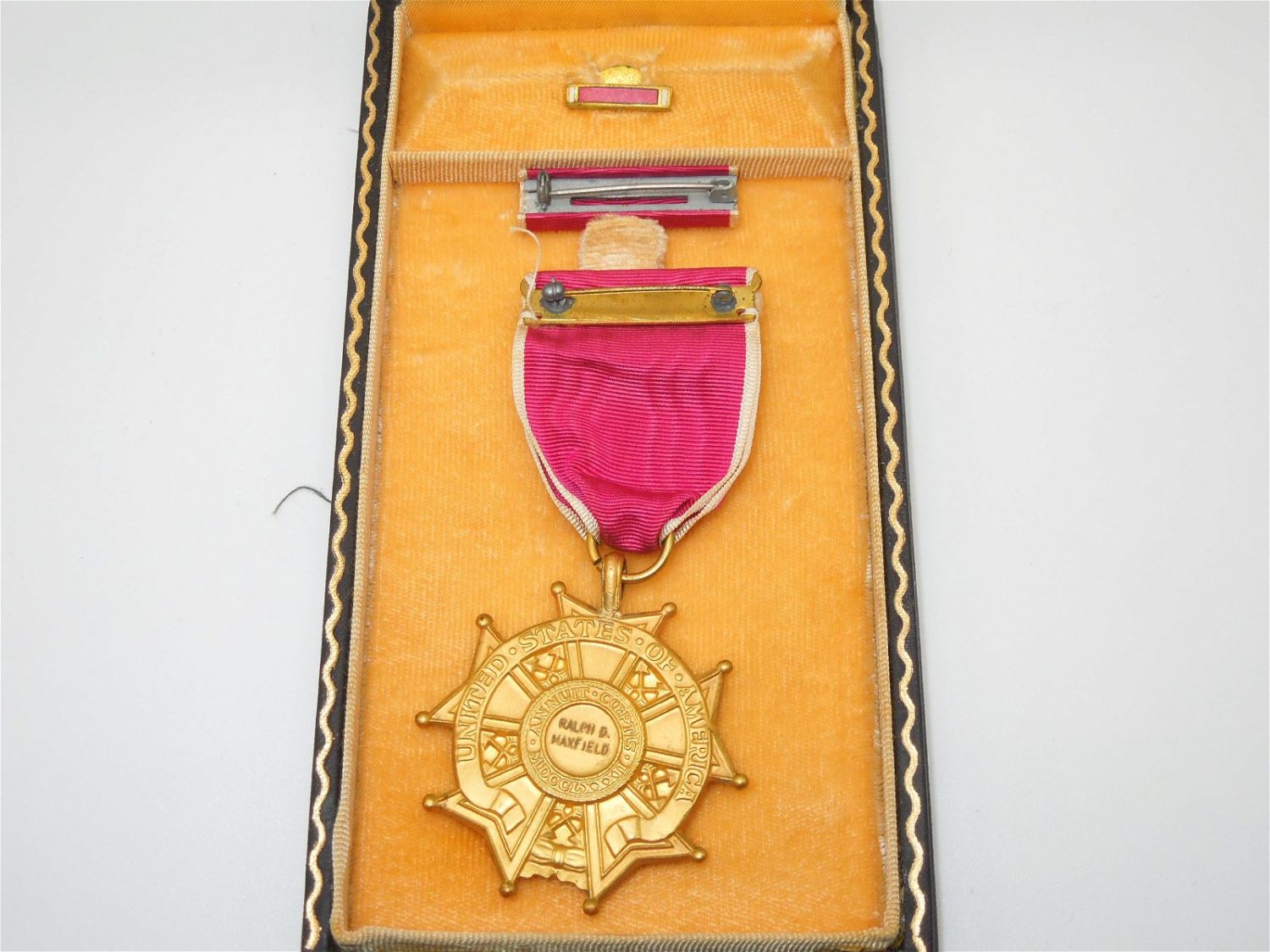Original slot brooch Korean War Legion of Merit set engraved to Ralph Maxfield, who was a Colonel and senior advisor to the ROK Army in the Korean War in 1952. He would later go on to serve as the Inspector General of the Fifth Army. Good condition.