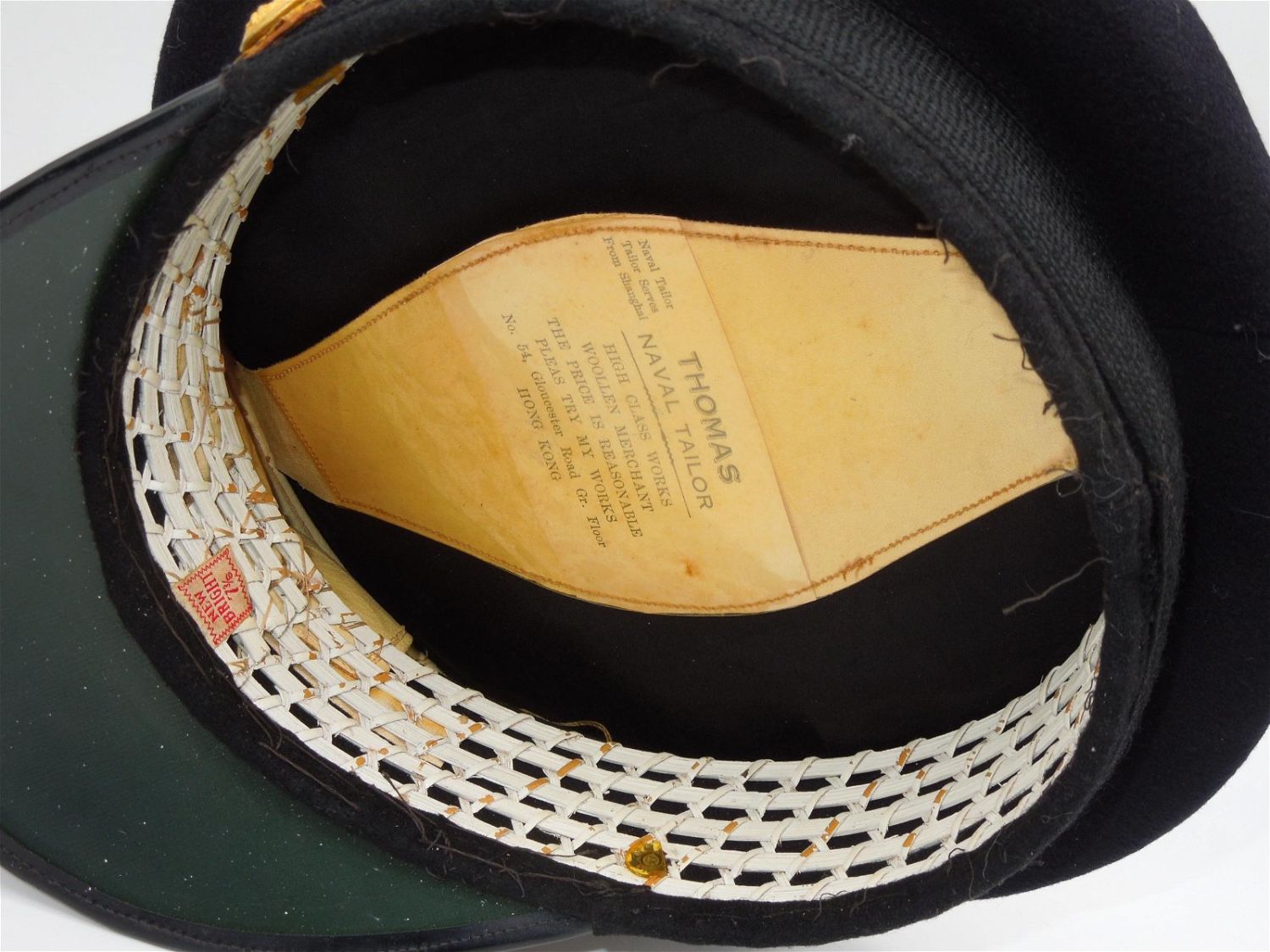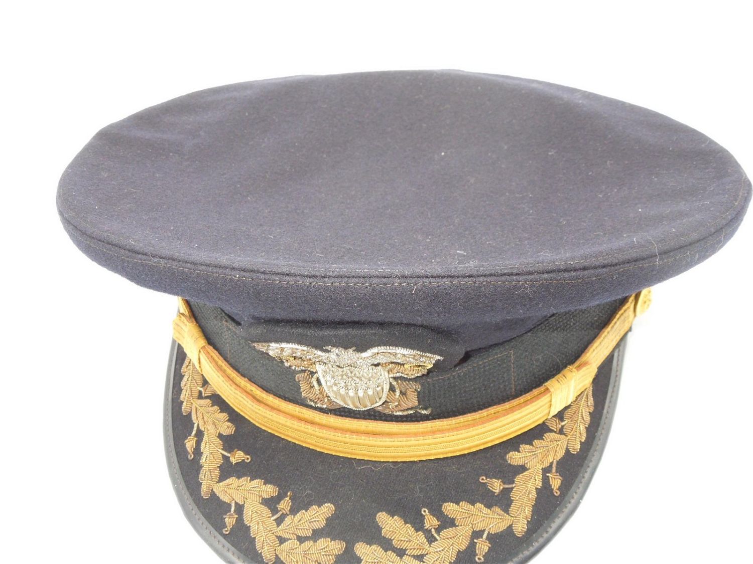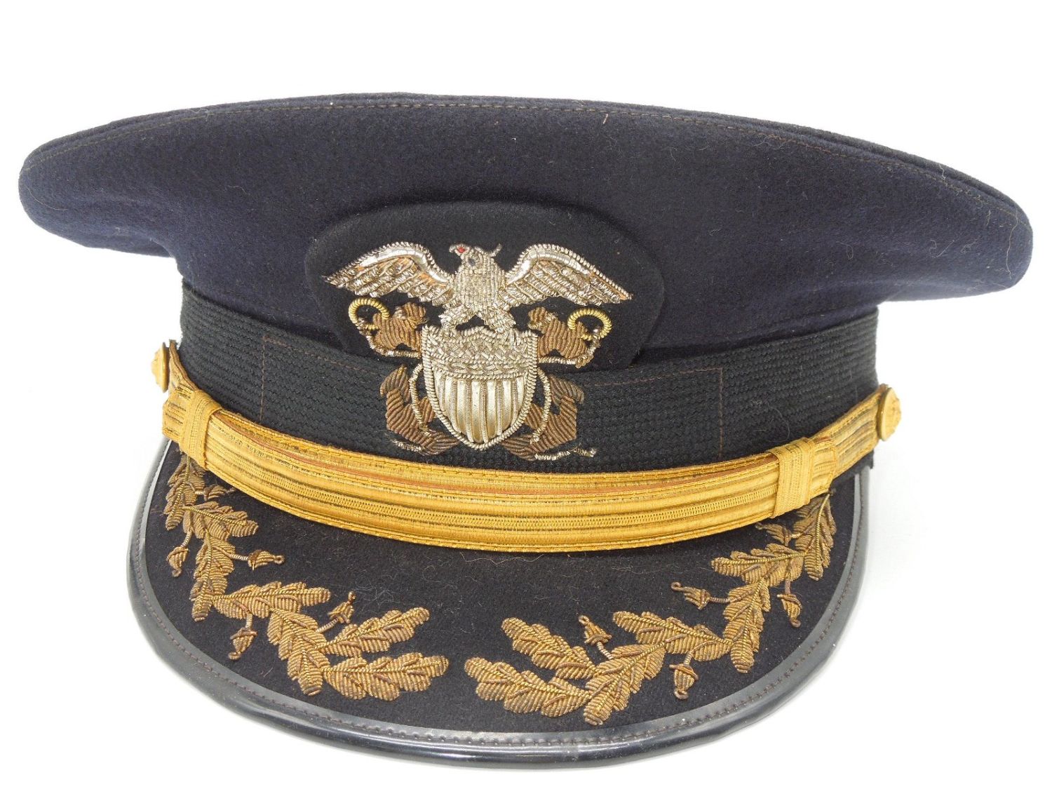 Original USN Navy officer’s visor cap for a Commander or Captain, no sweatband, wicker lining and a size 7 3/8 made by Thomas Naval Tailor. The cover is in good condition, and the bullion emblem and oak leaves have a nice patina to them.