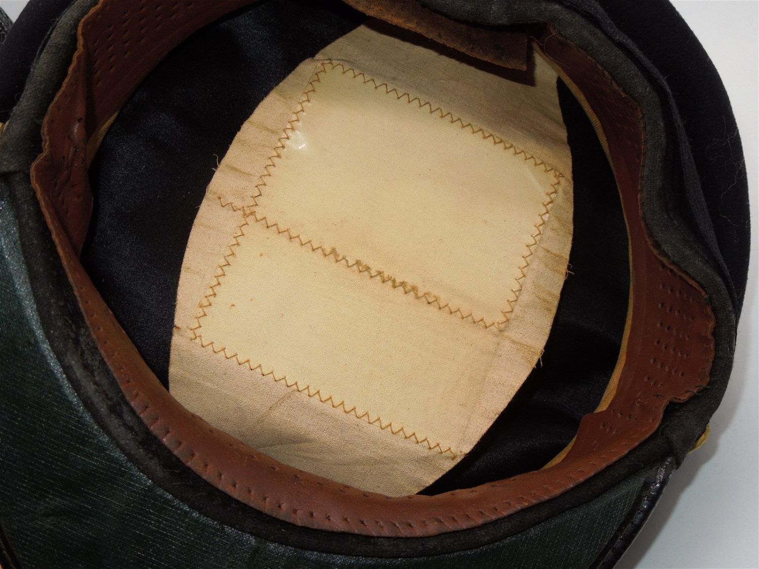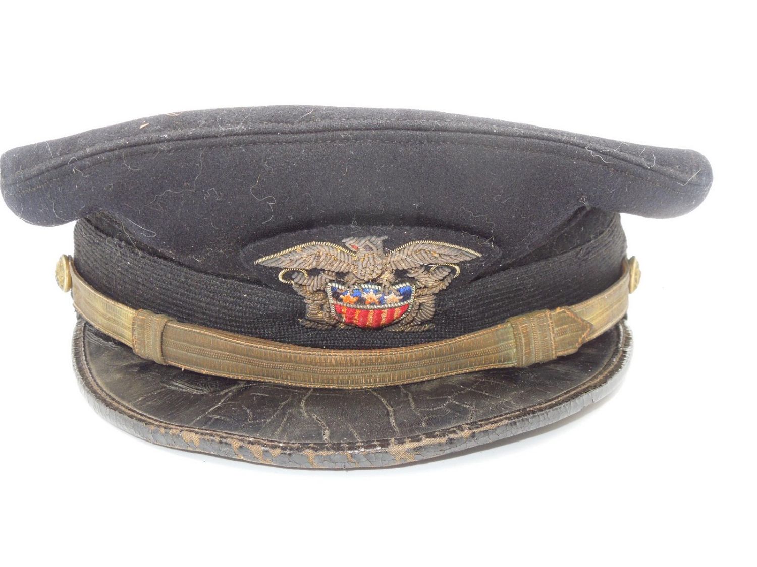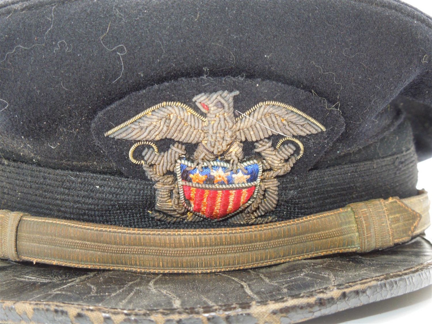 WWII US Maritime Officers Dress Visor Hat. Bullion Insignia with colored stitched emblem. Wicker inside liner. Size is 7 1/8 inches. The leather sweatband is mostly detached from the inside. The visor itself has cracks from age.