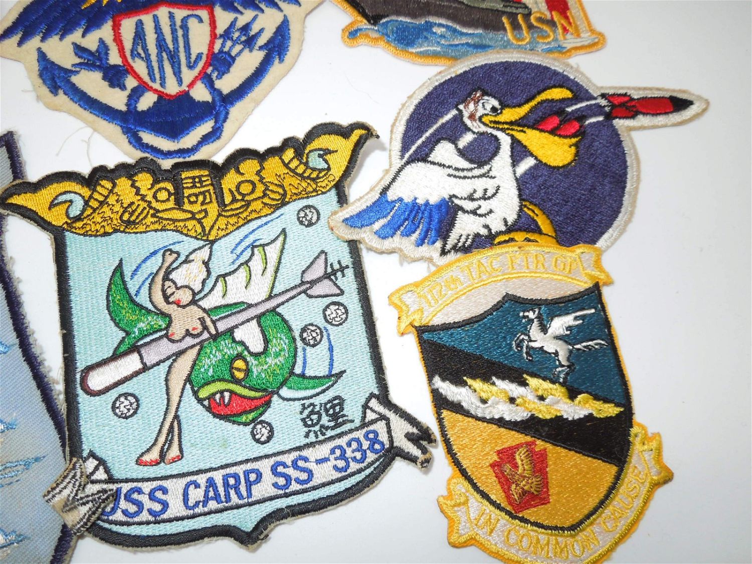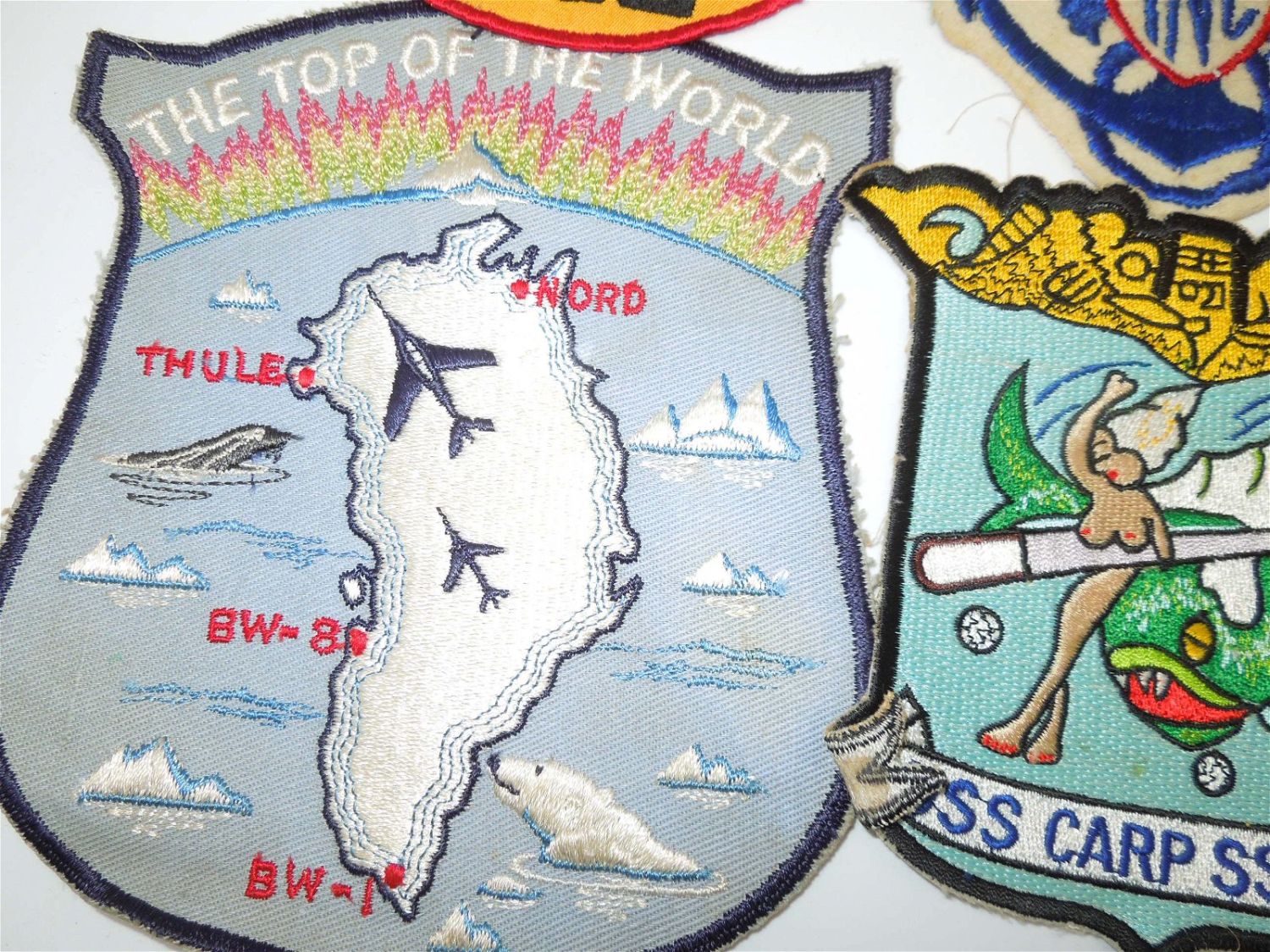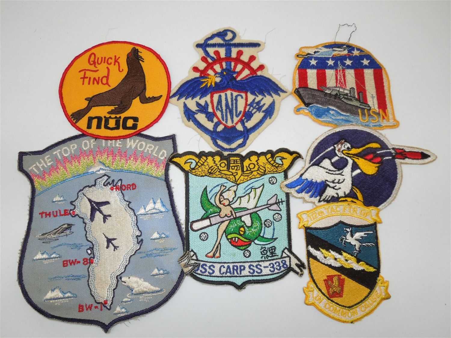 Lot of 7 Vietnam era patches- Top of the World US Air Force patch, 112th TAC Fighter Group, USN PT Boat, USS Carp SS-338, ANC, Quick Find Nog and a Pelican one. Some of these appear to be custom or theater made. Good condition. Scale shown for size reference.