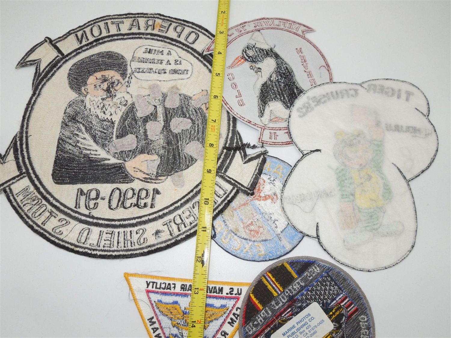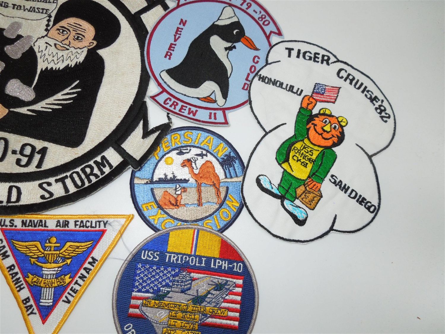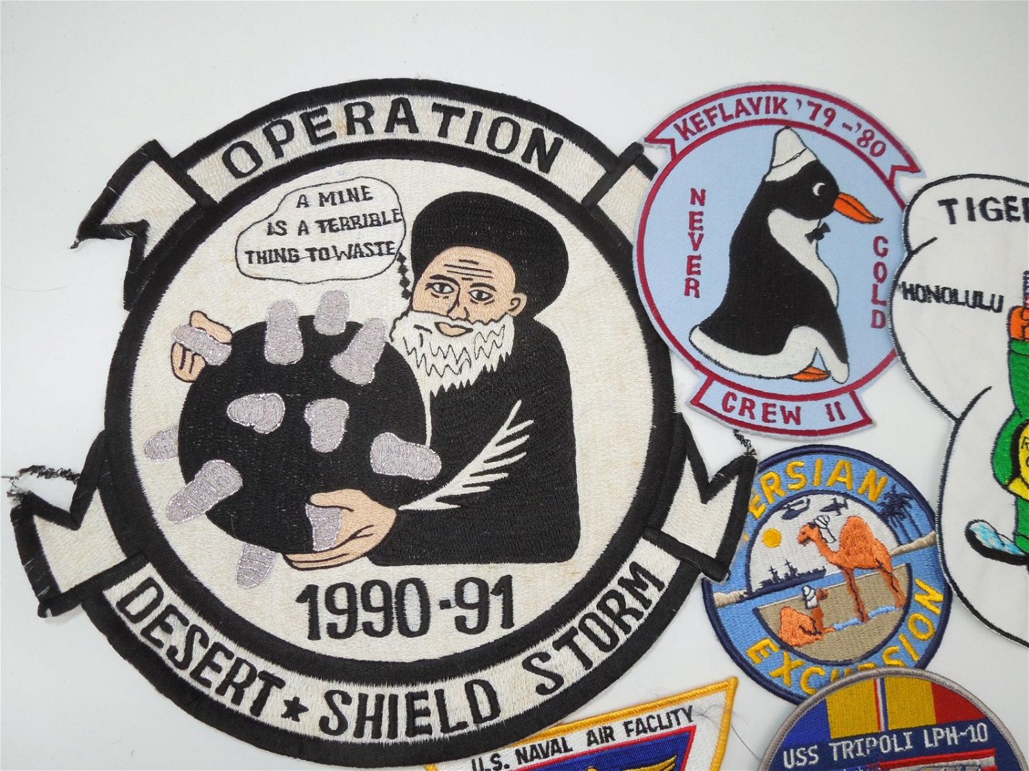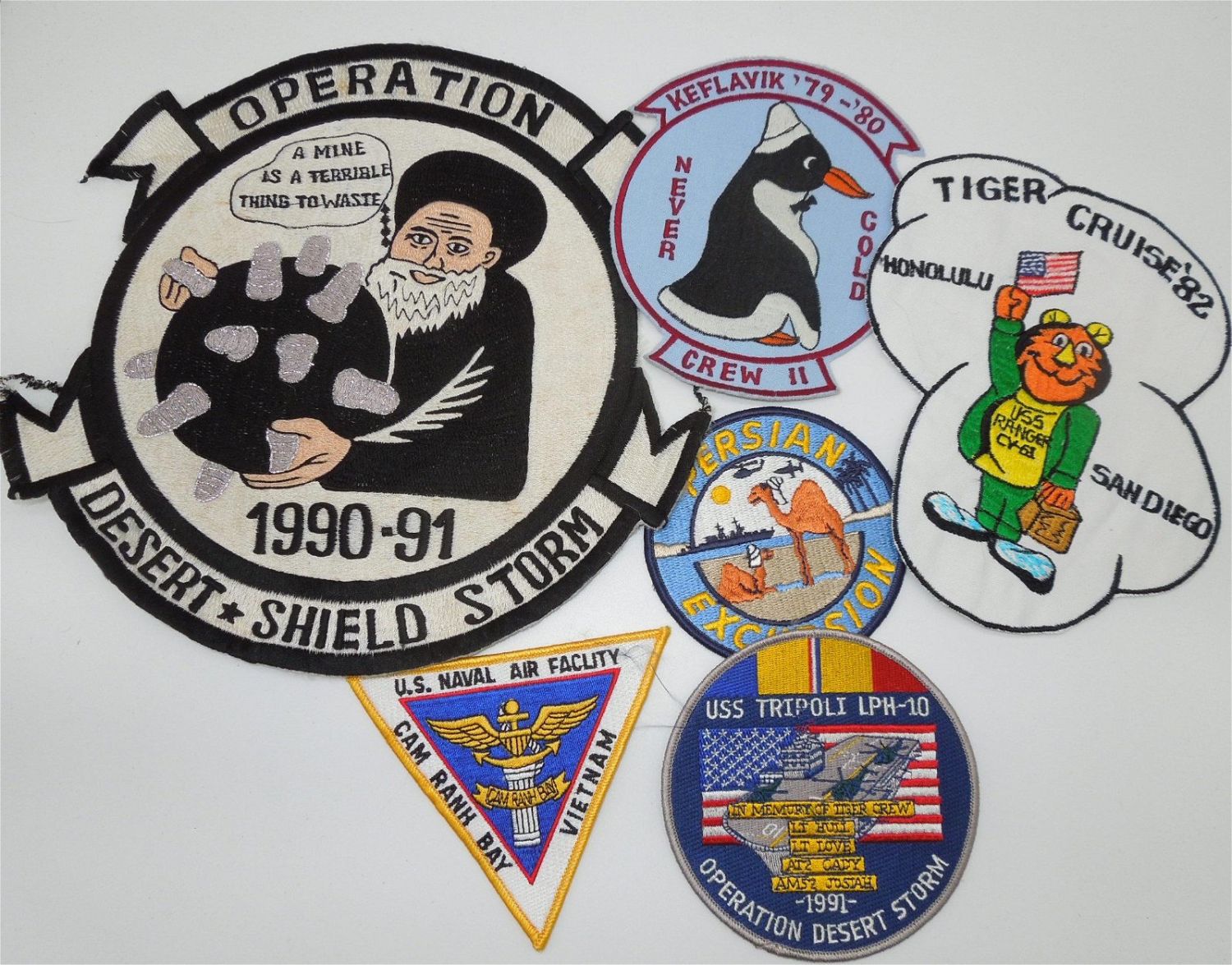 Lot of 1980s to 90s US military patches- Operation Desert Shield Storm 1990-91 A Mine is a Terrible Thing to Waste, Keflavik 79-80 Never Cold Crew II, USS Ranger Tiger Cruise Honolulu San Diego, Persian Excursion, Naval Air Facility Cam Ranh Bay Vietnam, USS Tripoli LPH-10 Desert Storm. Some of these appear to be custom or theater made. Unknown if any are reproductions, so please use the photos as your guide. Good condition.