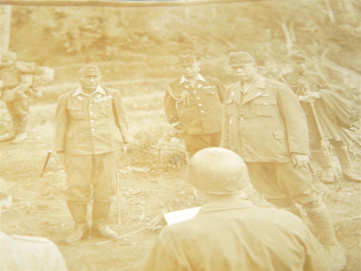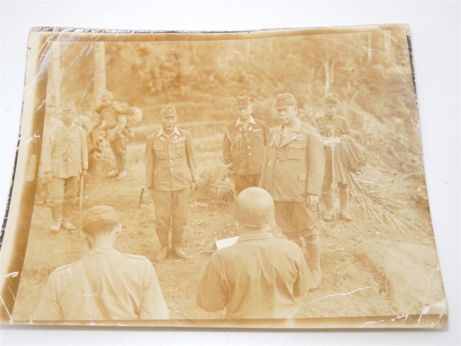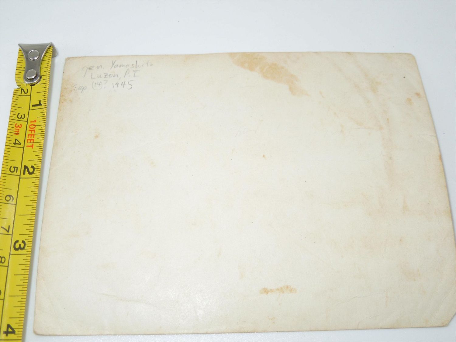 Original photograph measuring just under 4 x 5 inches in size of General Yamashita surrendering Luzon, Philippines in September 1945. His war crimes trial would set legal precendent for command responsibility thereafter. Condition show signs of wear from use and age.