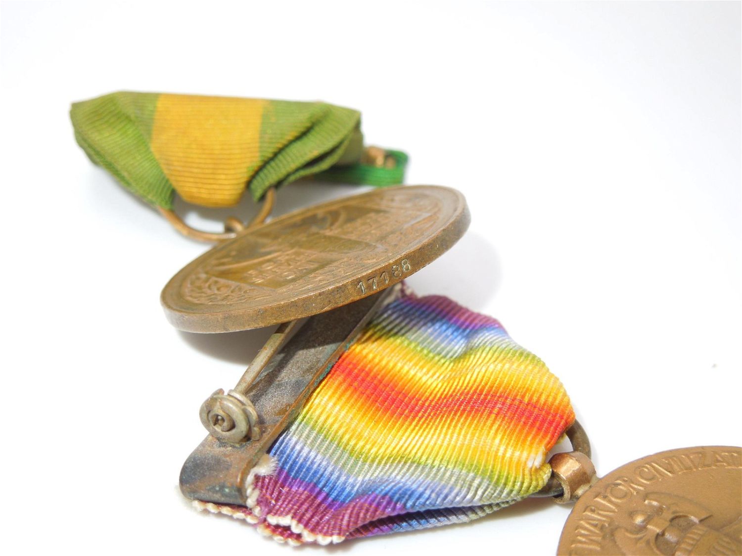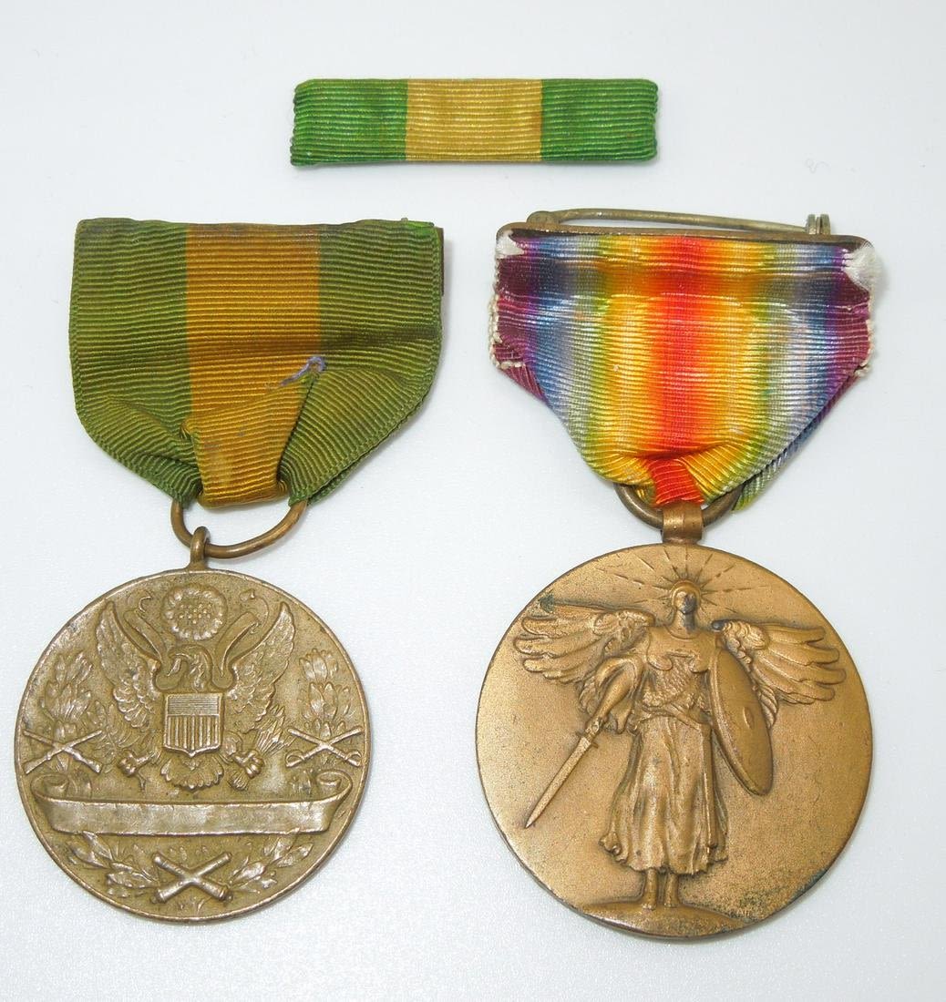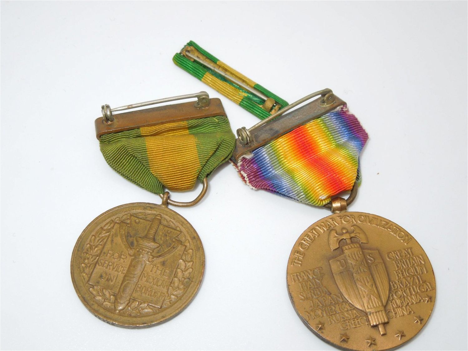 WWI US Army Mexican Border Service & Victory Medal Ribbon Lot. You will receive a Mexican Service Border Medal numbered on the rim 17188, ribbon bar and a WWI Victory Medal. Named to: J.E. Benson, New Haven, CT. Good condition for their ages.