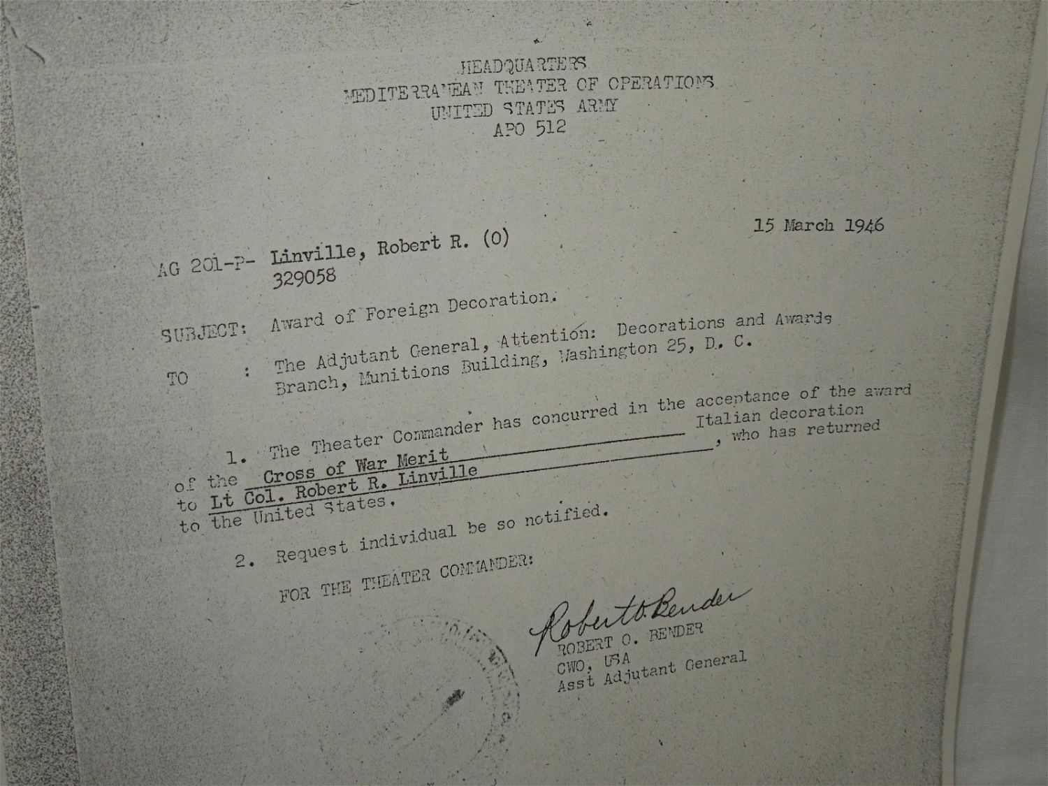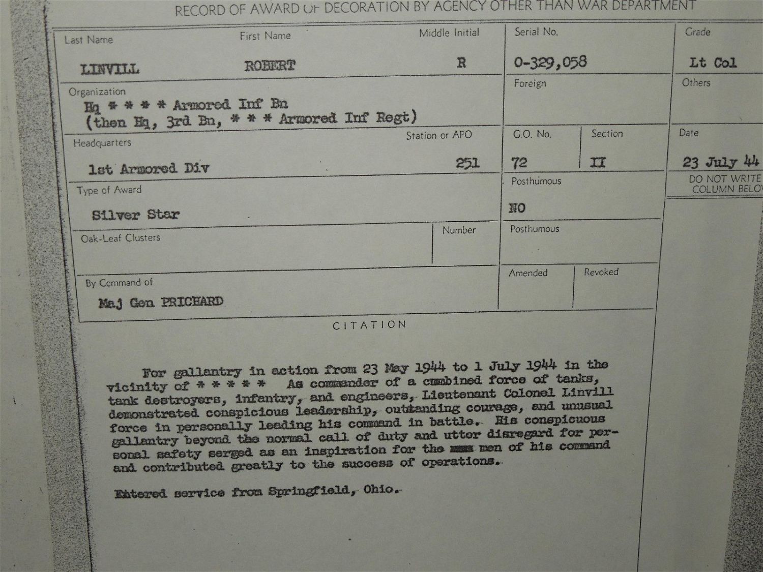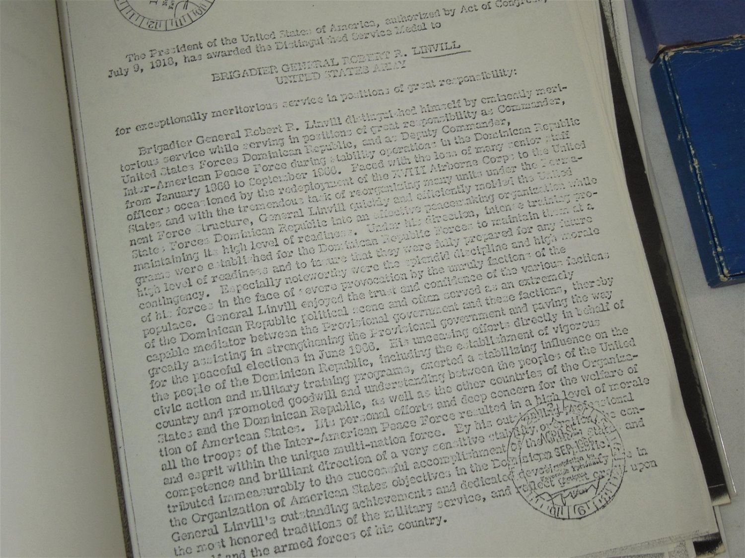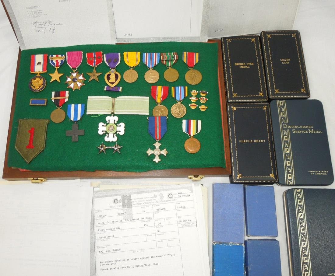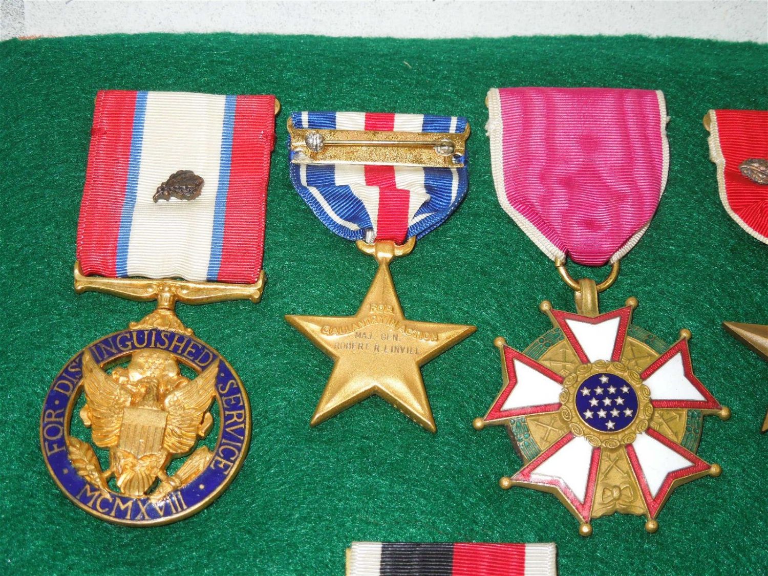 WWII – 70s Medal group of US Army Major General Robert R. Linvill. In WWII he was a Battalion Commander in the 6th Armored Infantry Regiment, 1st Armored Division to include Operation Torch in North Africa, through to Italy. Post war, he commanded US Forces Dominican Republic, was Deputy Commanding General of the XVIII Airborne Corps, CG of the 24th Infantry Division, and then Commanding General of the 1st Infantry Division from 1970-1971. Group includes his 1960’s -70’s issued WWII Silver Star with his rank on it, US and foreign medals, medal boxes as shown, and a comprehensive packet of research to include many copies of his award citations. Good condition overall. The photo portrait of him is digital only; No hard copy included.