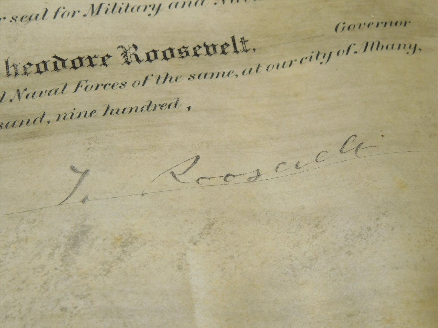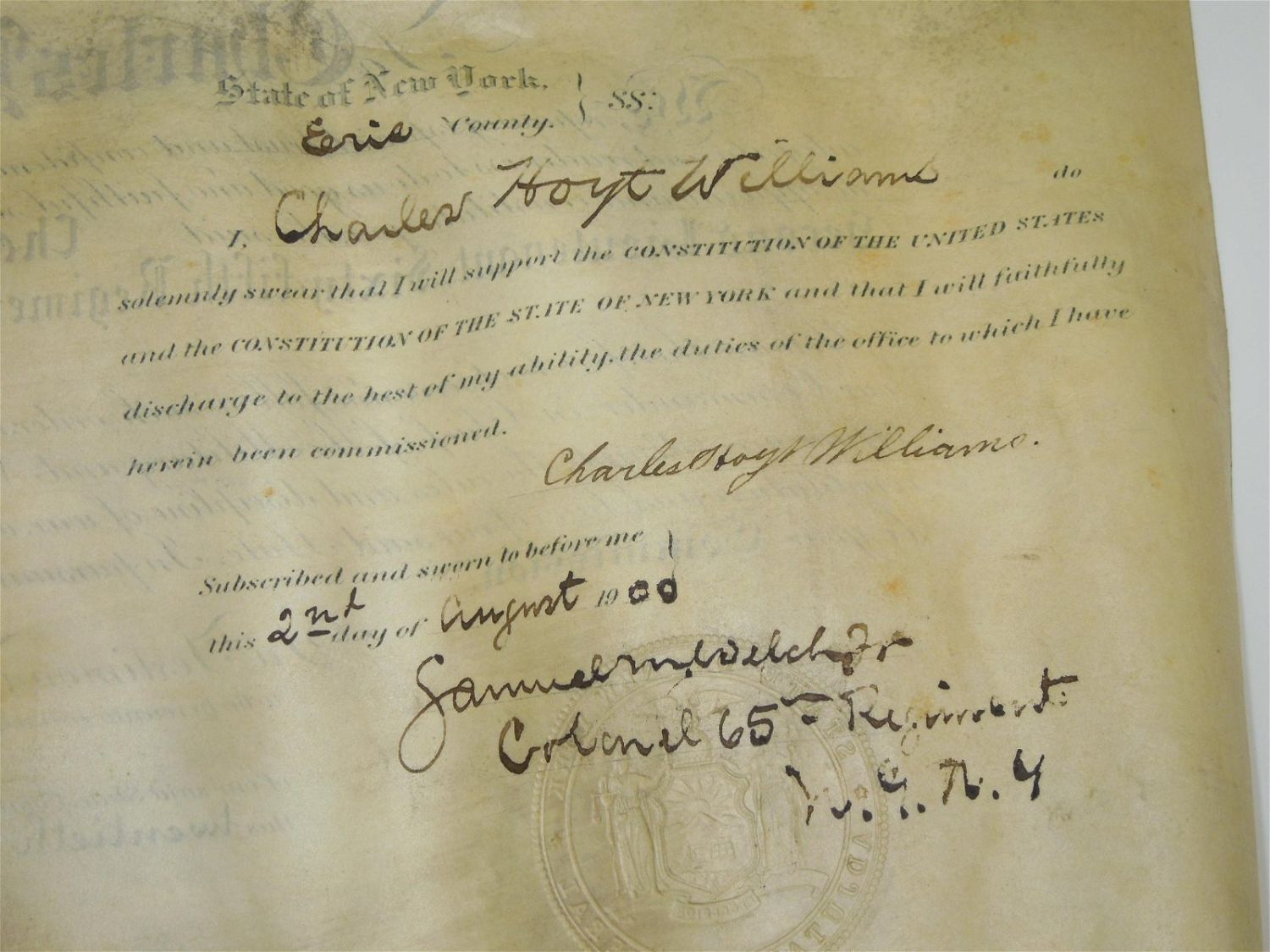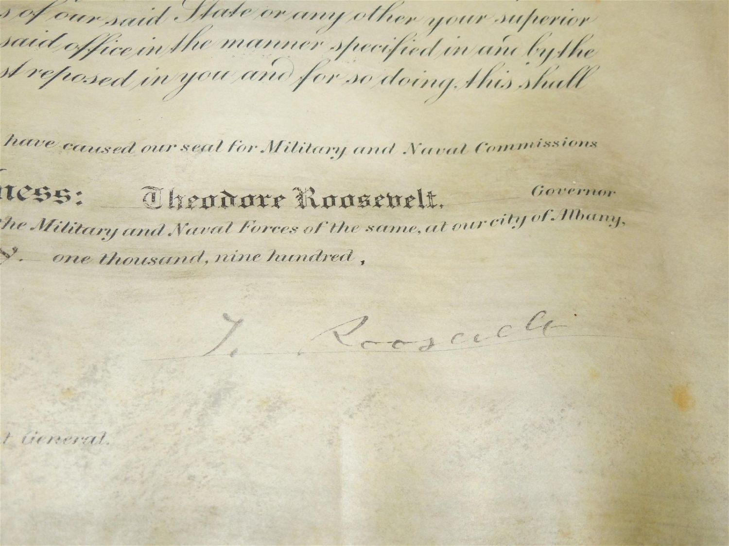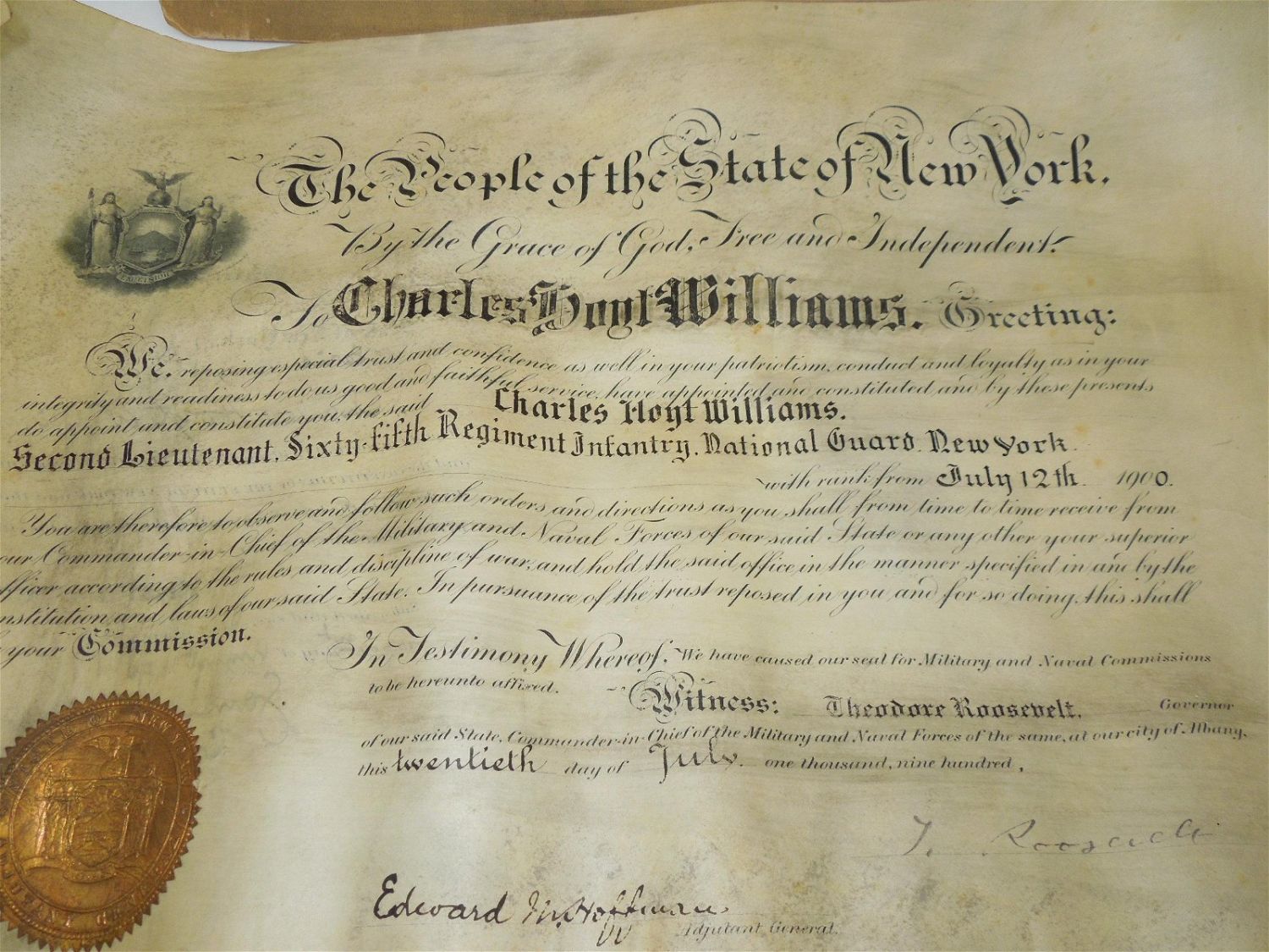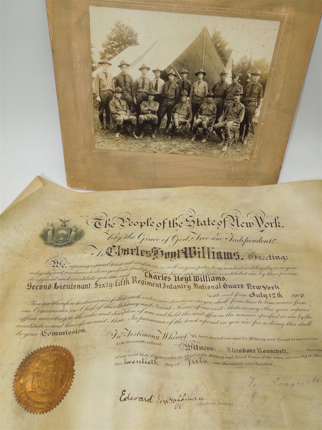 Original 1900 Theodore Roosevelt Signed 65th NY Infantry Document & Photo Lot. Named to Charles Hoyt Williams and signed by Theodore Roosevelt. This promotion commission document reads, Williams name and “Second Lieutenant Sixth-Fifth Regiment Infantry, National Guard New York”. Document size is 12 x 18.5 inches. The size of the photograph is 10.75 x 12 inches. The photo itself is good. The frame has rounded corners. Nice condition for their ages.
