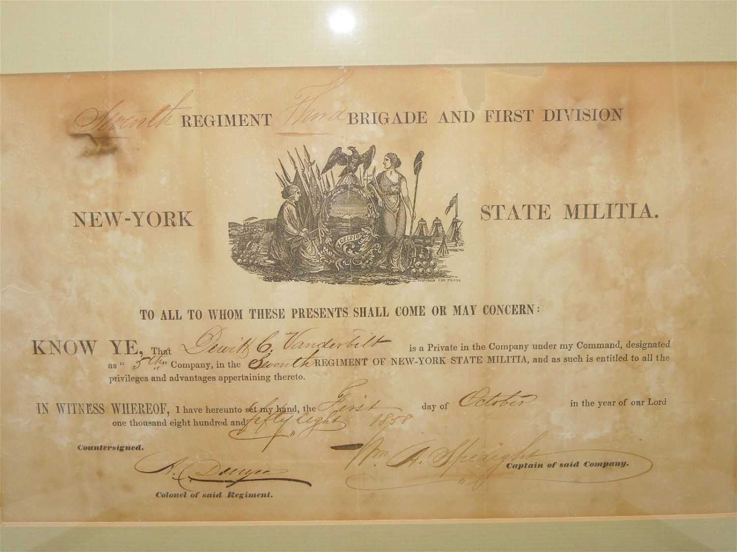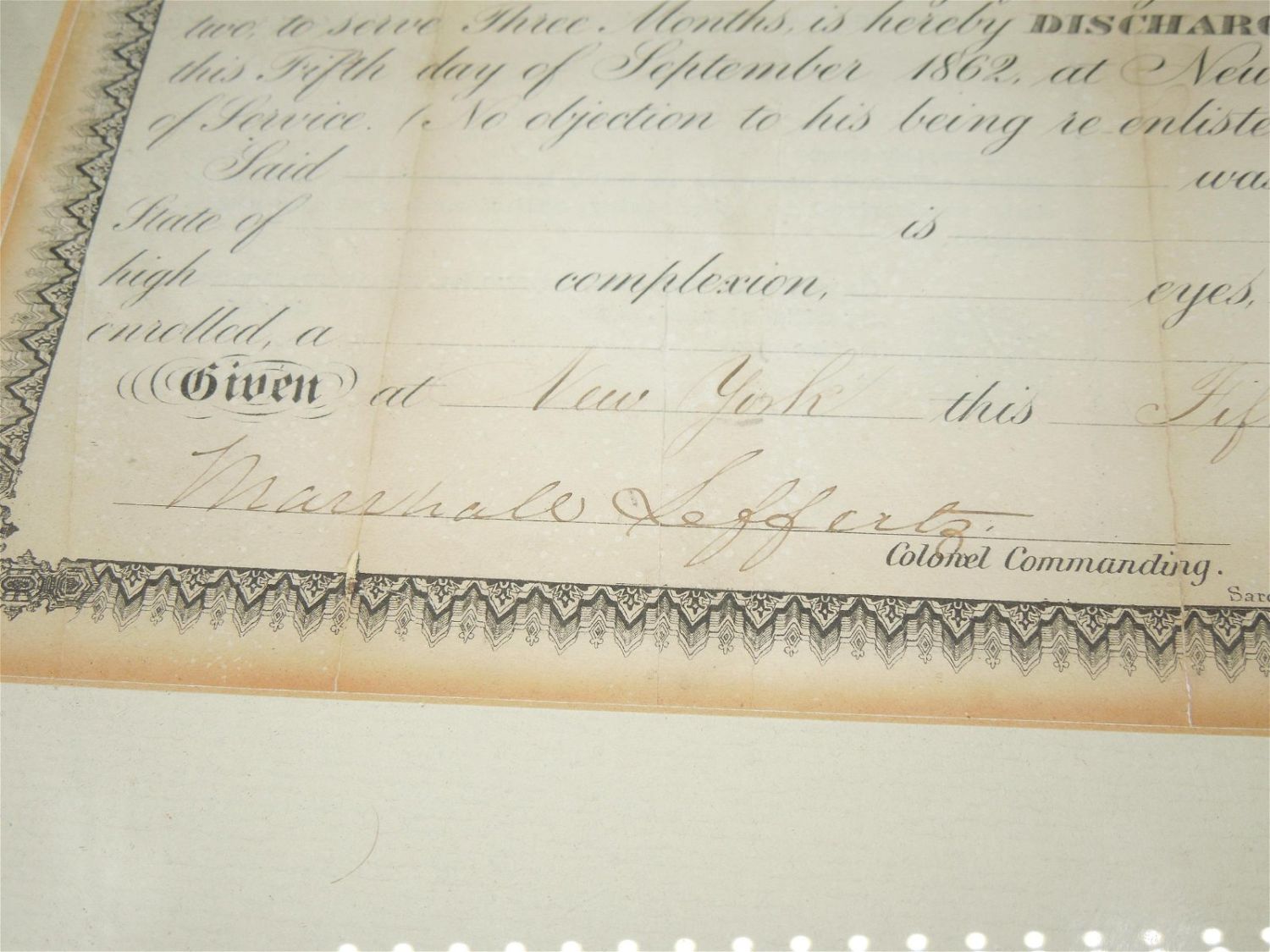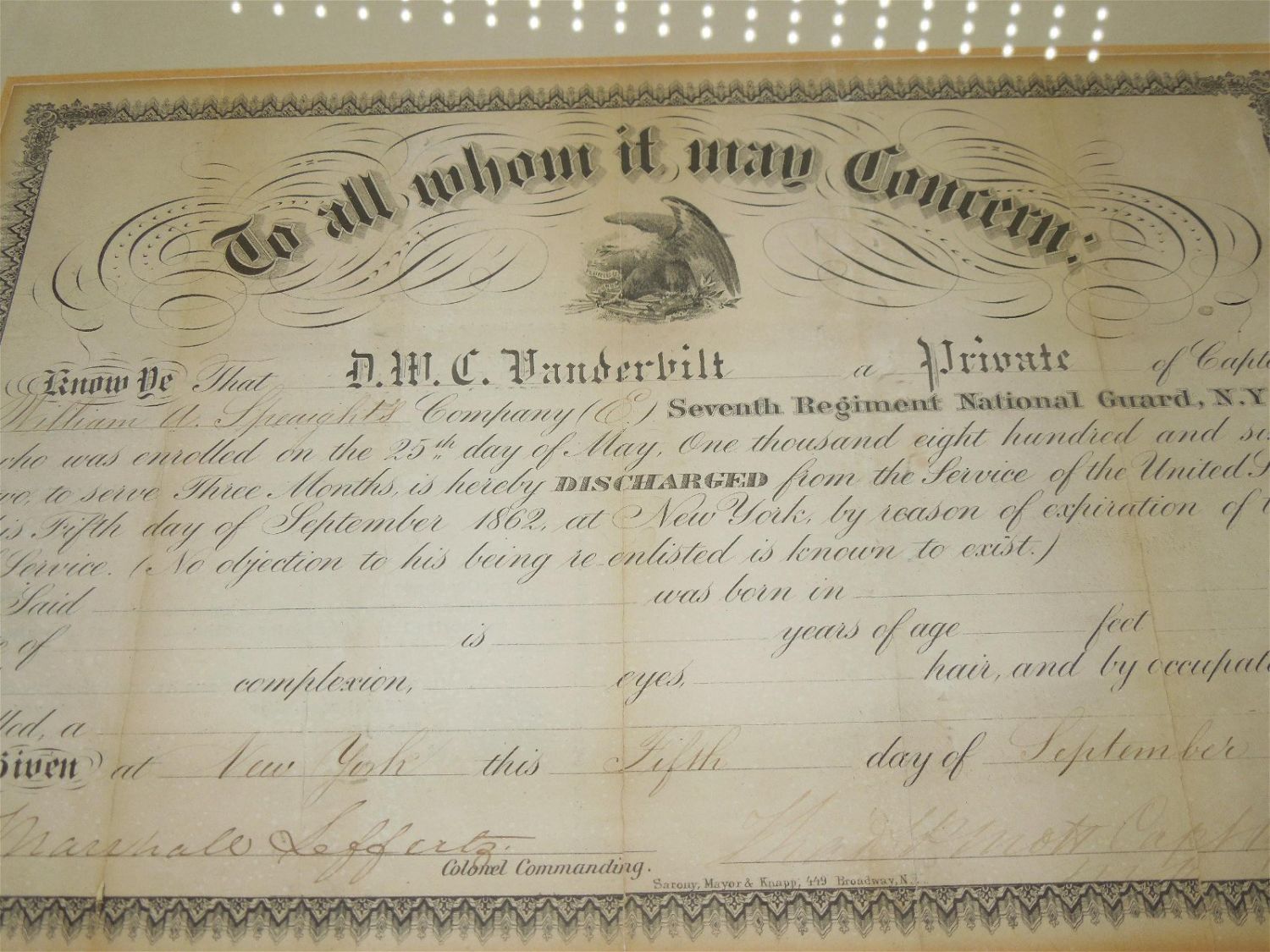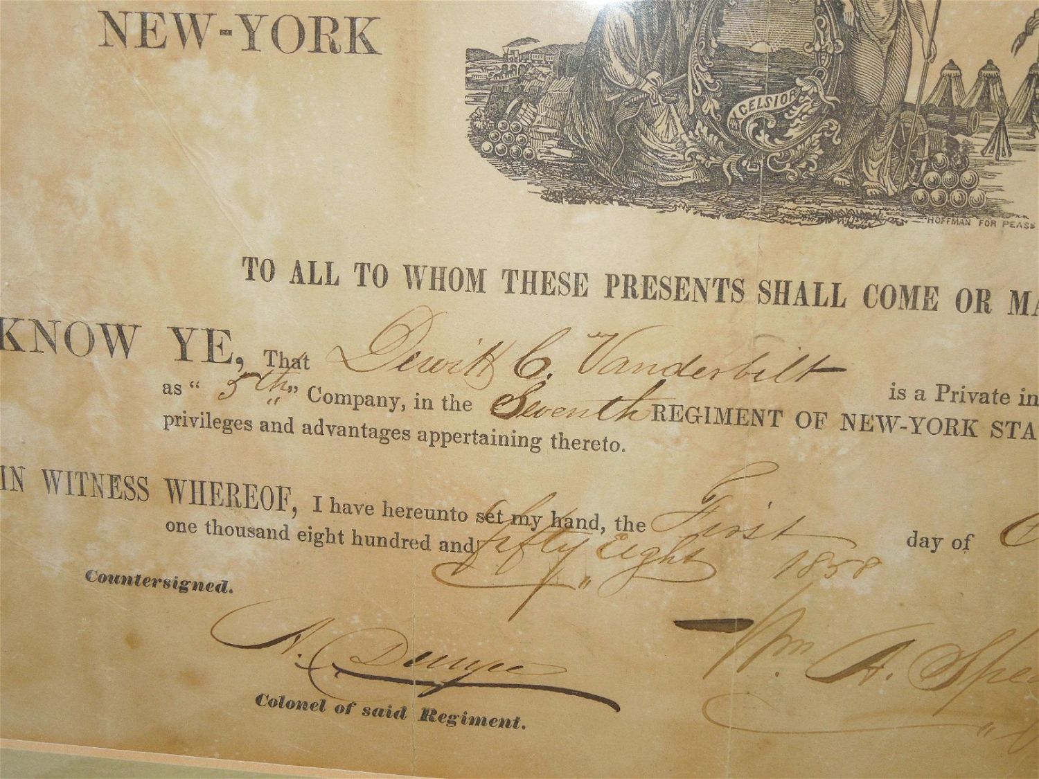 Civil War 7th New York Regiment Militia Enlistment & Discharge Documents Lot of 2. Named to Dewitt C. Vanderbilt who died in 1865 at age 34. You will receive the following: 1856 New York State Militia 7th Regiment, 3rd Brigade and 1st Division Private enlistment document. This document is nicely framed, but shows wear and foxing from age. Also, a piece of the document is missing at the top. The other framed document is a 1862 Discharge 7th Regiment National Guard New York State document. Signed by Colonel Marshall Lefferts. Information obtained from the internet will come with this document. Nicely framed document with foxing from age.