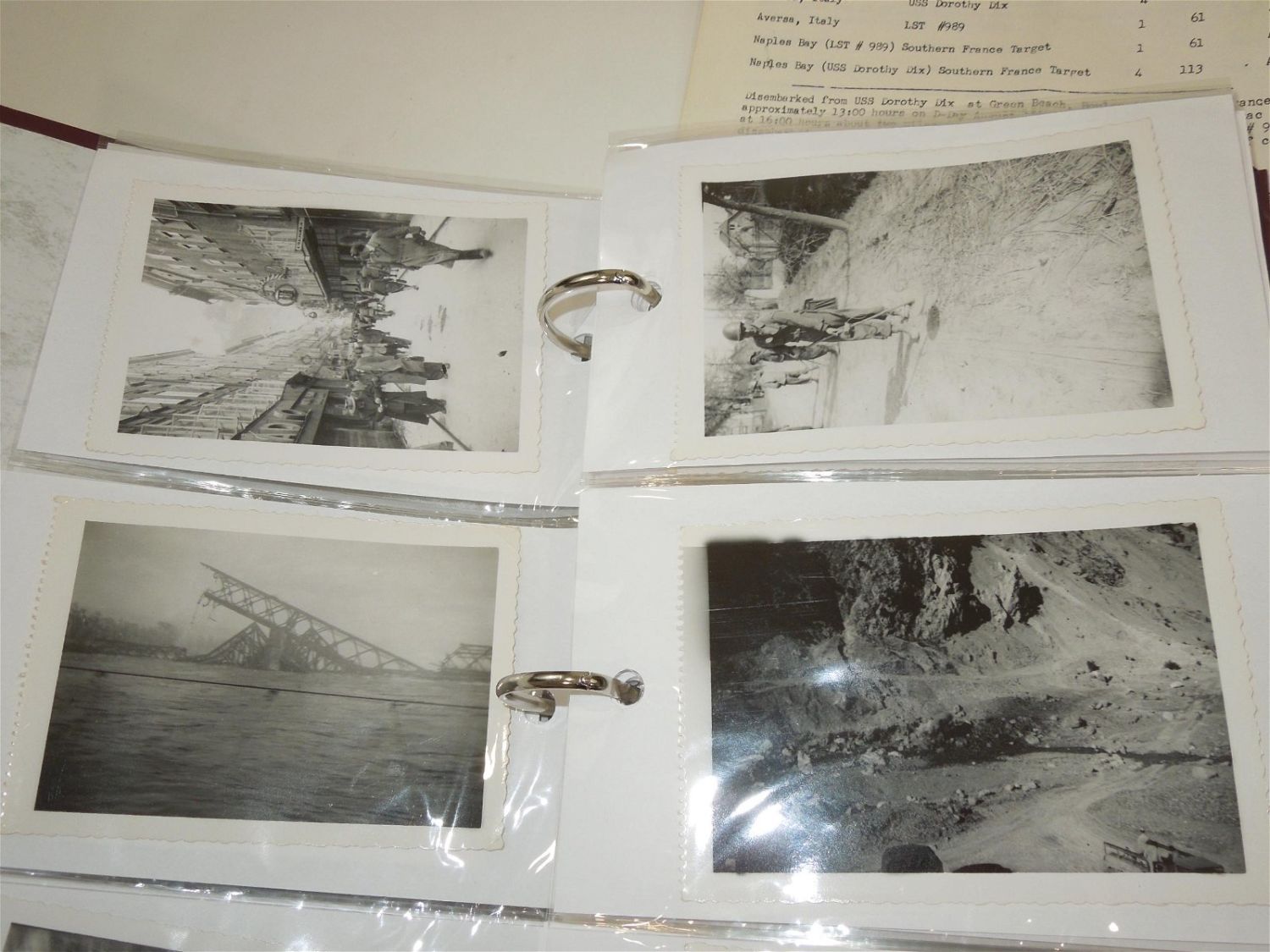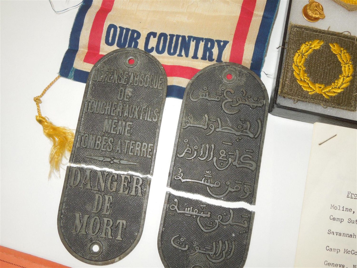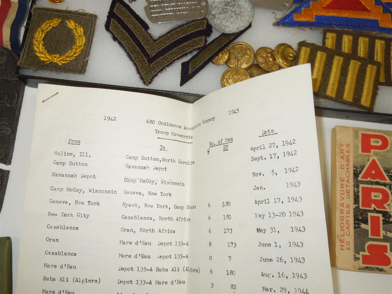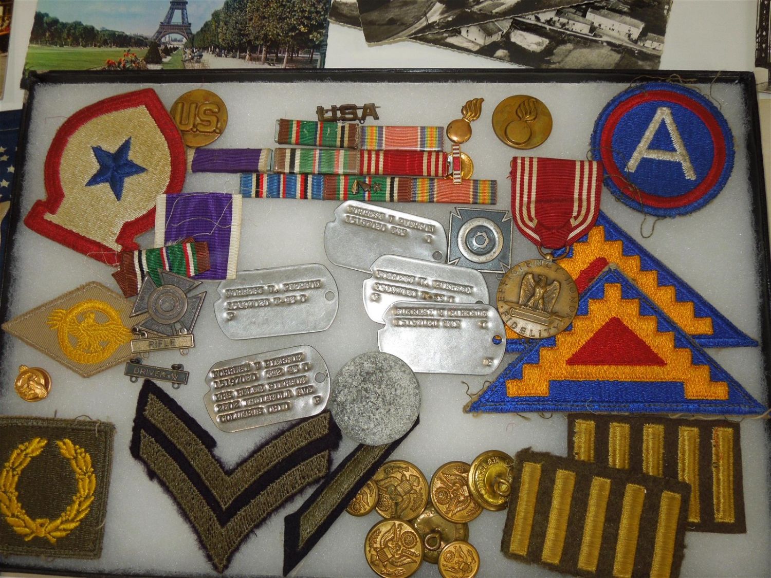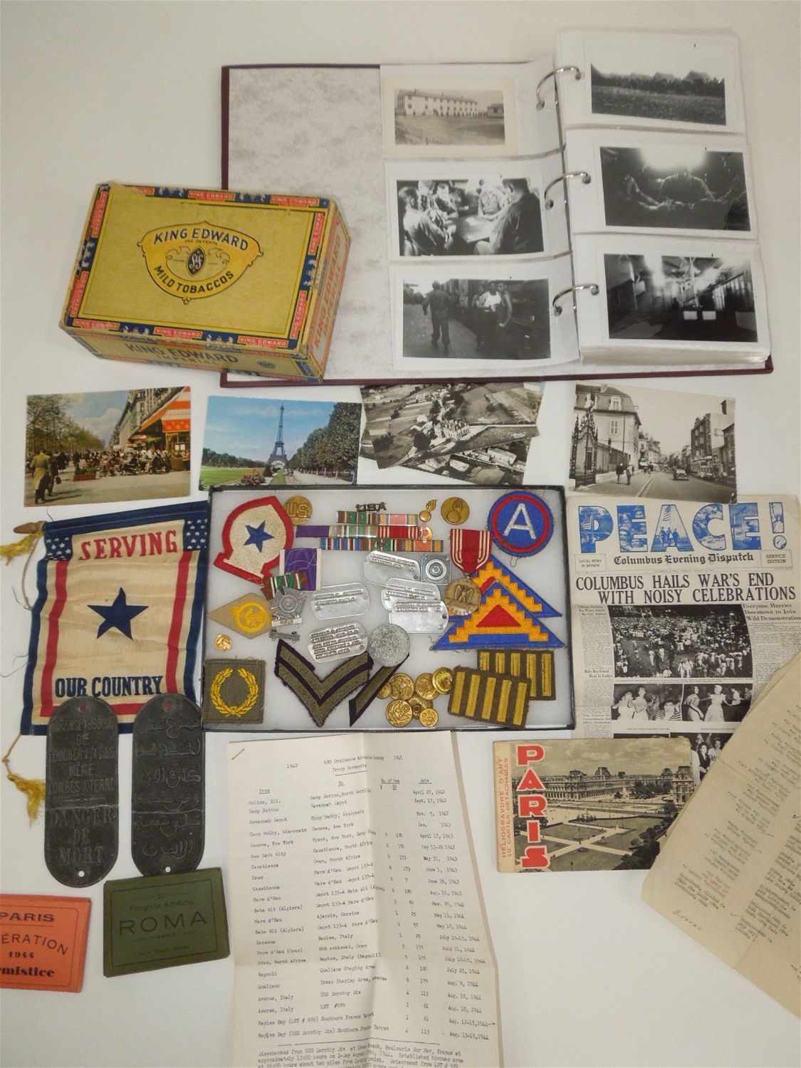 WWII US Army North Africa Italy Invasion Soldier Archive Dog Tags German Souvenirs. Named to Forrest V. Pierson who was attached to the 680th Ordinance Ammunition Company during WWII. In this group is a paper that reads the Troop Movements from 1942-1945. This group includes some of the following: German items include: 1938 KREISTAG WETTERAU BADGE Marked, “Wilh.A.Jäger Frankfurt A.M.” with pin-back device (poor condition) and German Metal Plates, dog tags (5), Good Conduct Medal and Lapel Pin, Ordnance collar Insignia, sterling mark man badge plus another badge, Ribbon bars (some coated in plastic with battle stars and arrow heads), a Purple Heart ribbon bar and fabric ribbon, patches (3rd Army, 7th Army & North African Theater), 200 plus photos (some photos describe the photo on the reverse), Son in Service banner, overseas bars, buttons, post cards, plus much more. Good and varying conditions for their ages. This a great group worthy of research. The display case does not come with these items.