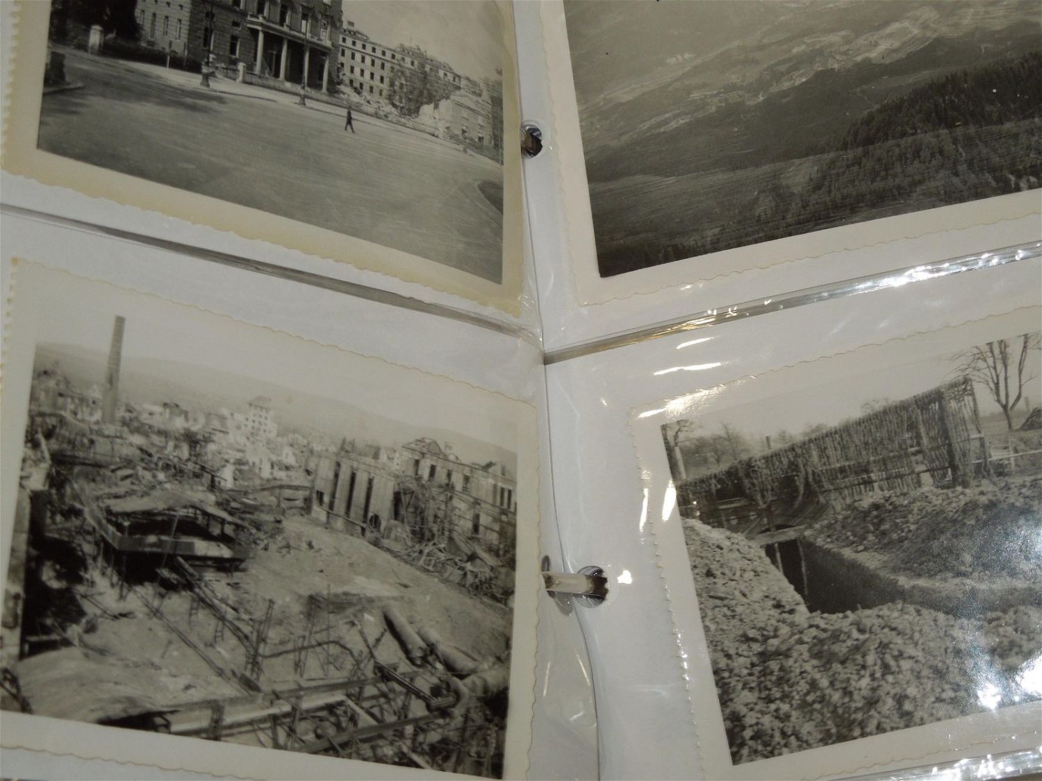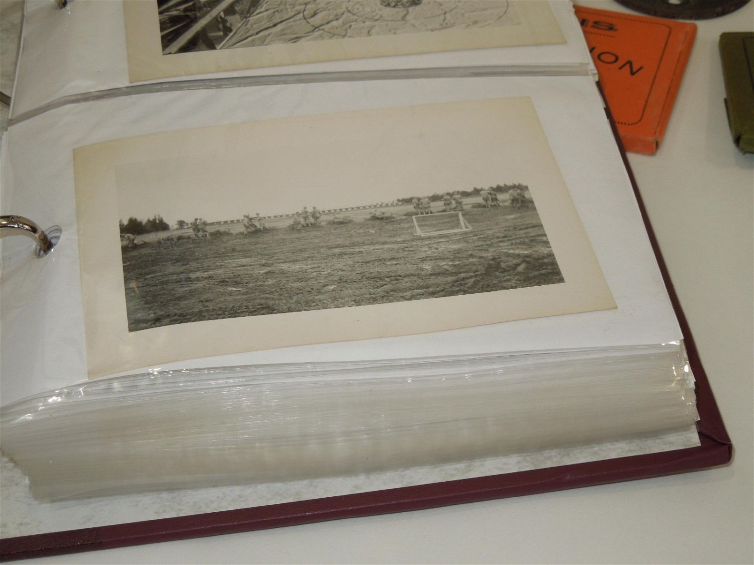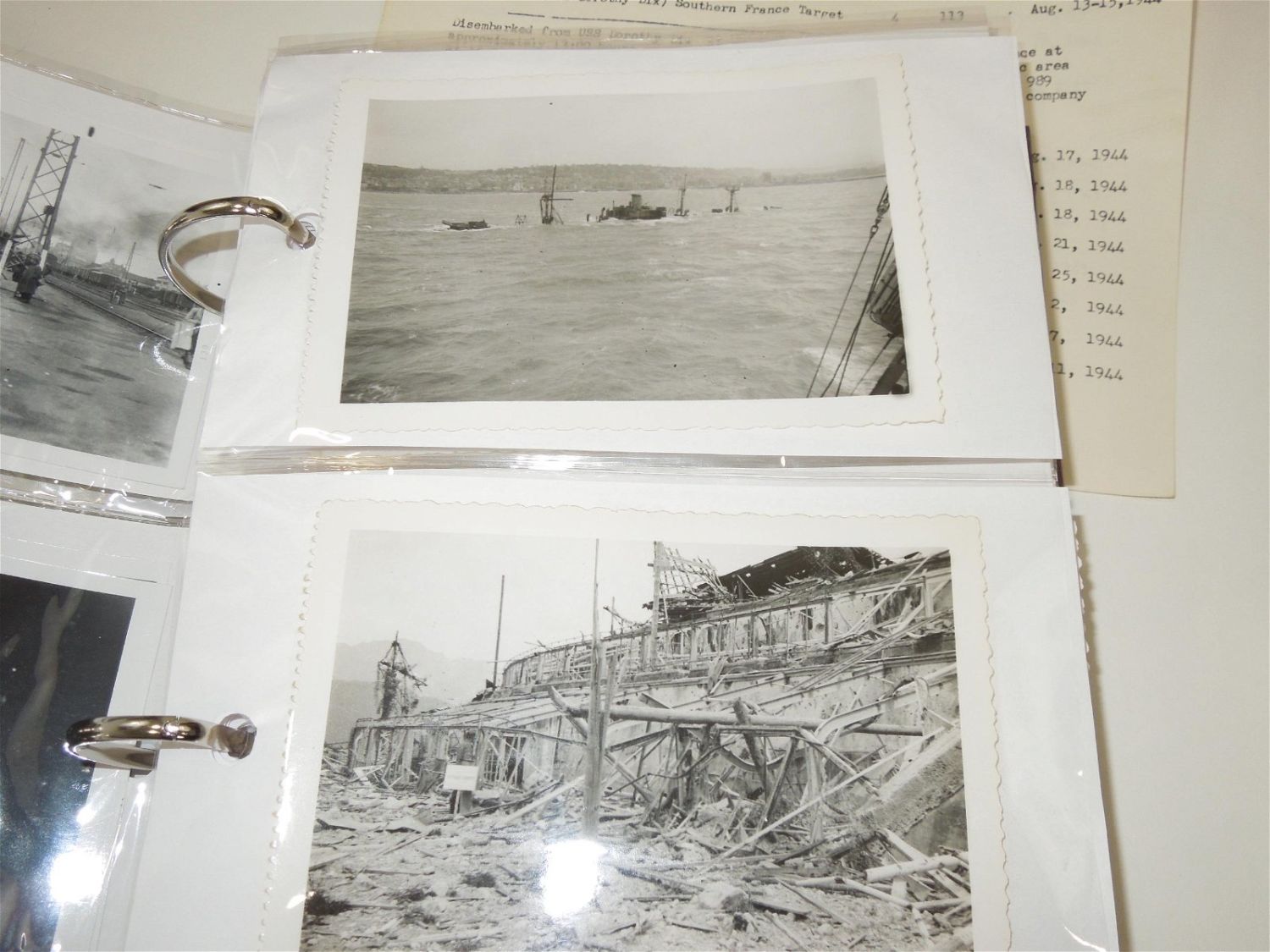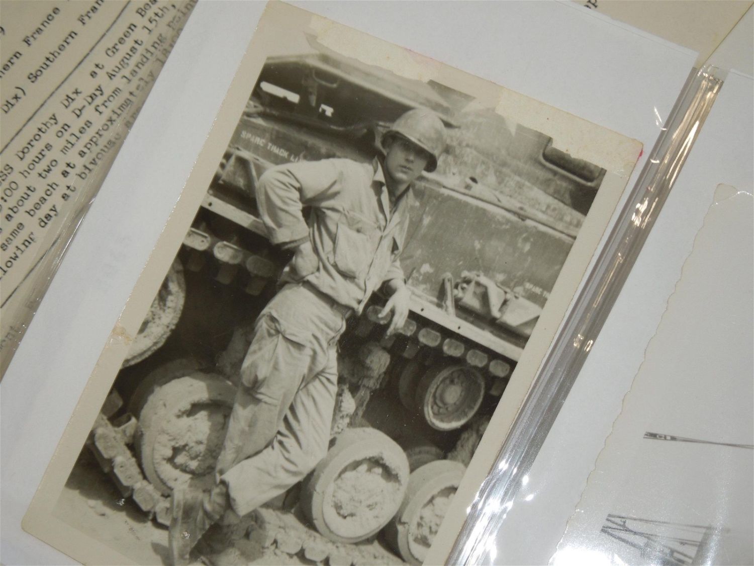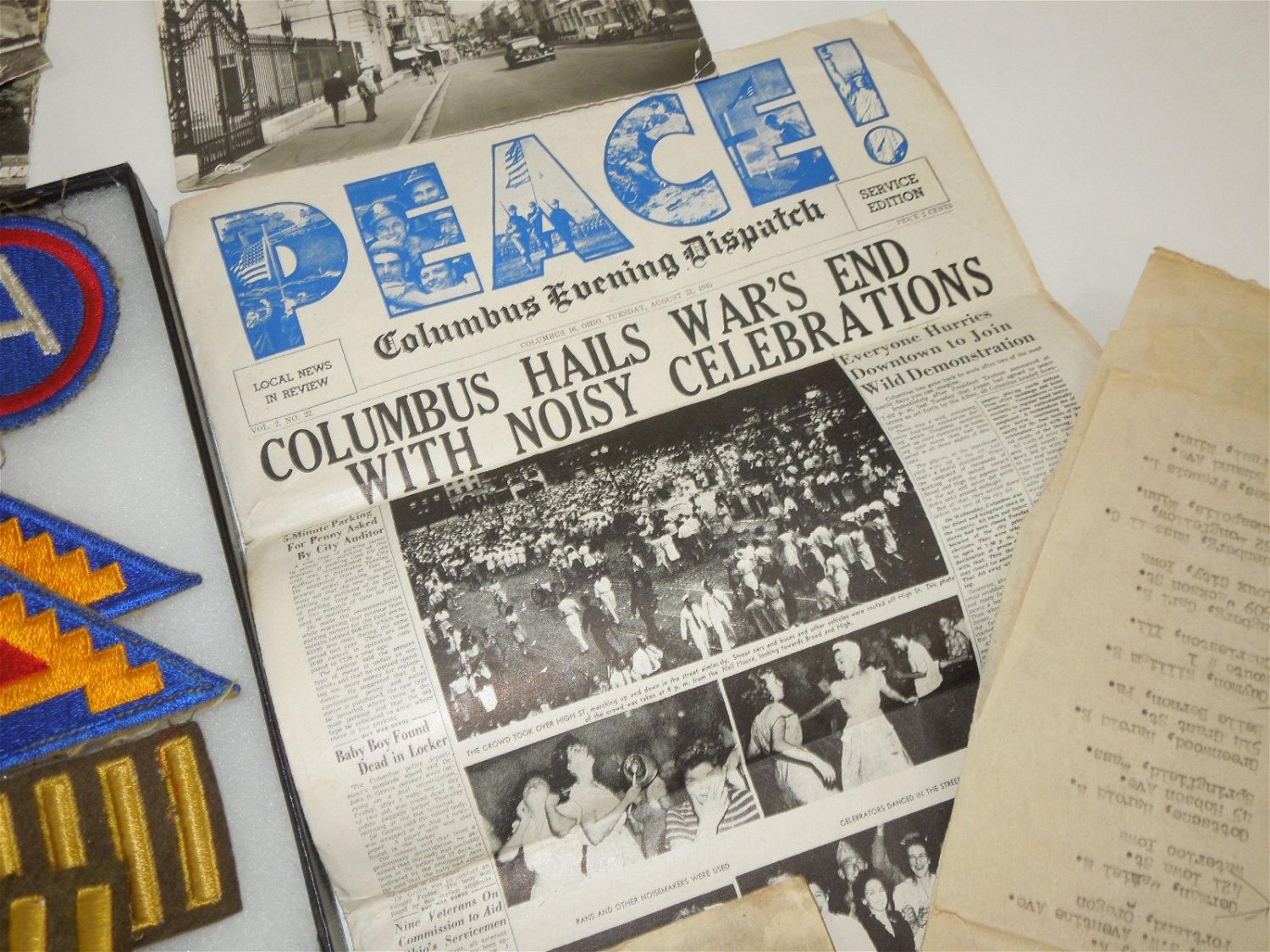 WWII US Army North Africa Italy Invasion Soldier Archive Dog Tags German Souvenirs. Named to Forrest V. Pierson who was attached to the 680th Ordinance Ammunition Company during WWII. In this group is a paper that reads the Troop Movements from 1942-1945. This group includes some of the following: German items include: 1938 KREISTAG WETTERAU BADGE Marked, “Wilh.A.Jäger Frankfurt A.M.” with pin-back device (poor condition) and German Metal Plates, dog tags (5), Good Conduct Medal and Lapel Pin, Ordnance collar Insignia, sterling mark man badge plus another badge, Ribbon bars (some coated in plastic with battle stars and arrow heads), a Purple Heart ribbon bar and fabric ribbon, patches (3rd Army, 7th Army & North African Theater), 200 plus photos (some photos describe the photo on the reverse), Son in Service banner, overseas bars, buttons, post cards, plus much more. Good and varying conditions for their ages. This a great group worthy of research. The display case does not come with these items.