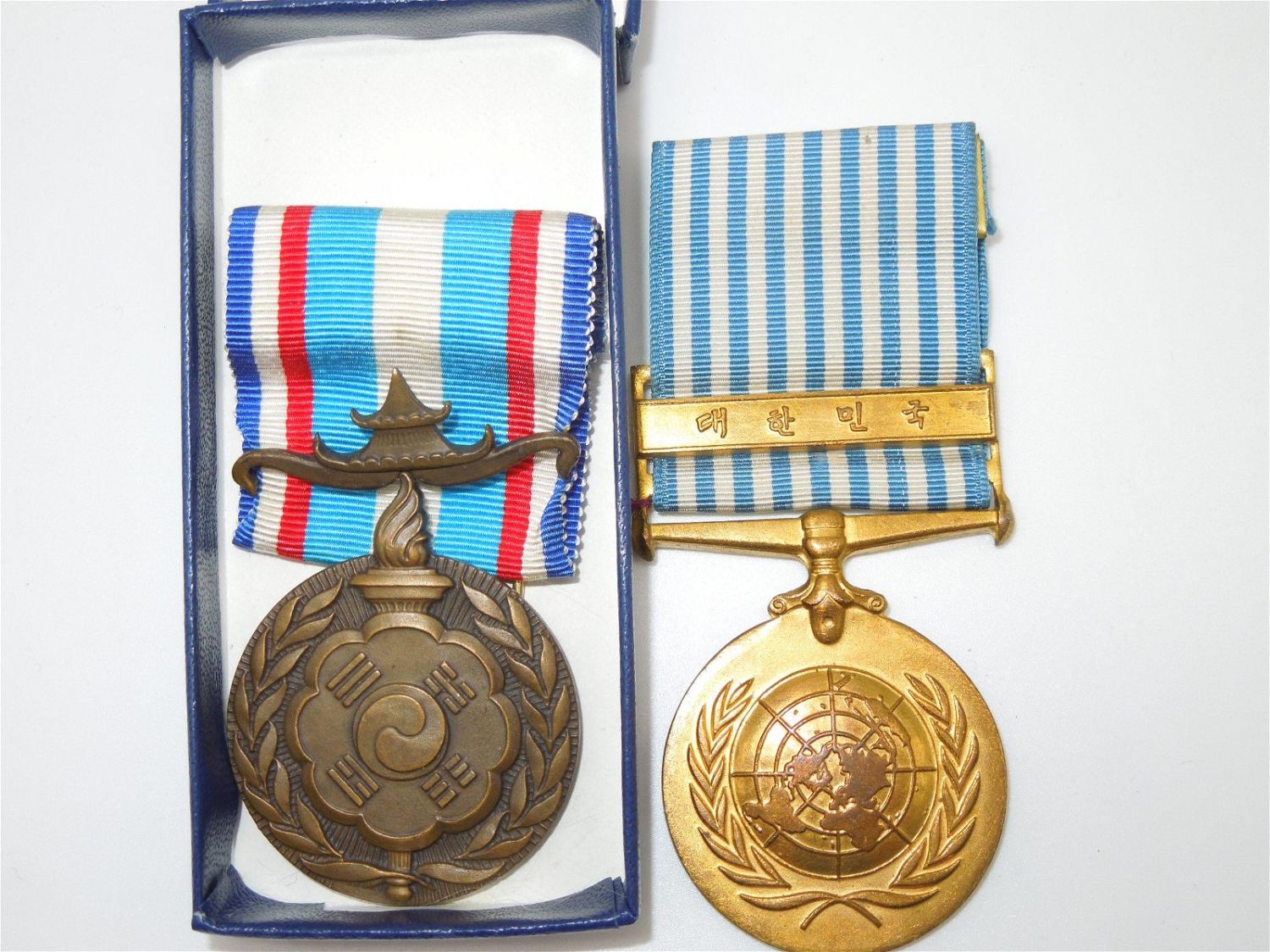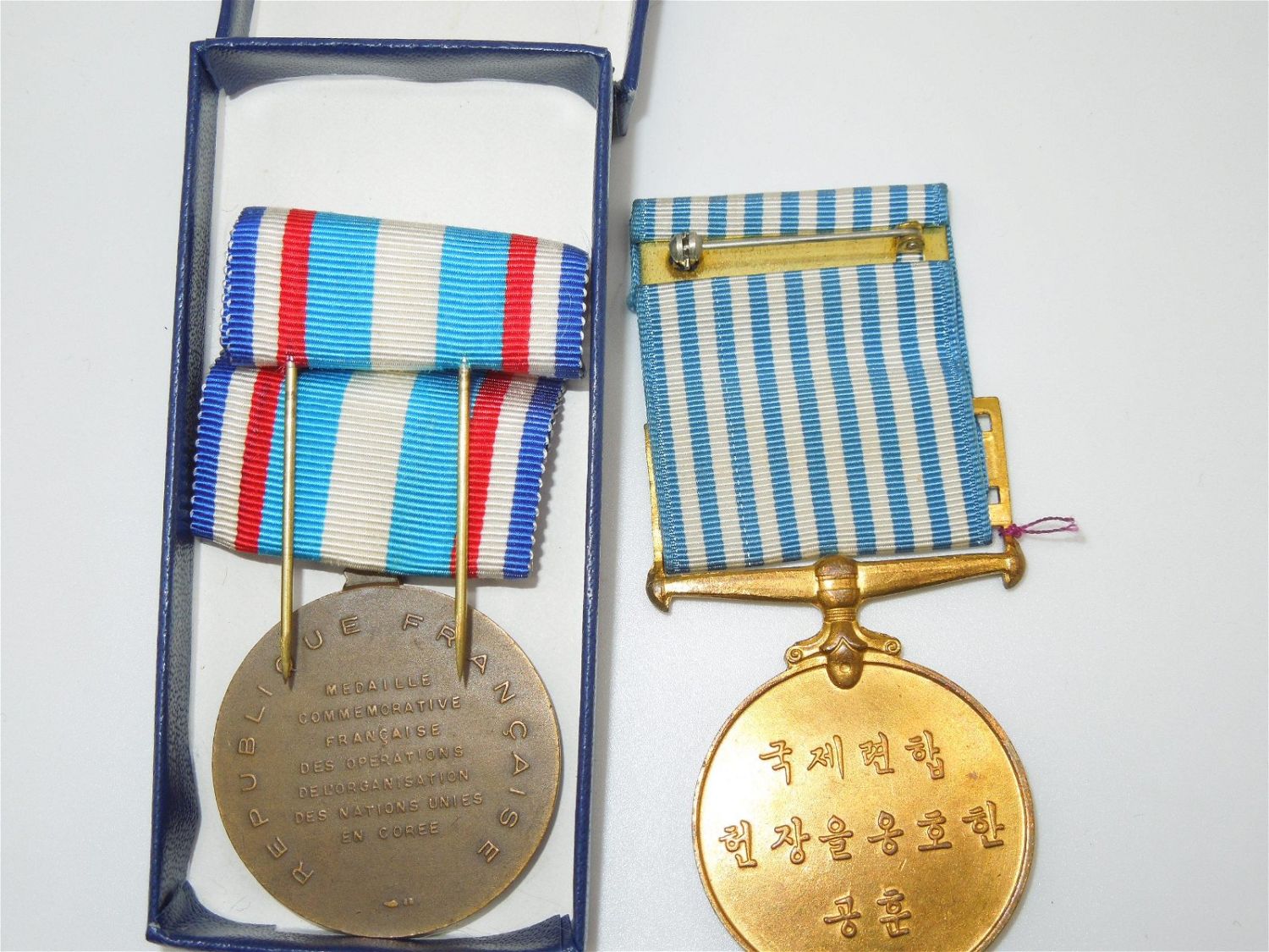 Lot of two original medals- UN Korea service with Korean Script, and a French Korean War medal in box. Good condition.