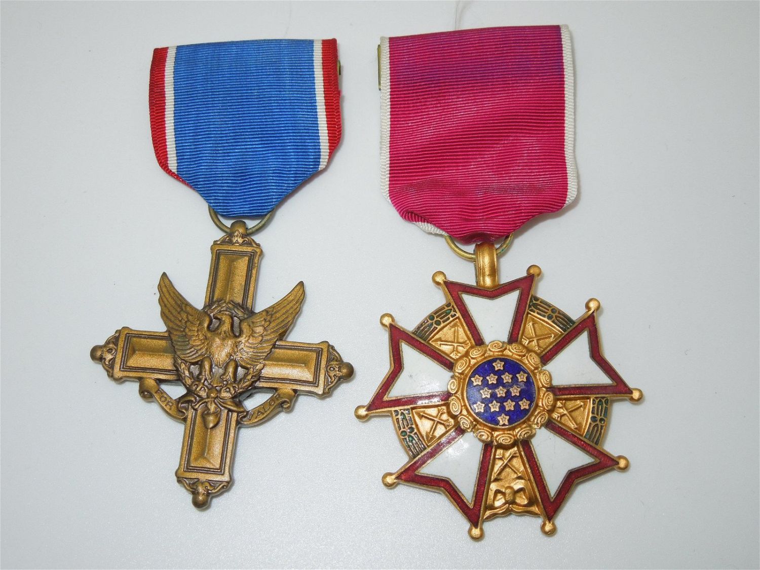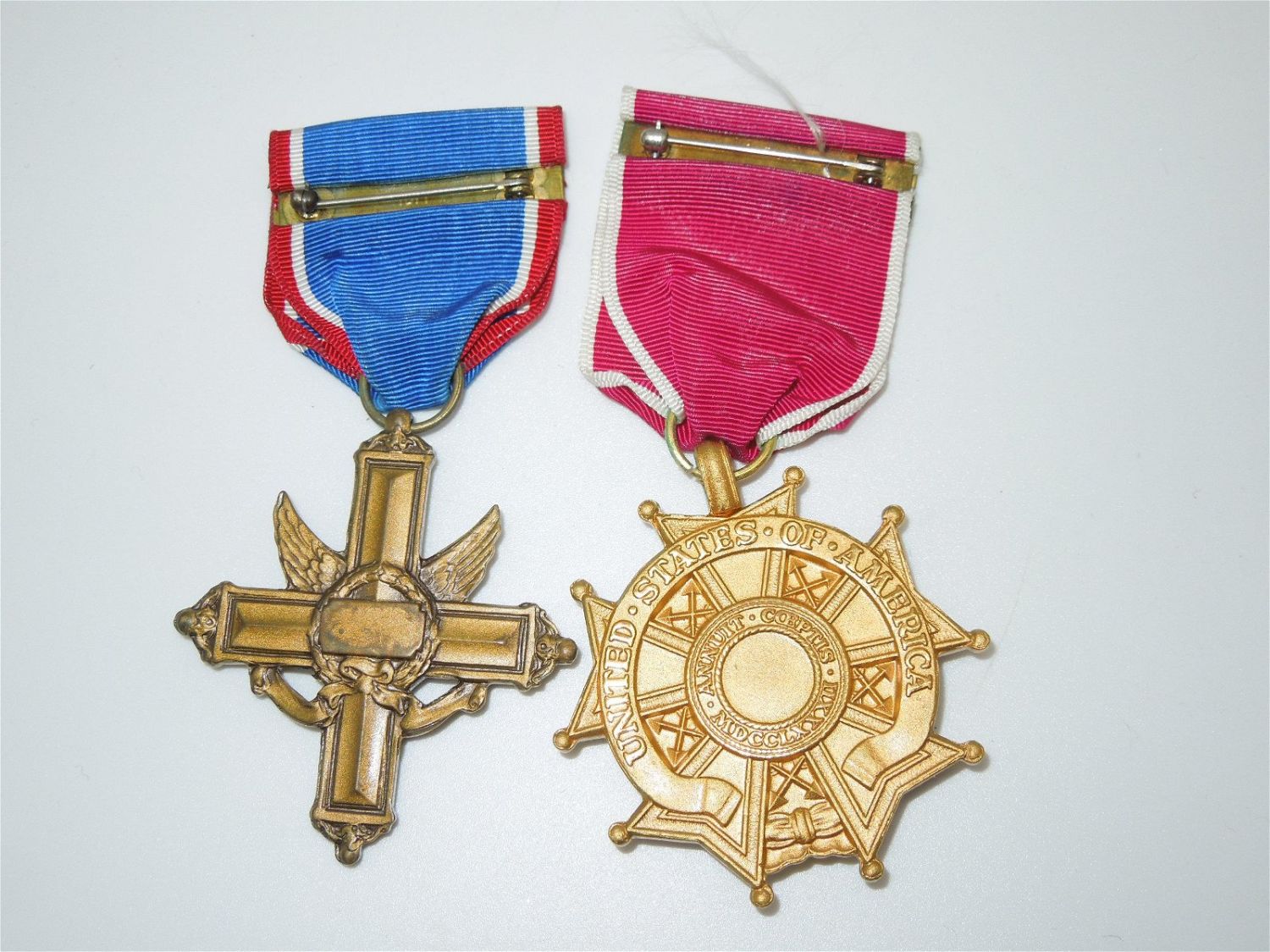Lot of two modern crimp brooch medals as shown. The LOM has some staining on the red ribbon. The DSC and LOM are both made by LIGI (Lordship Industries).
