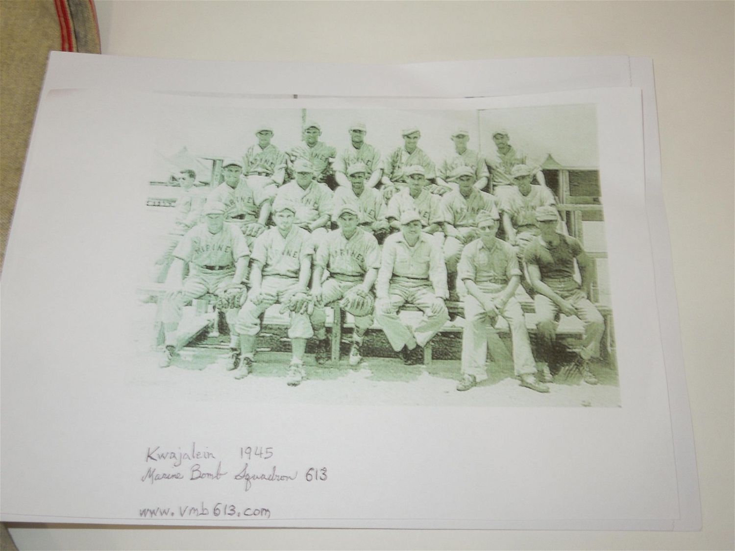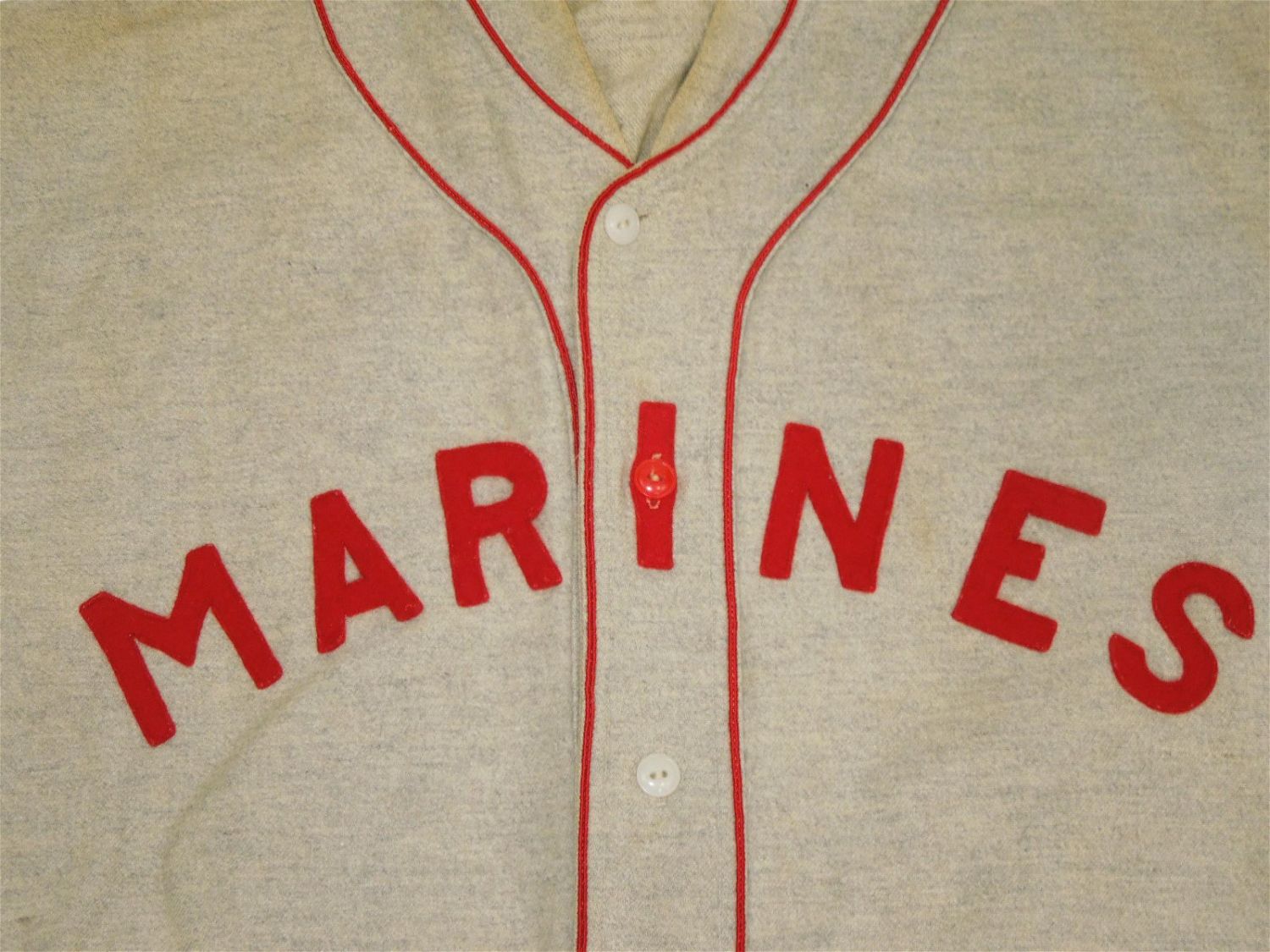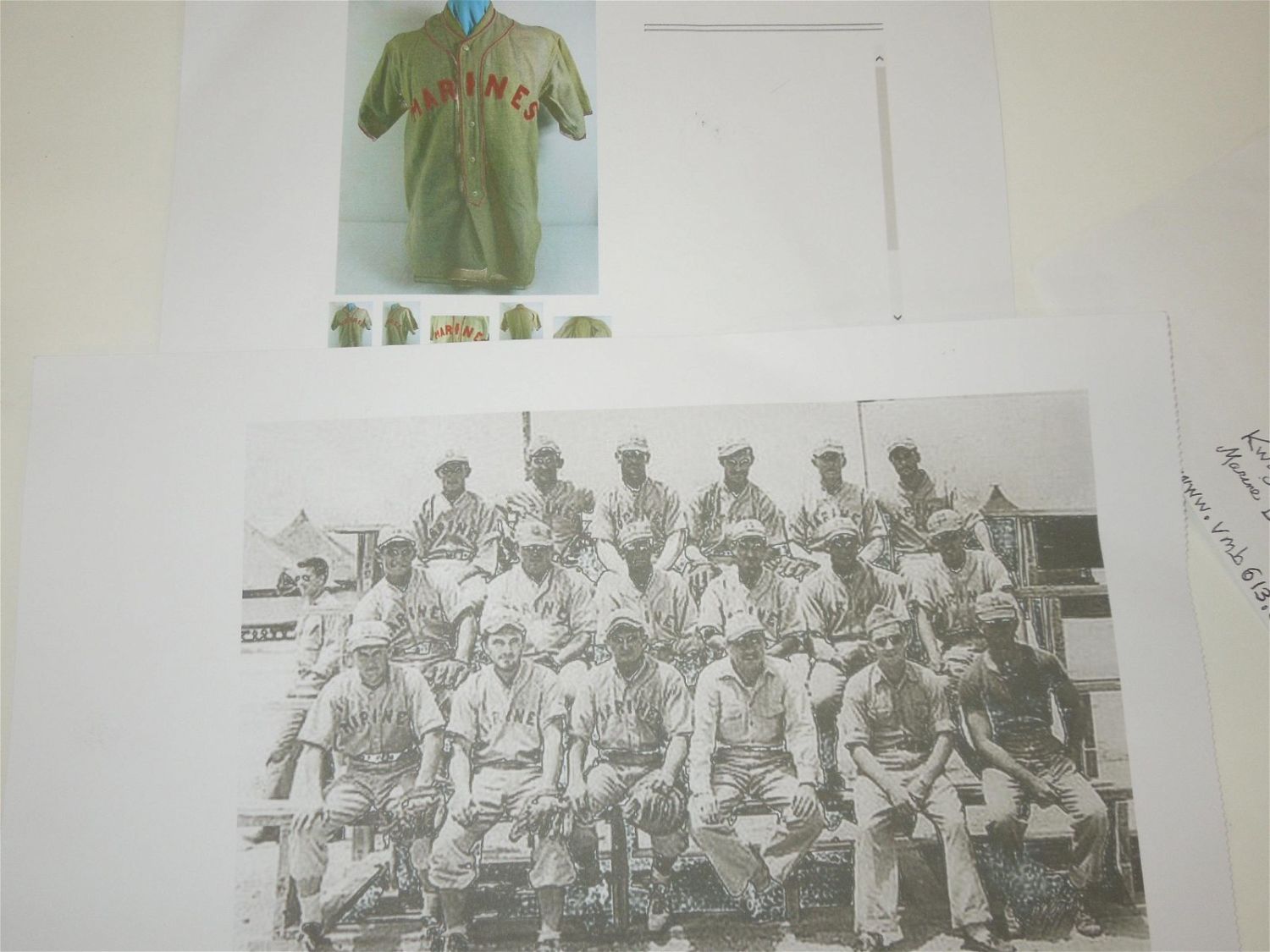Original WWII era US Marines Baseball Team jersey. Consignor notes that it is attributed to 1945 Kwajalein (Marine Bomb Squadron 613). Comes with copies of photos with similar uniforms. Good overall condition.