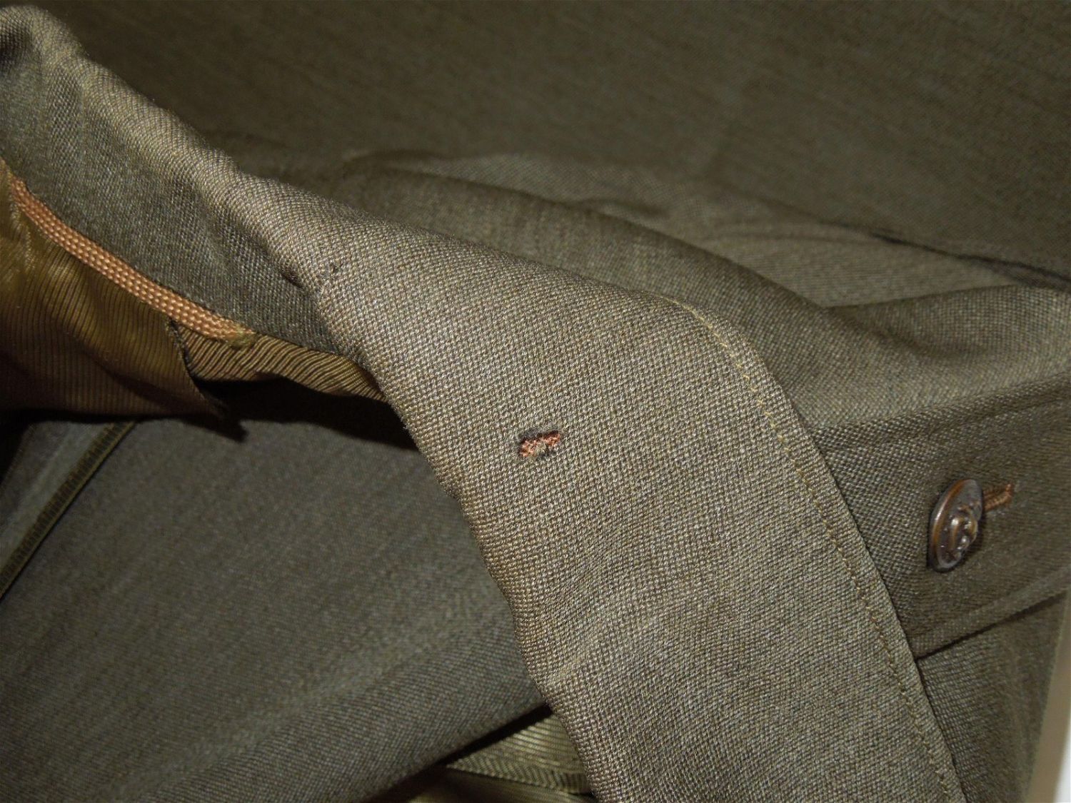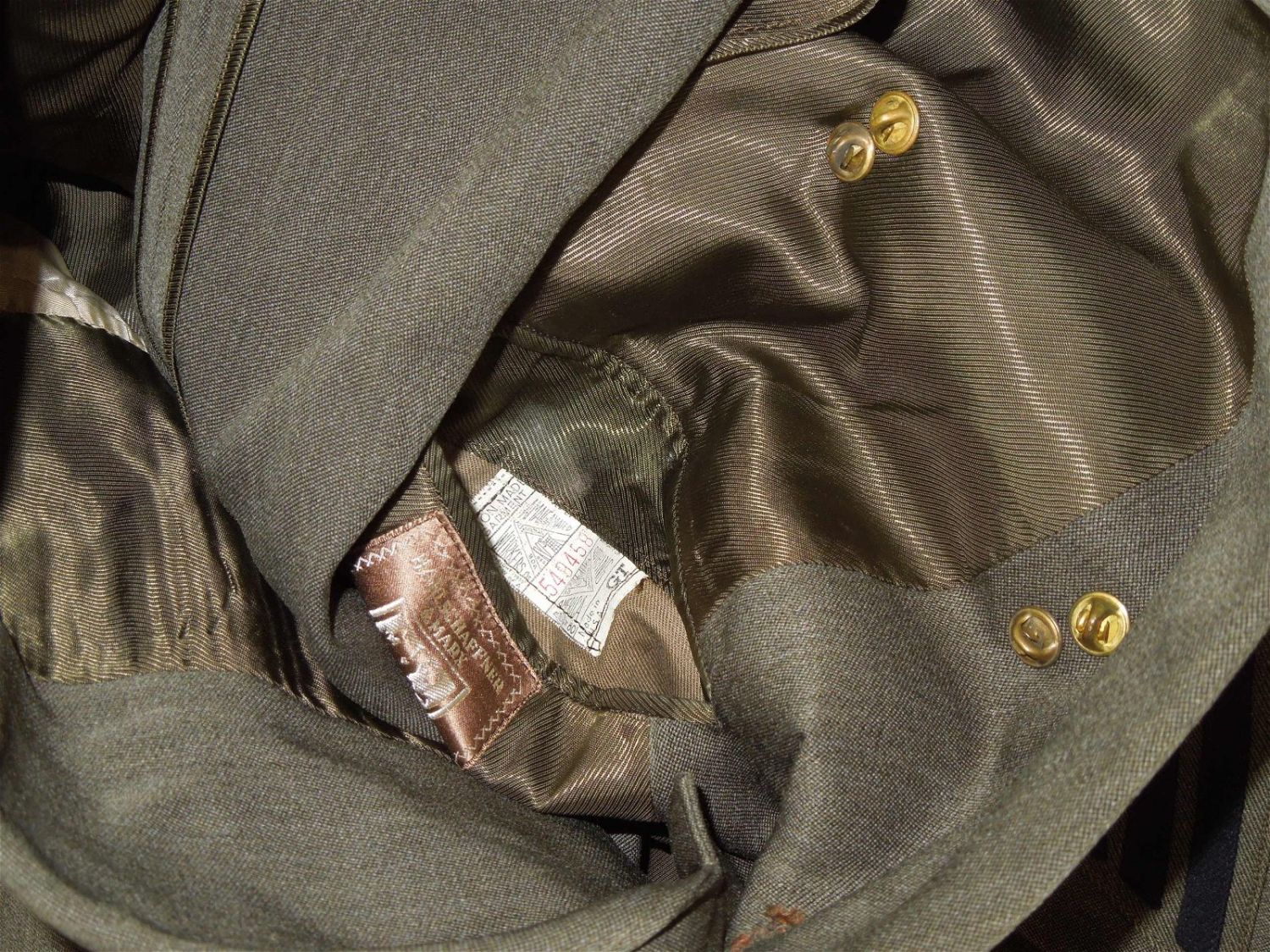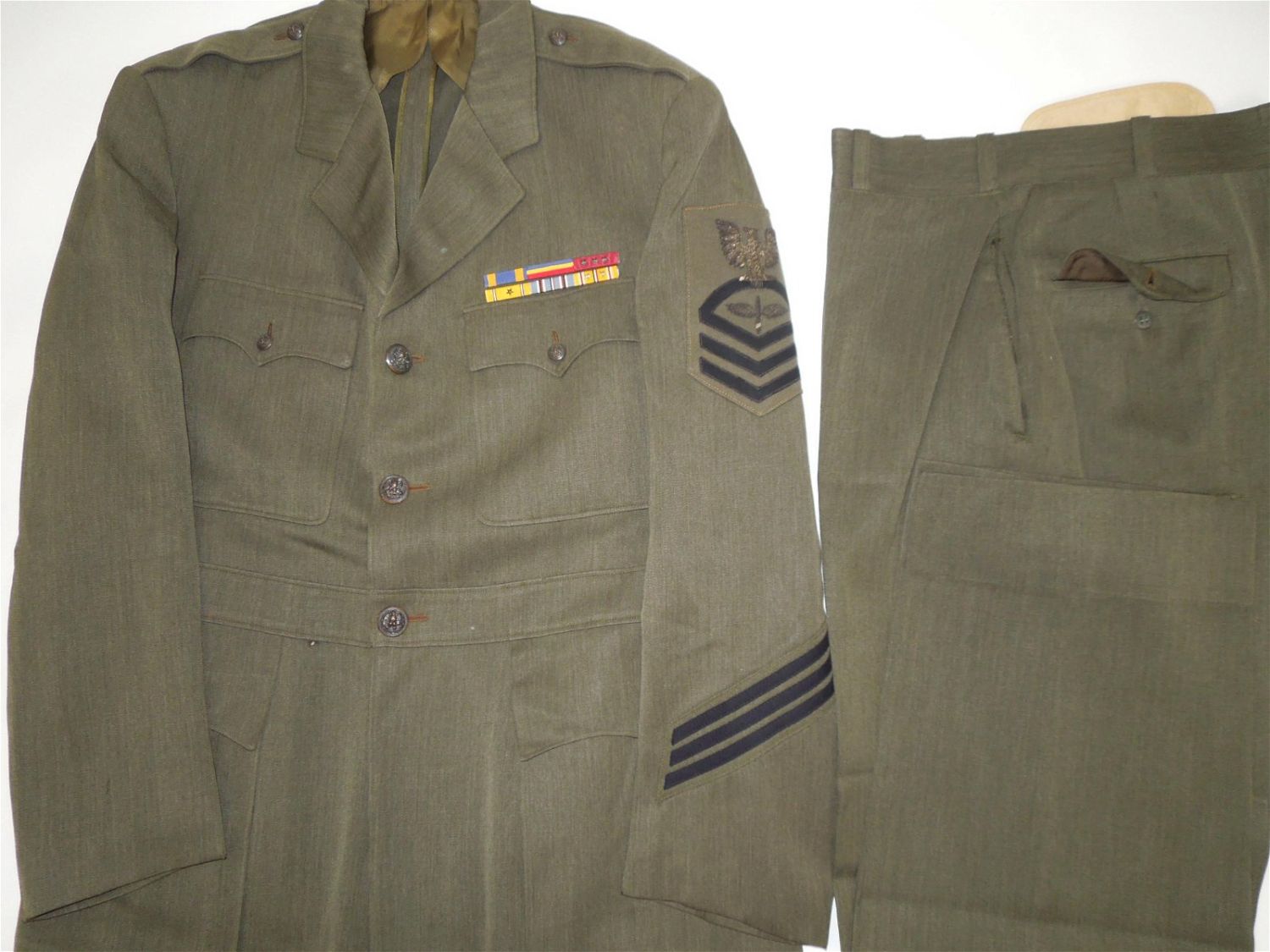 WWII veteran Aviation green uniform with bullion rate, ribbon bars, and pants. No name or ID, Good condition with a moth hole on the back of the collar.