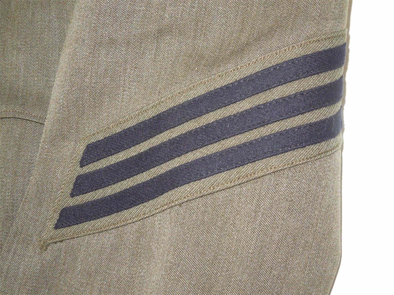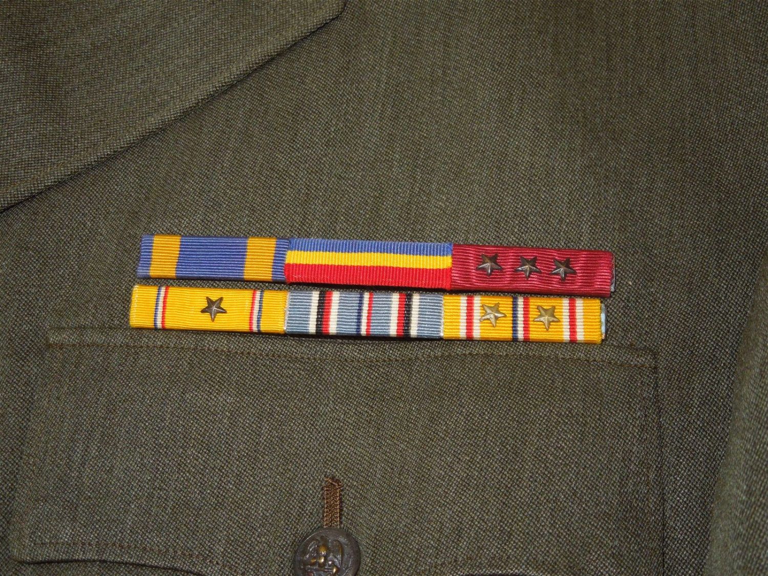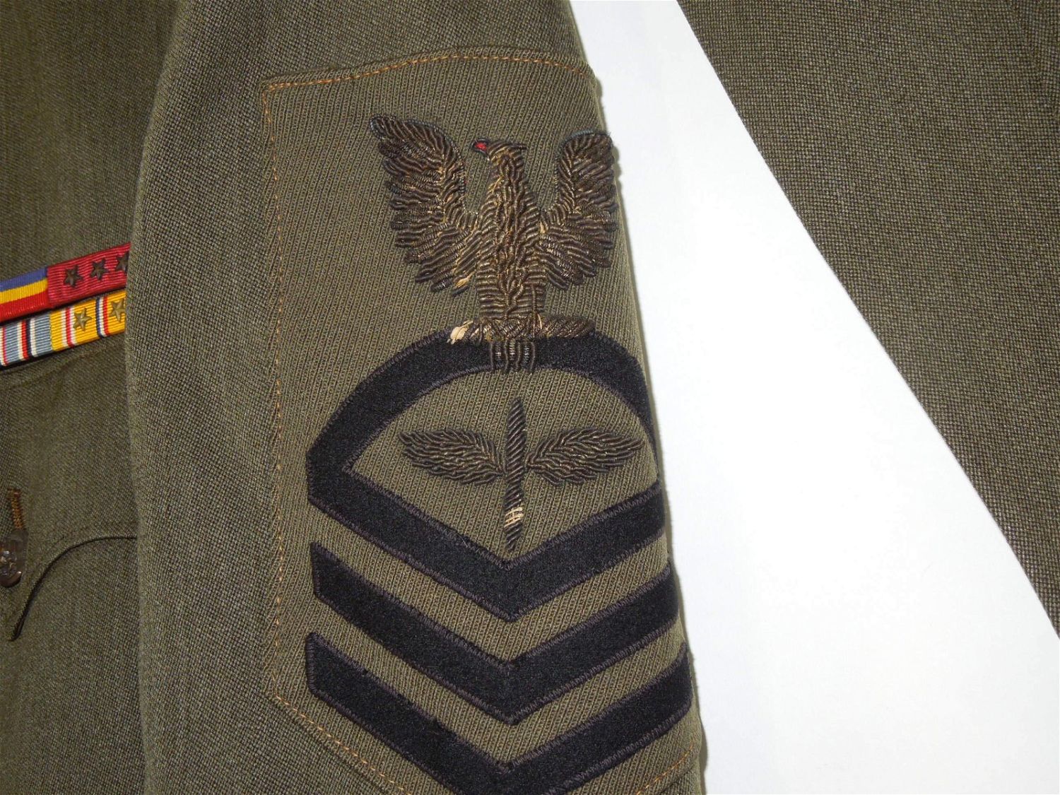 WWII veteran Aviation green uniform with bullion rate, ribbon bars, and pants. No name or ID, Good condition with a moth hole on the back of the collar.