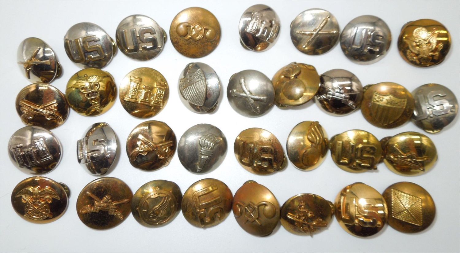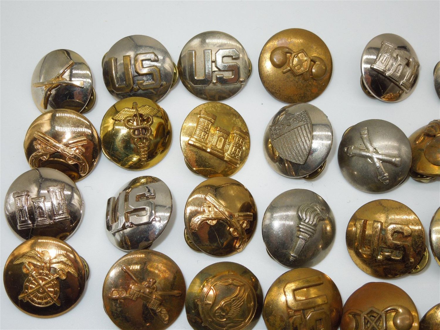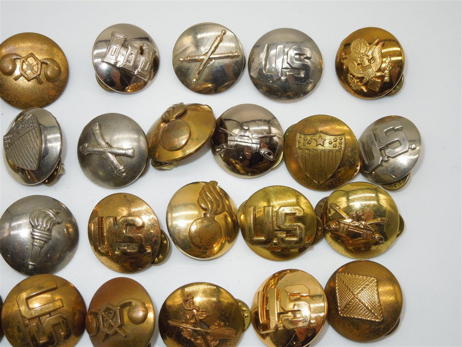 Lot of Korean War era US Army Domed Collar Discs from various branches. 33 Pieces total. Good condition.