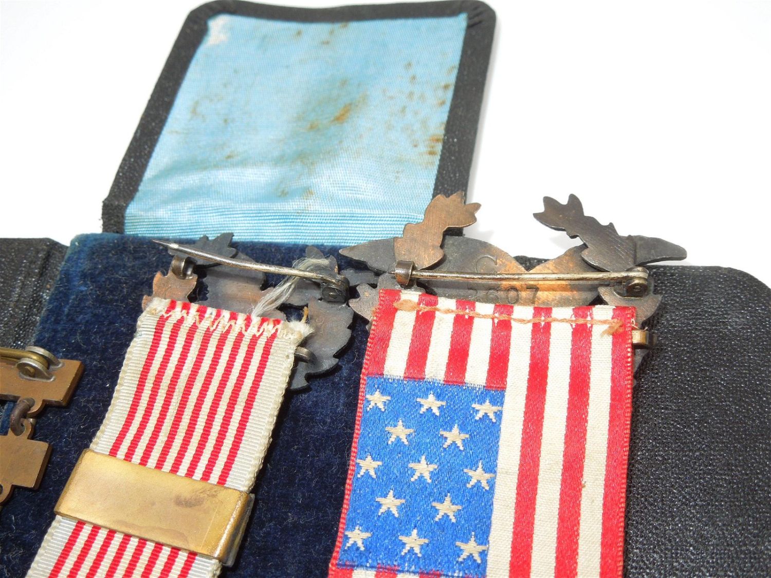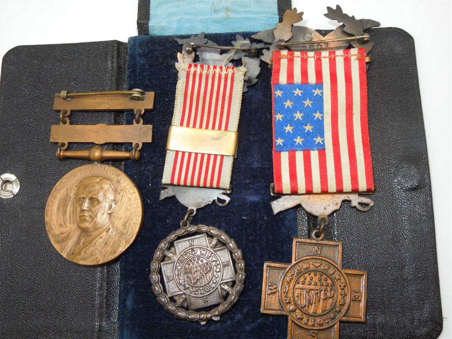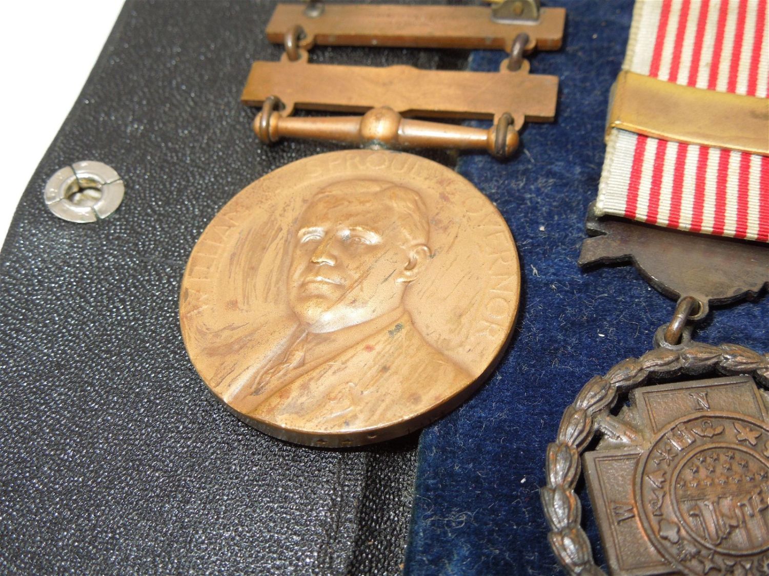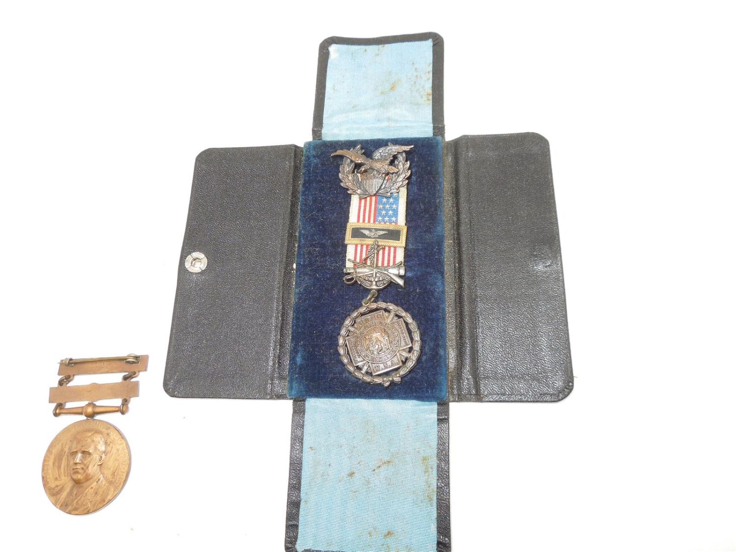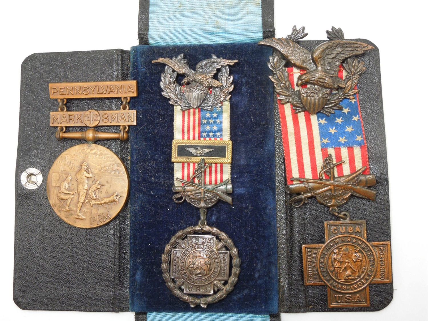 Lot of three Spanish American War US Veteran Medals- Pennsylvania Marksman medal (numbered), SAW Commanders medal in case, and numbered SAW medal. All are in good condition.