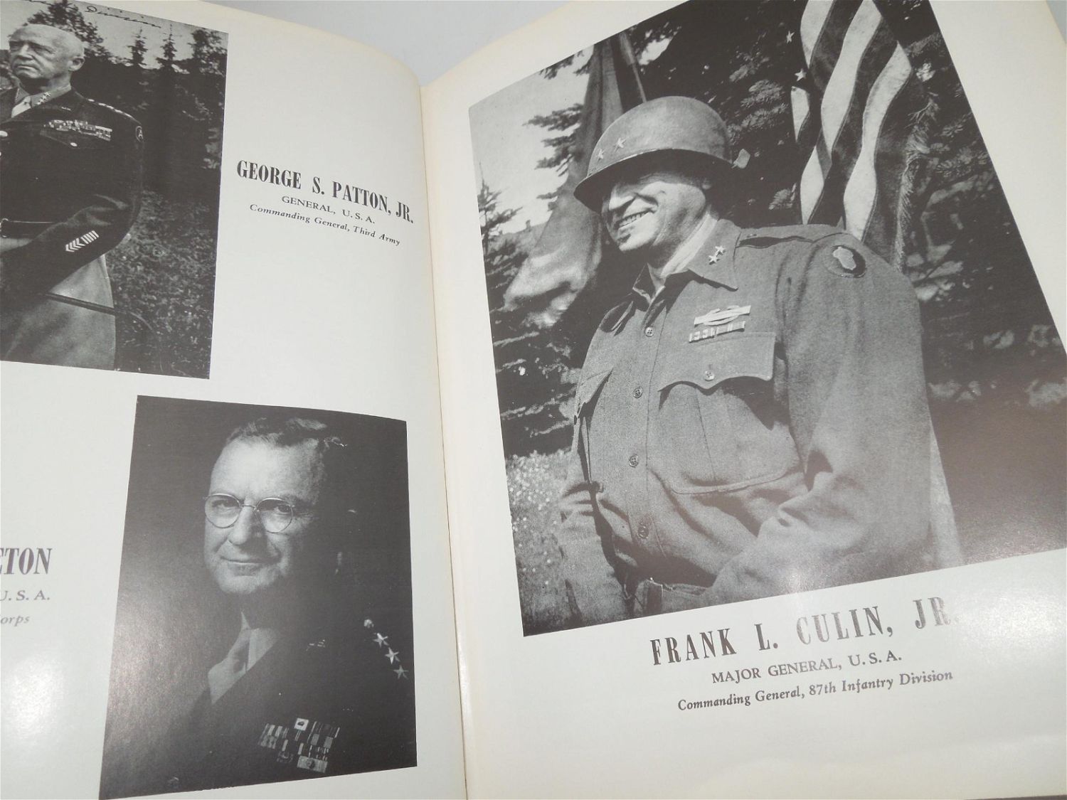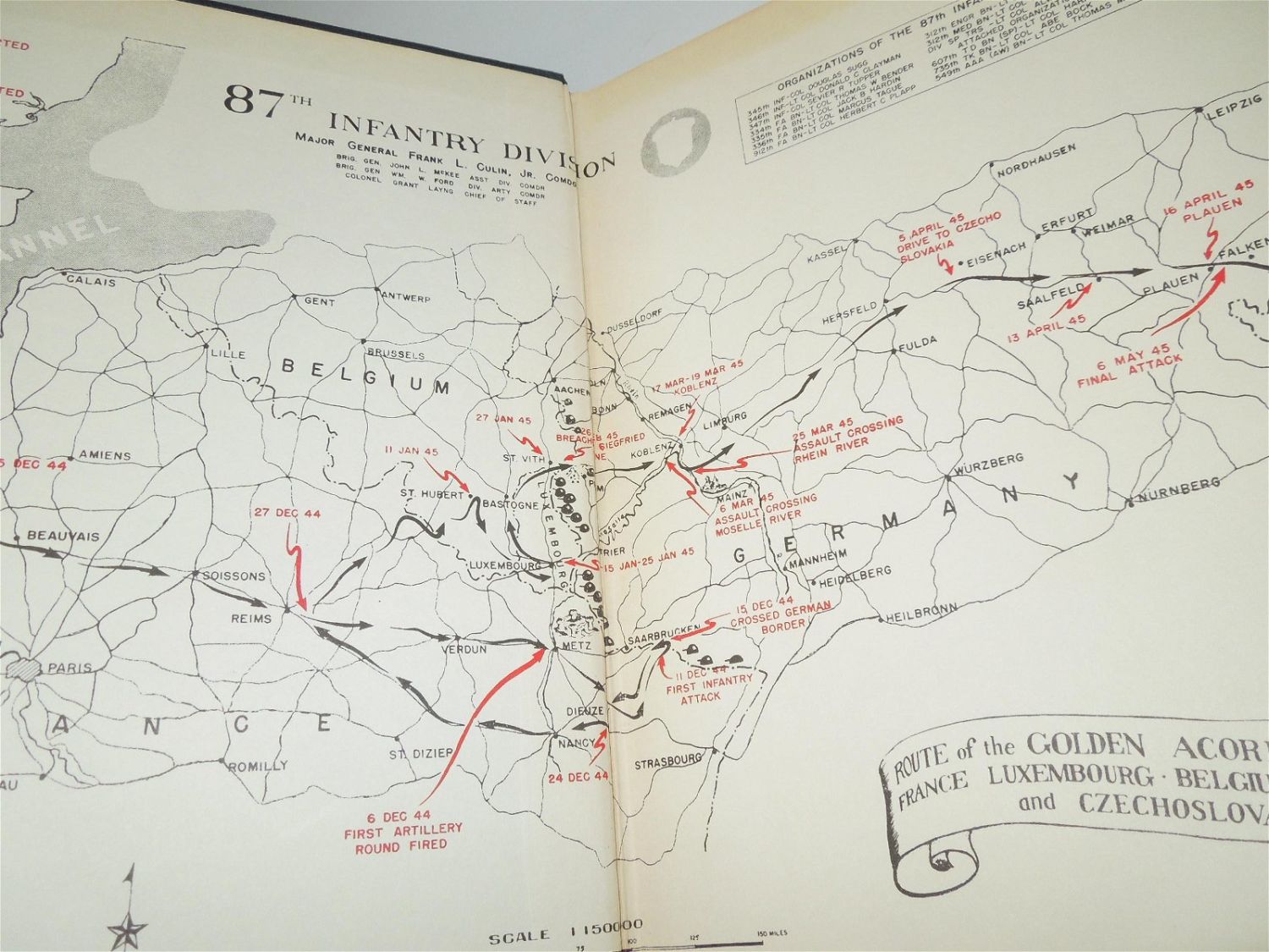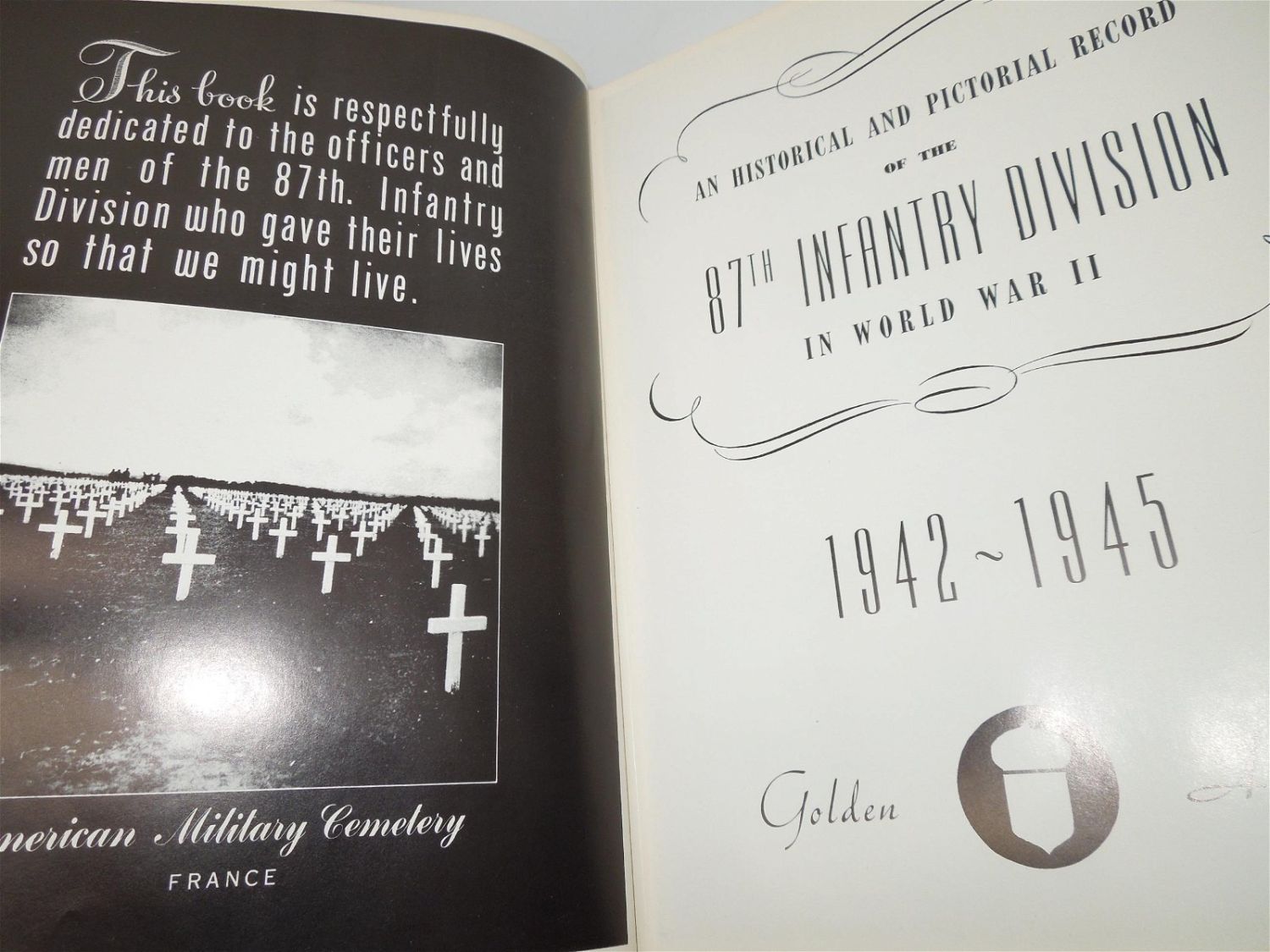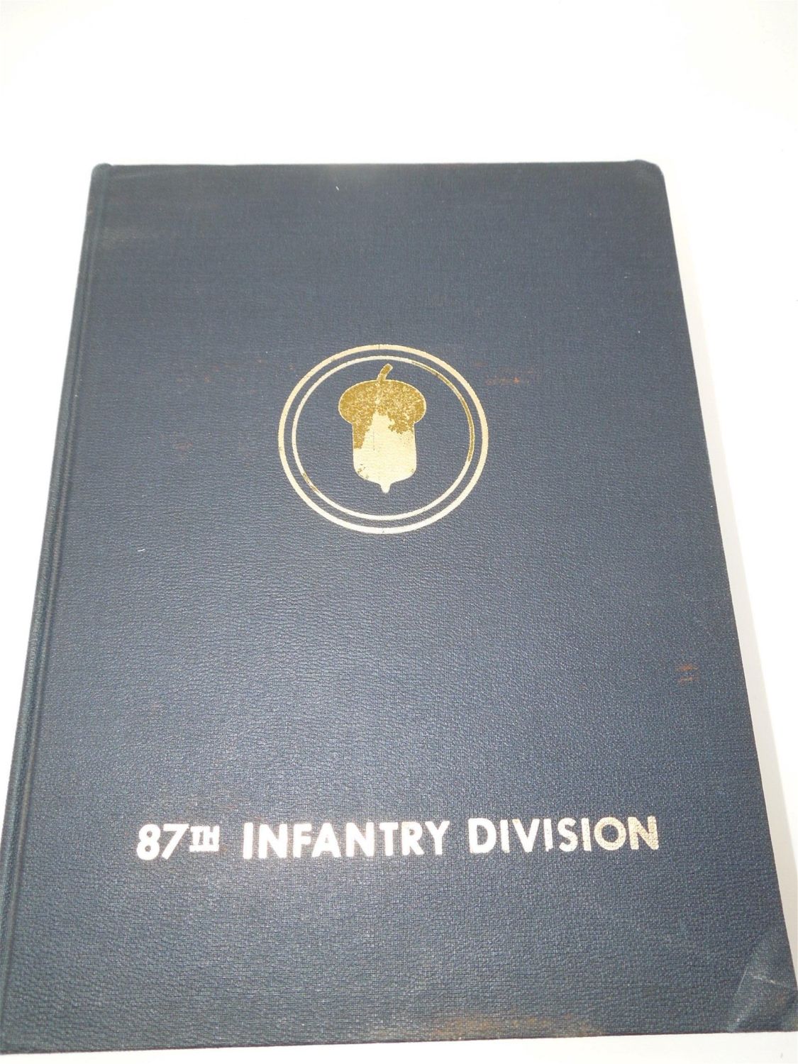 World War II hardback, "An Historical and Pictorial Record of The 87th Infantry Division in World War II, 1942-1945," 1946 publishing date in rear and appears to be a first edition. Hard to find history of the 87th Infantry Division in World War II, known as the Golden Acorn Division, with major battles and campaigns in the European theater against Germany in World War II. Includes history and a very large number of photos related to military action of the Division in World War II. A massive collection of 87th Division Regimental histories, including the 345th, 346th, 347th Infantry Regiments, 334th, 335th, 336th, and 912 Field Artillery Battalions, numerous other attached regiments. Contents include broad WWI and WWII divisional histories, detailed regimental narratives, hundreds of photographs, illustrations and maps, captioned portraits of all included members, rosters, awards and decorations pages, statistical data, a large fold-out map at center, etc. Blue cloth hardback with gilt decorations and lettering on front, book has about 900 pages and numbered in sections only. Size is 9 x 12 inches and in very good condition with minimal wear.