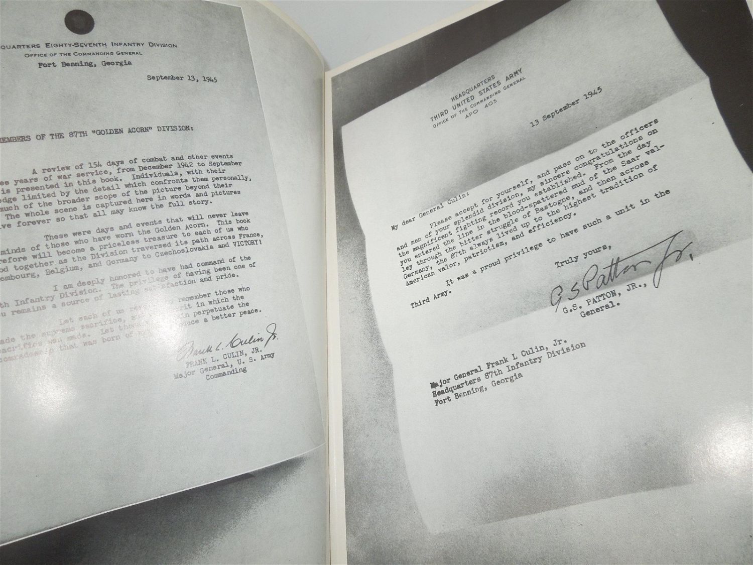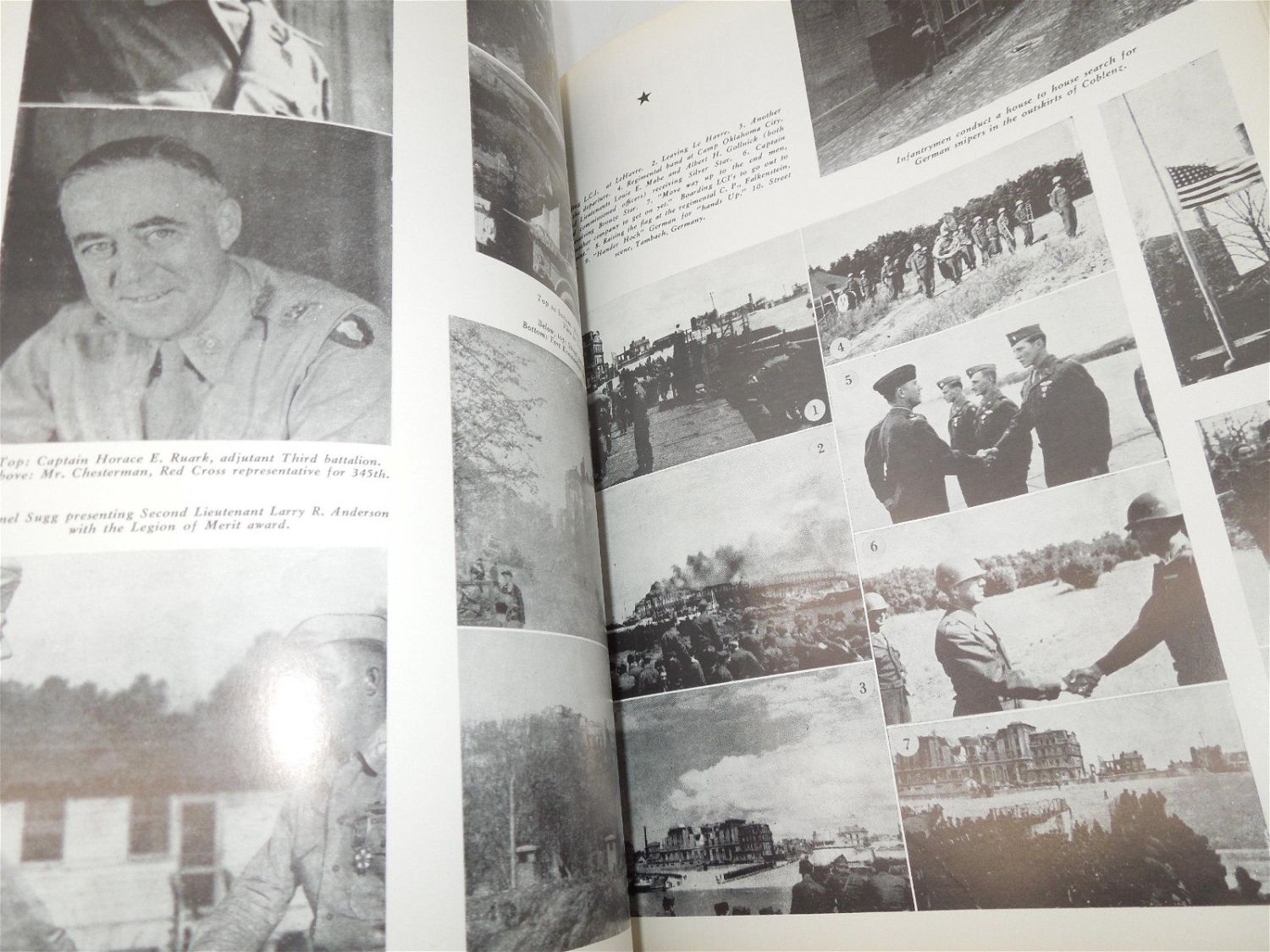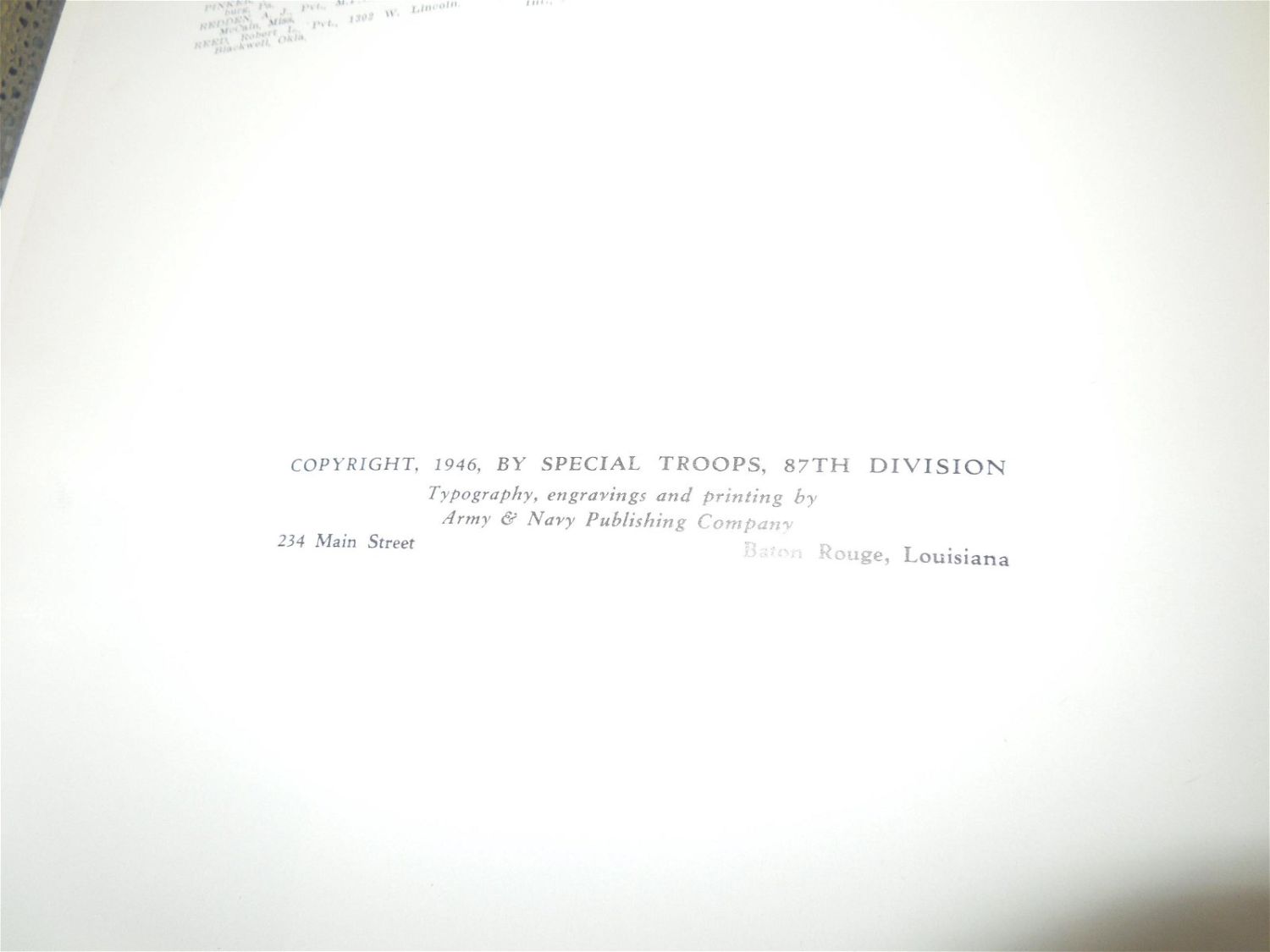World War II hardback, "An Historical and Pictorial Record of The 87th Infantry Division in World War II, 1942-1945," 1946 publishing date in rear and appears to be a first edition. Hard to find history of the 87th Infantry Division in World War II, known as the Golden Acorn Division, with major battles and campaigns in the European theater against Germany in World War II. Includes history and a very large number of photos related to military action of the Division in World War II. A massive collection of 87th Division Regimental histories, including the 345th, 346th, 347th Infantry Regiments, 334th, 335th, 336th, and 912 Field Artillery Battalions, numerous other attached regiments. Contents include broad WWI and WWII divisional histories, detailed regimental narratives, hundreds of photographs, illustrations and maps, captioned portraits of all included members, rosters, awards and decorations pages, statistical data, a large fold-out map at center, etc. Blue cloth hardback with gilt decorations and lettering on front, book has about 900 pages and numbered in sections only. Size is 9 x 12 inches and in very good condition with minimal wear.