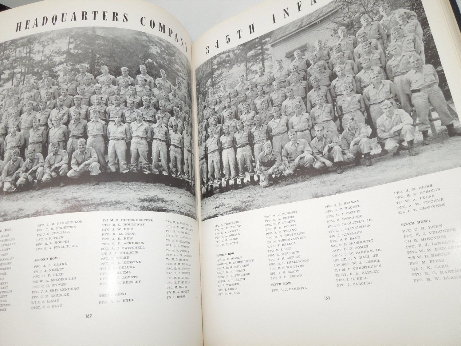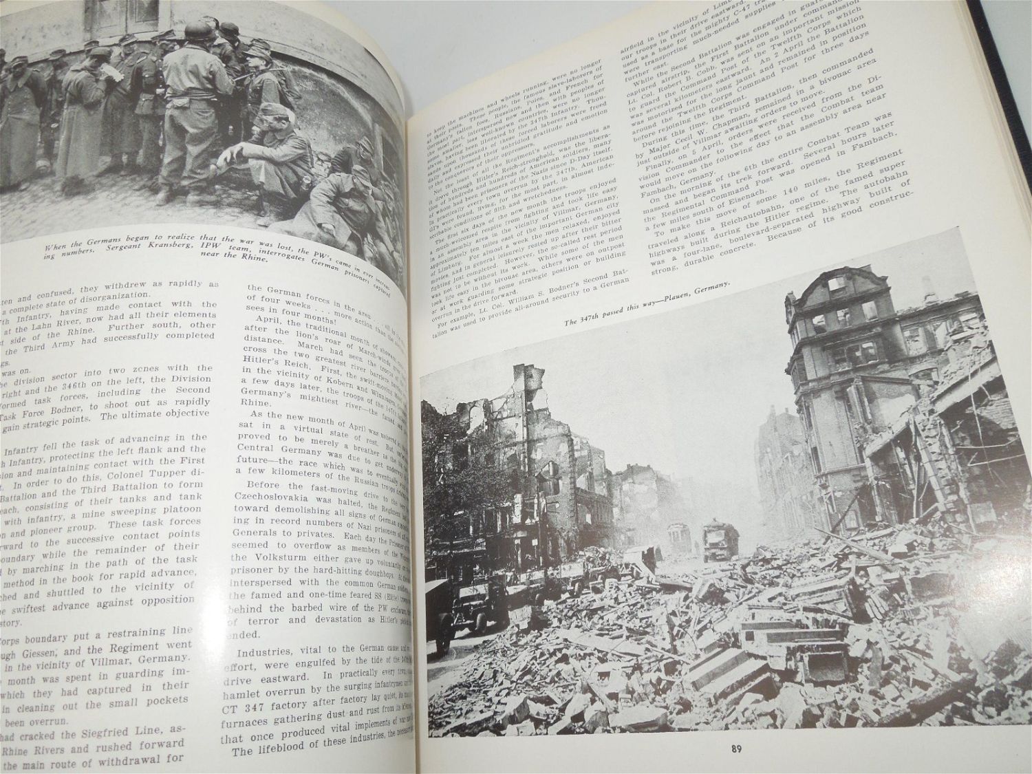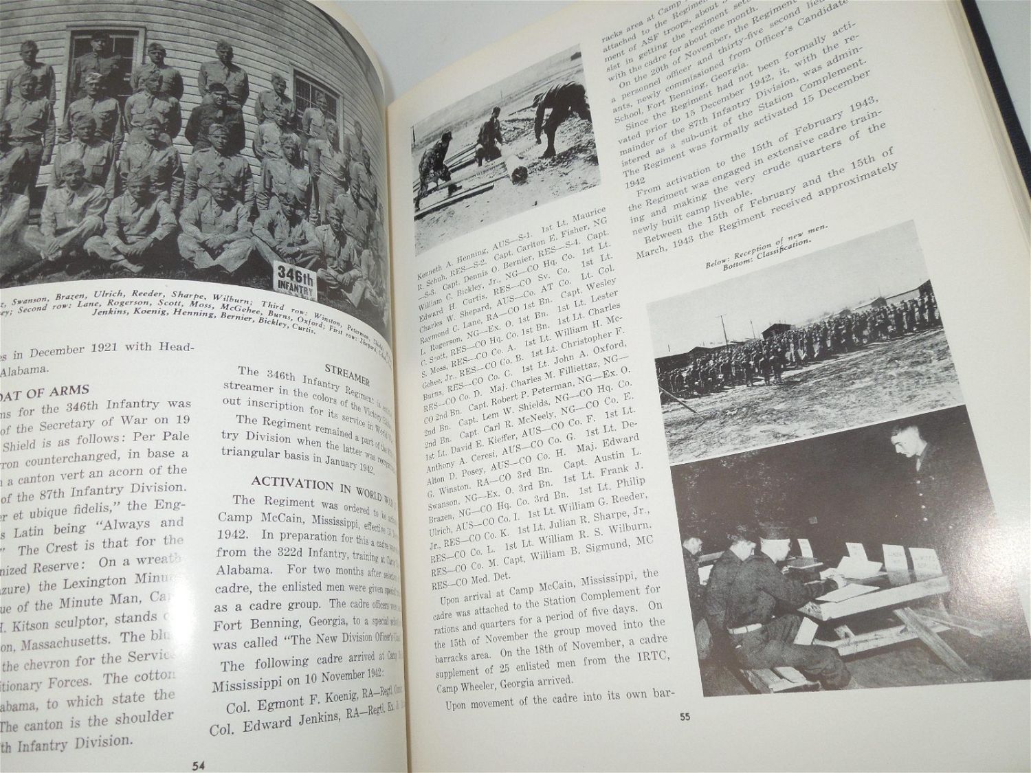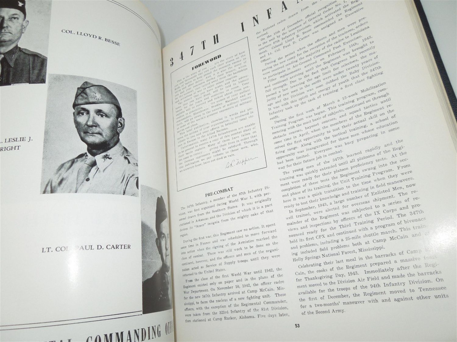 World War II hardback, "An Historical and Pictorial Record of The 87th Infantry Division in World War II, 1942-1945," 1946 publishing date in rear and appears to be a first edition. Hard to find history of the 87th Infantry Division in World War II, known as the Golden Acorn Division, with major battles and campaigns in the European theater against Germany in World War II. Includes history and a very large number of photos related to military action of the Division in World War II. A massive collection of 87th Division Regimental histories, including the 345th, 346th, 347th Infantry Regiments, 334th, 335th, 336th, and 912 Field Artillery Battalions, numerous other attached regiments. Contents include broad WWI and WWII divisional histories, detailed regimental narratives, hundreds of photographs, illustrations and maps, captioned portraits of all included members, rosters, awards and decorations pages, statistical data, a large fold-out map at center, etc. Blue cloth hardback with gilt decorations and lettering on front, book has about 900 pages and numbered in sections only. Size is 9 x 12 inches and in very good condition with minimal wear.